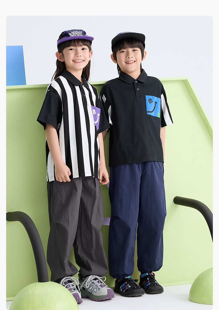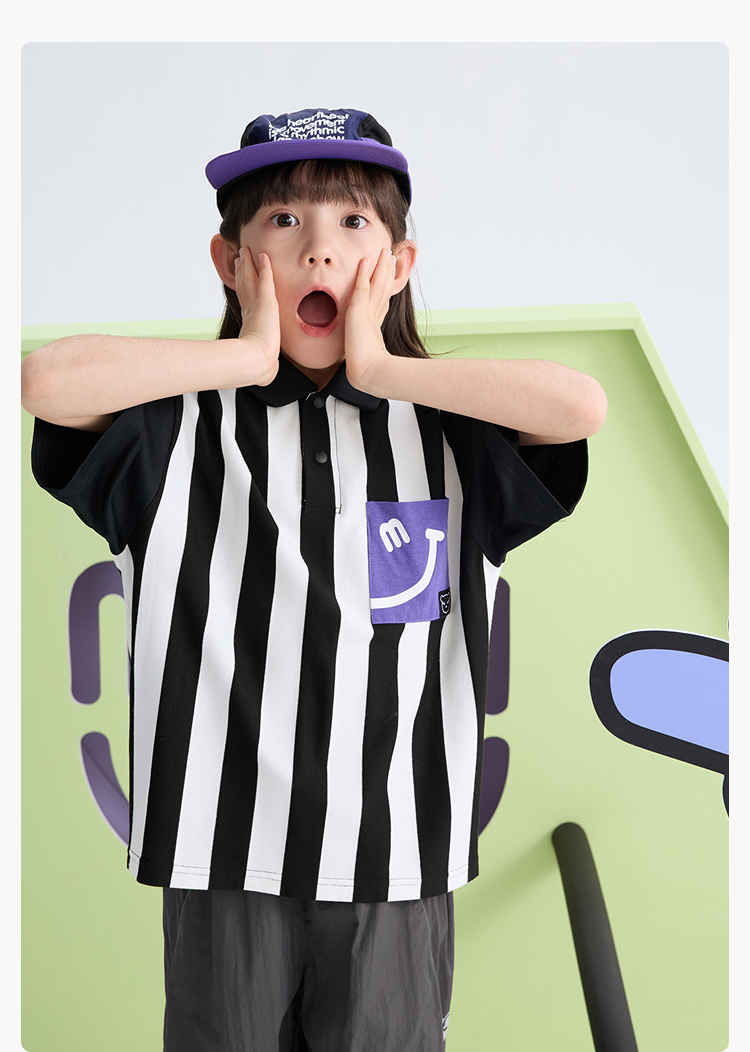 漫画家【笑脸POLO】儿童T恤夏笑脸口袋条纹拼接POLO衫男