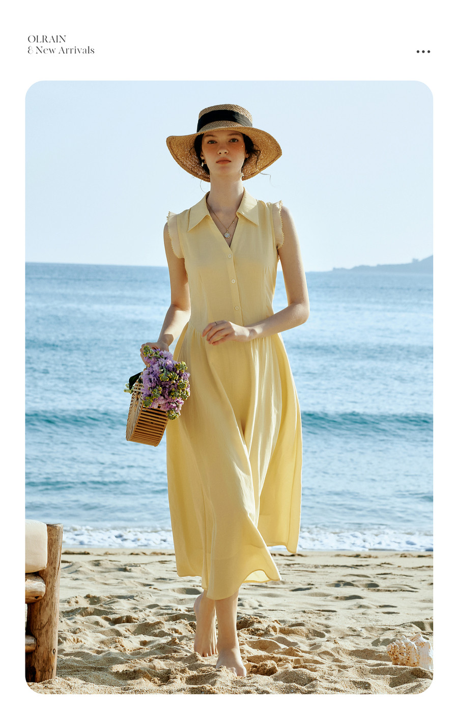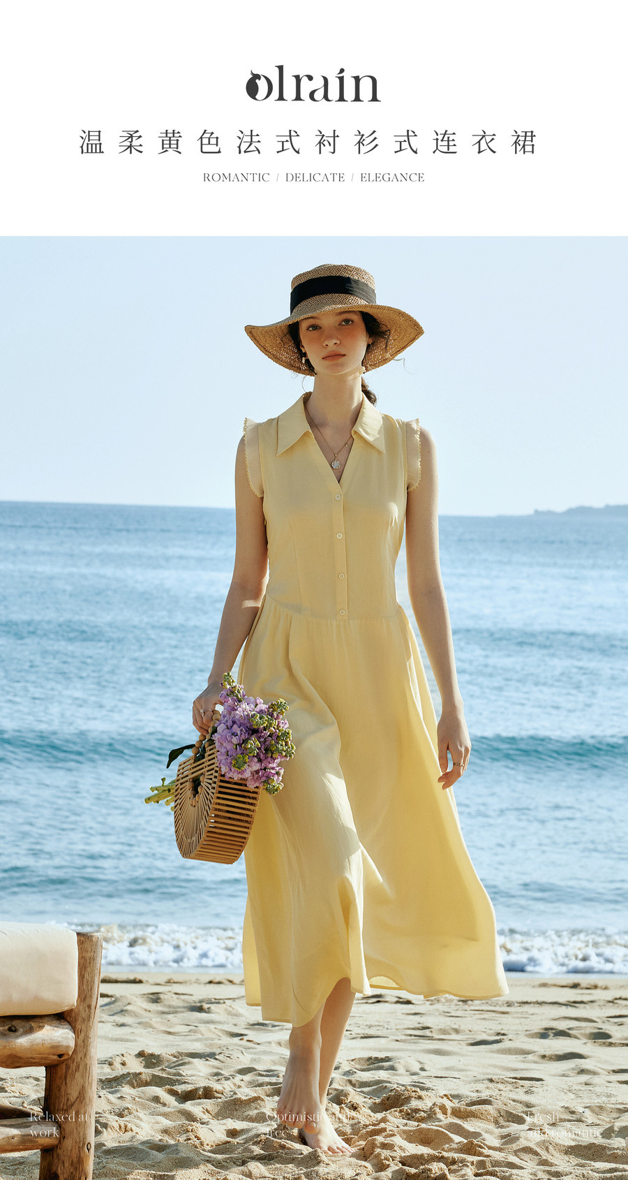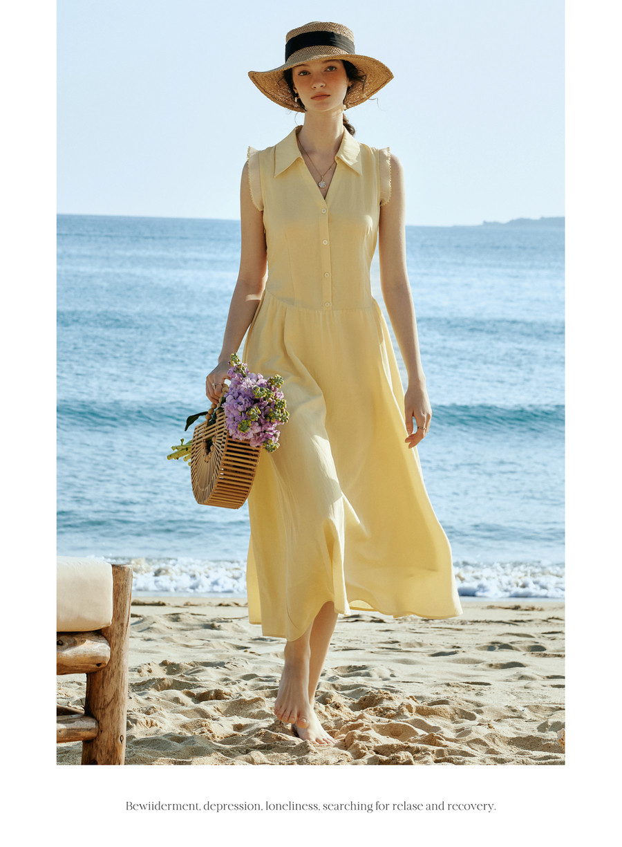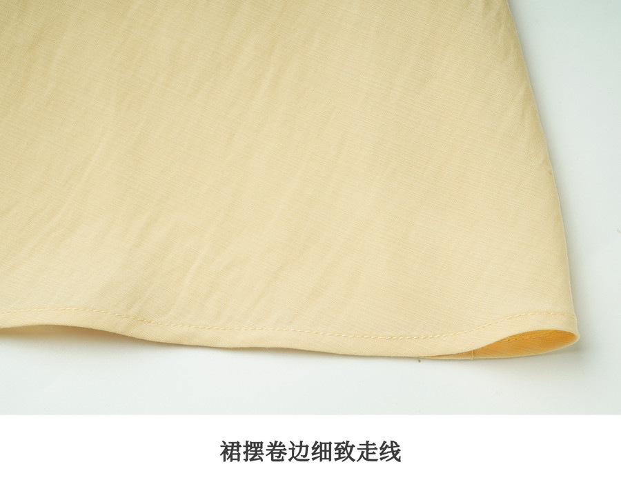 OLrain欧芮儿2026新款女夏季温柔黄色法式衬衫式V领花边袖连衣裙