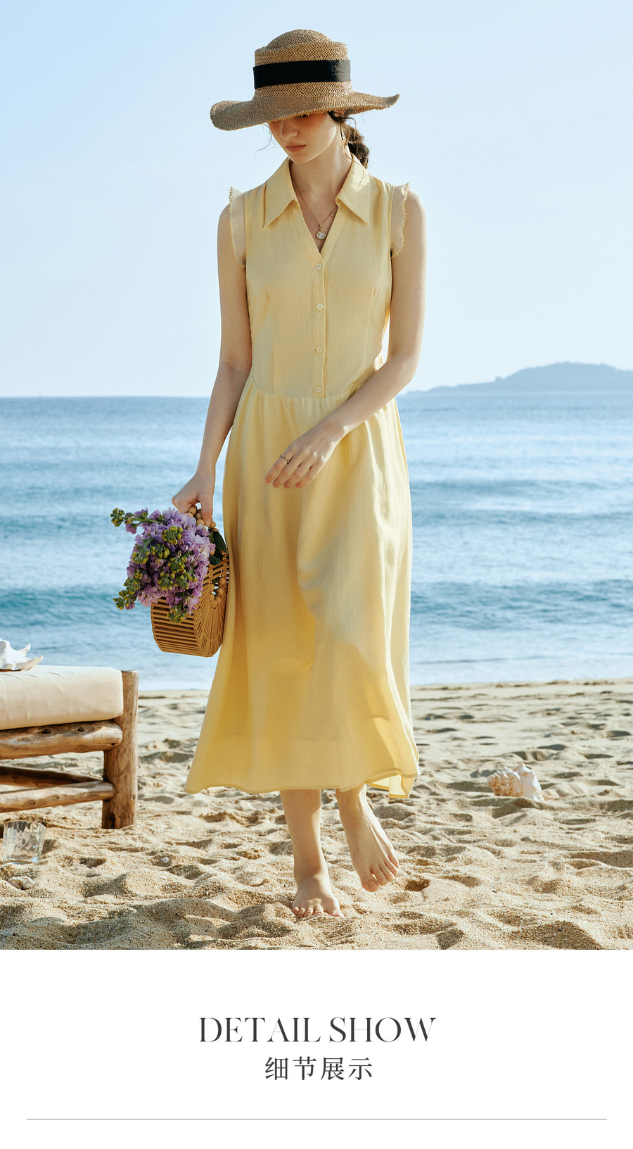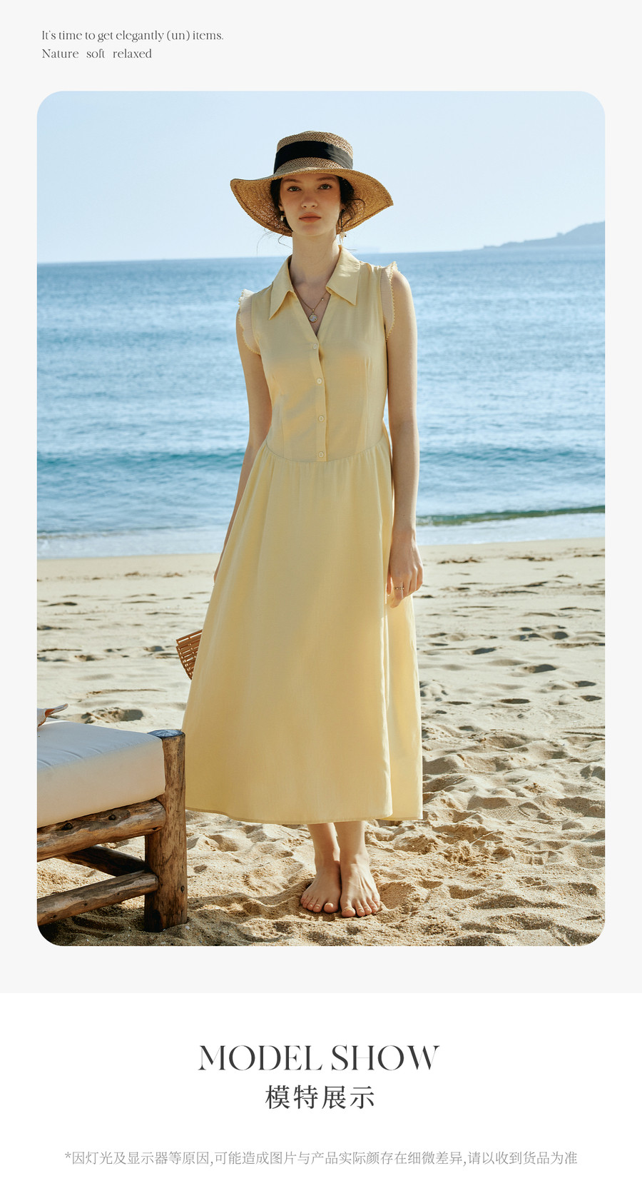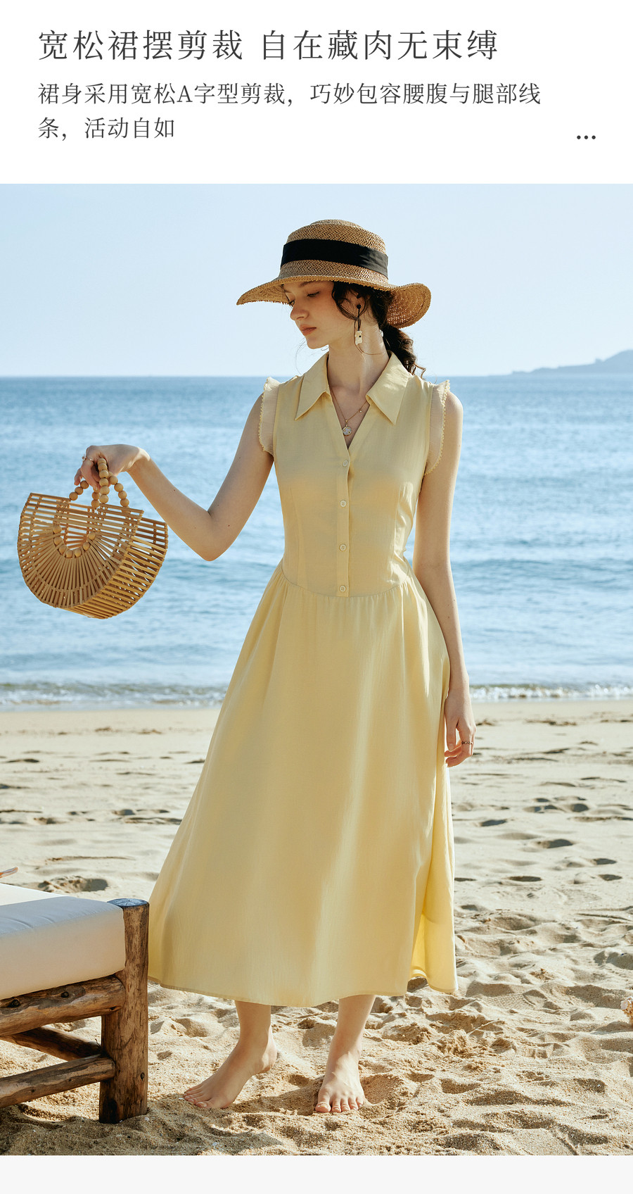 OLrain欧芮儿2026新款女夏季温柔黄色法式衬衫式V领花边袖连衣裙