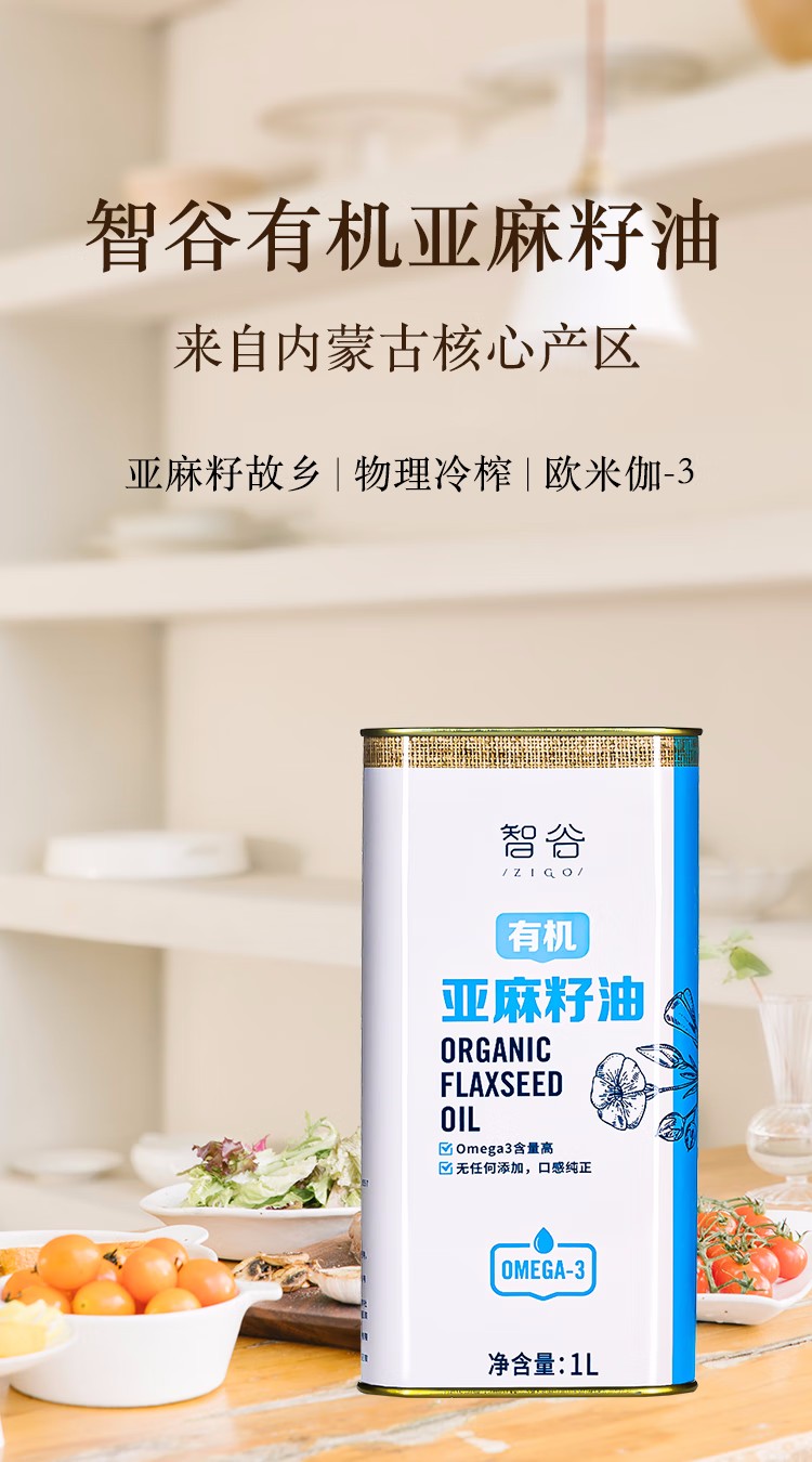 智谷有机亚麻籽油0添加物理冷榨胡麻油头道初榨植物油孕妇月子油1L罐装