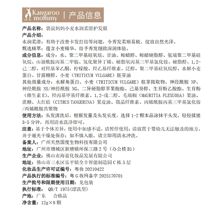 【小麦护发膜】 护发新解法 3分钟柔顺韧 袋鼠妈妈小麦水润柔滑护发膜-12gx8颗