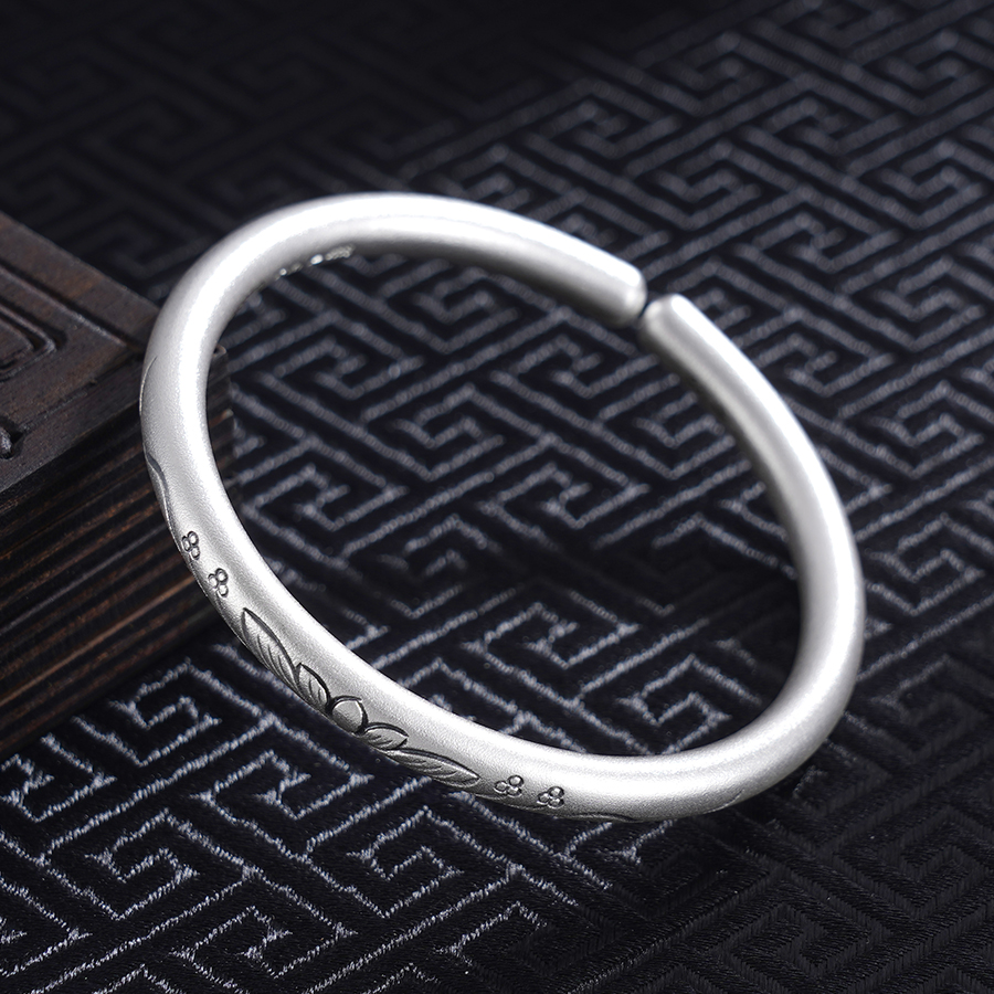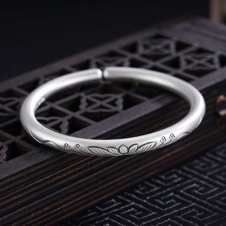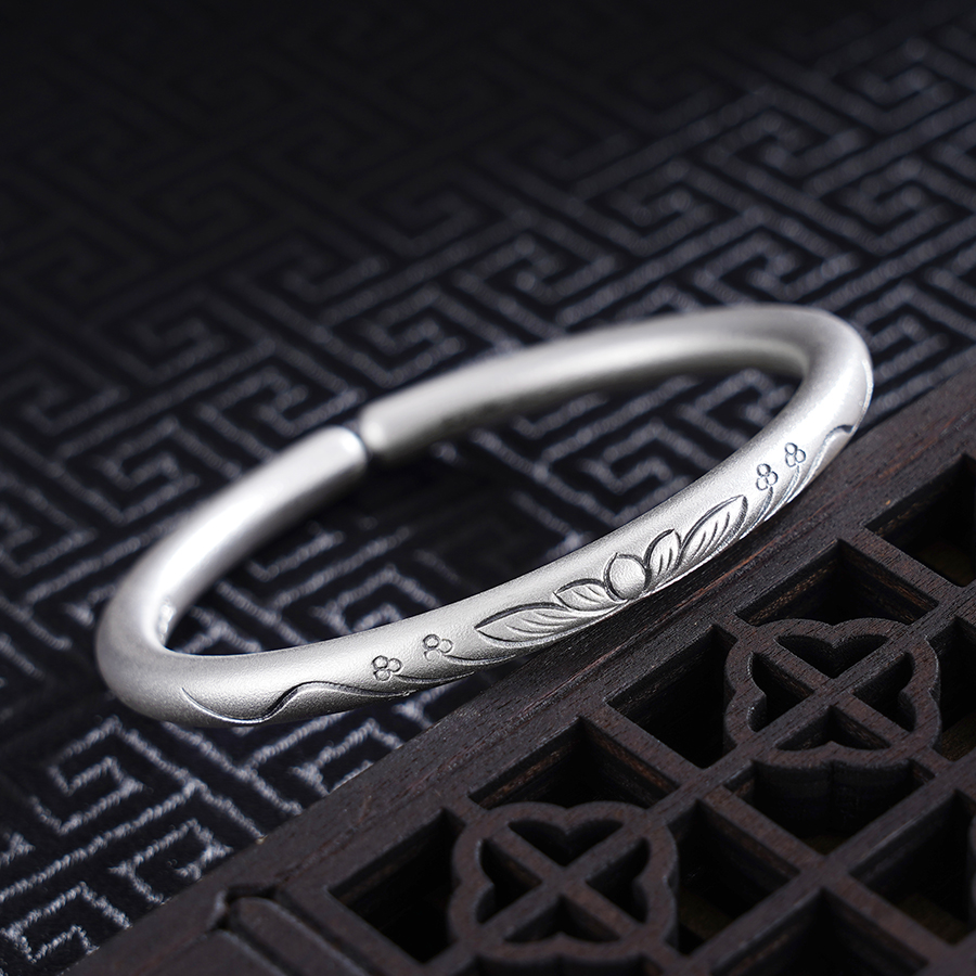 【寓意】:纯银开口手镯,镯面錾刻莲花图案,搭配流水纹样,恰似情意绵绵,寓意莲开见喜,情深绵长。