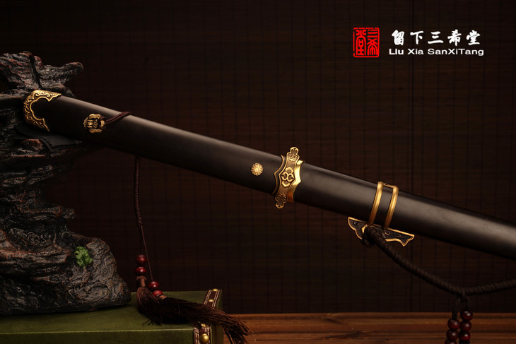 经典款唐刀样式,自炼花纹钢经过手工研磨,刃面细腻发亮。黄铜装具,配外装一体上等乌木鞘柄,手工打磨