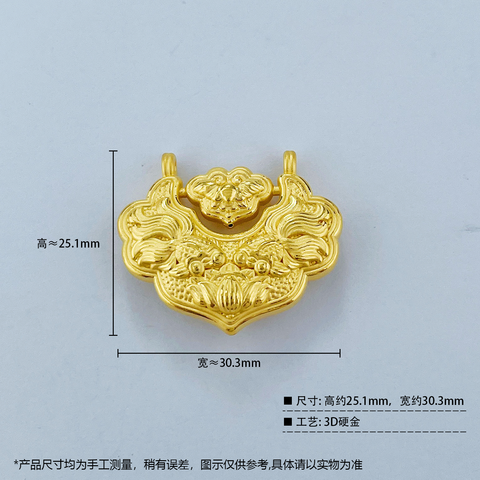 【限时克减150元】足金 #儿童/宝宝 【精品】3D硬金双面连年有余双鱼锦鲤锁包莲花平安如意锁包空心吊坠(固定无转动)(V3DDZ00088-1)(预售产品下单后不退款不退货不换货不补差价)