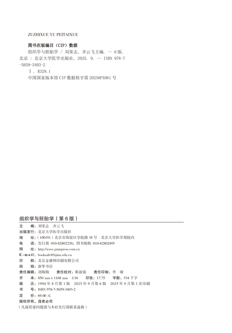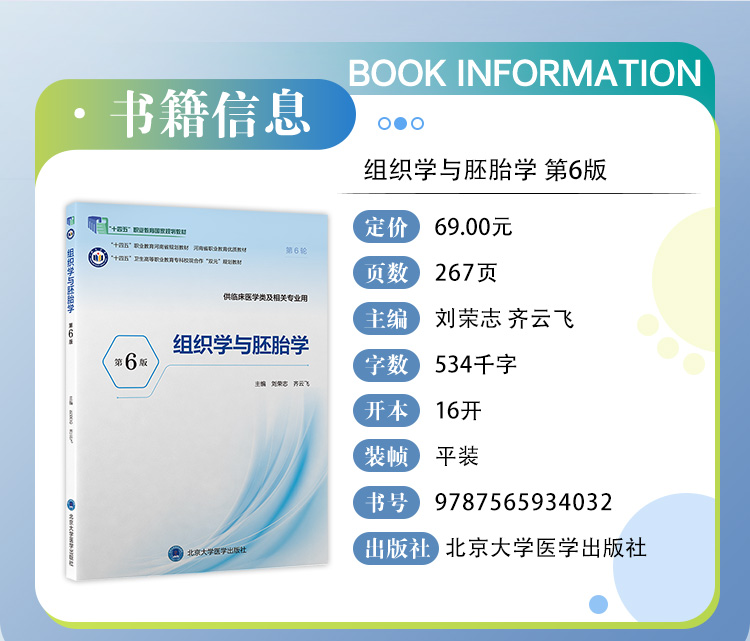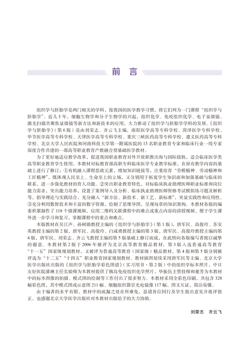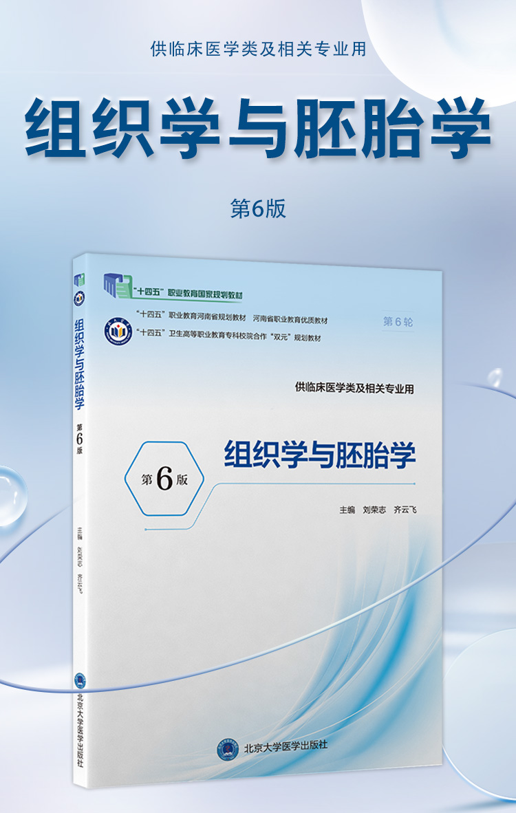 组织学与胚胎学 第6六版 第六轮高职临床教材 十四五卫生高等职业教育专科校院合作双元规划教材 刘荣志 齐云飞北京大学医学出版社