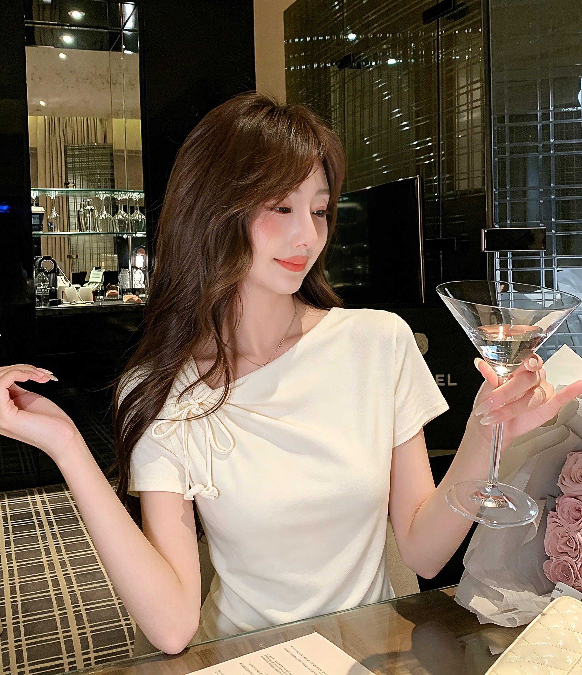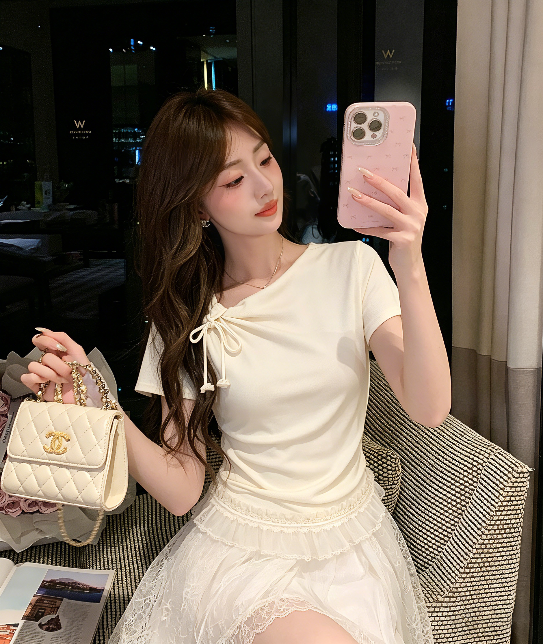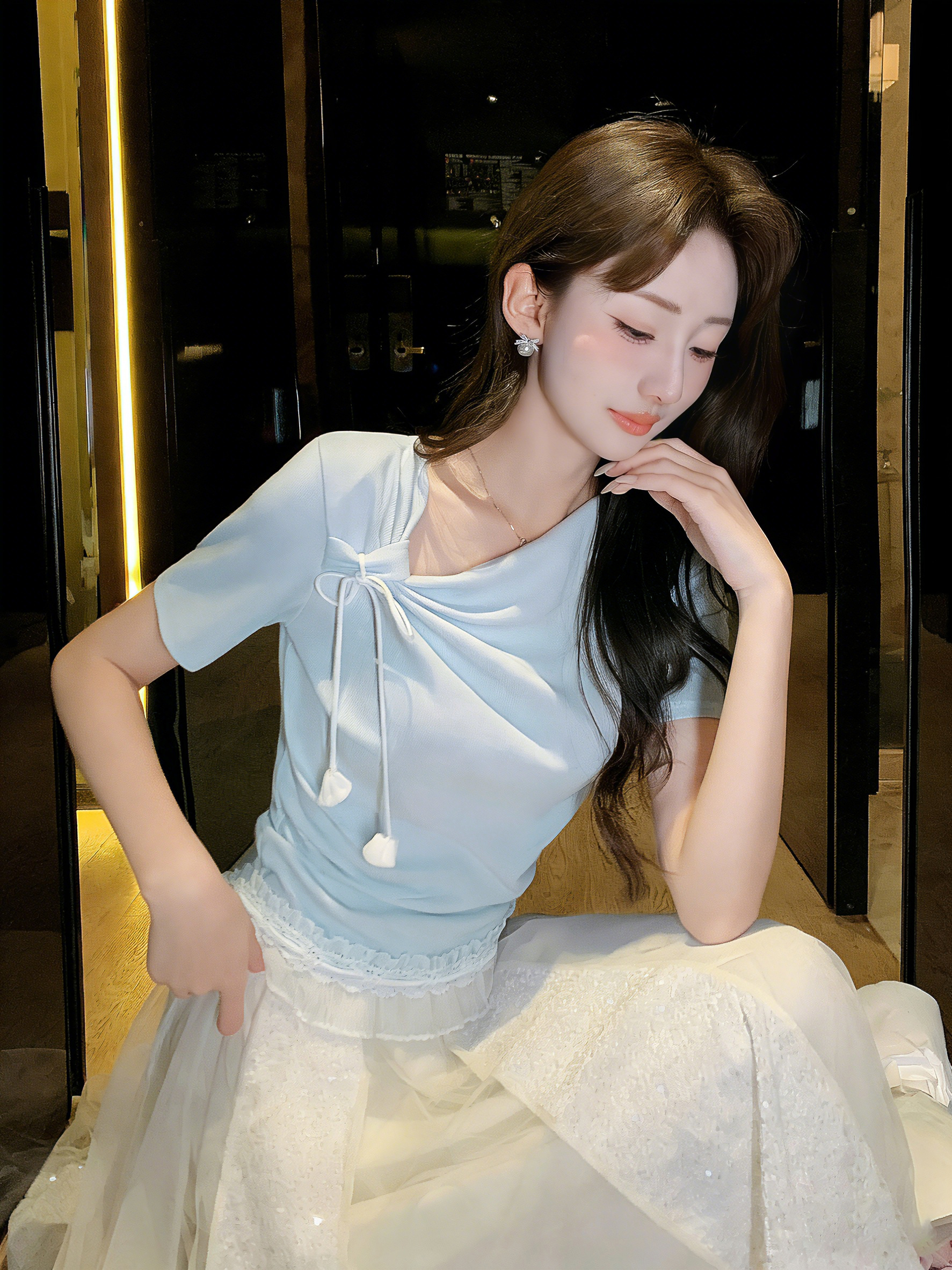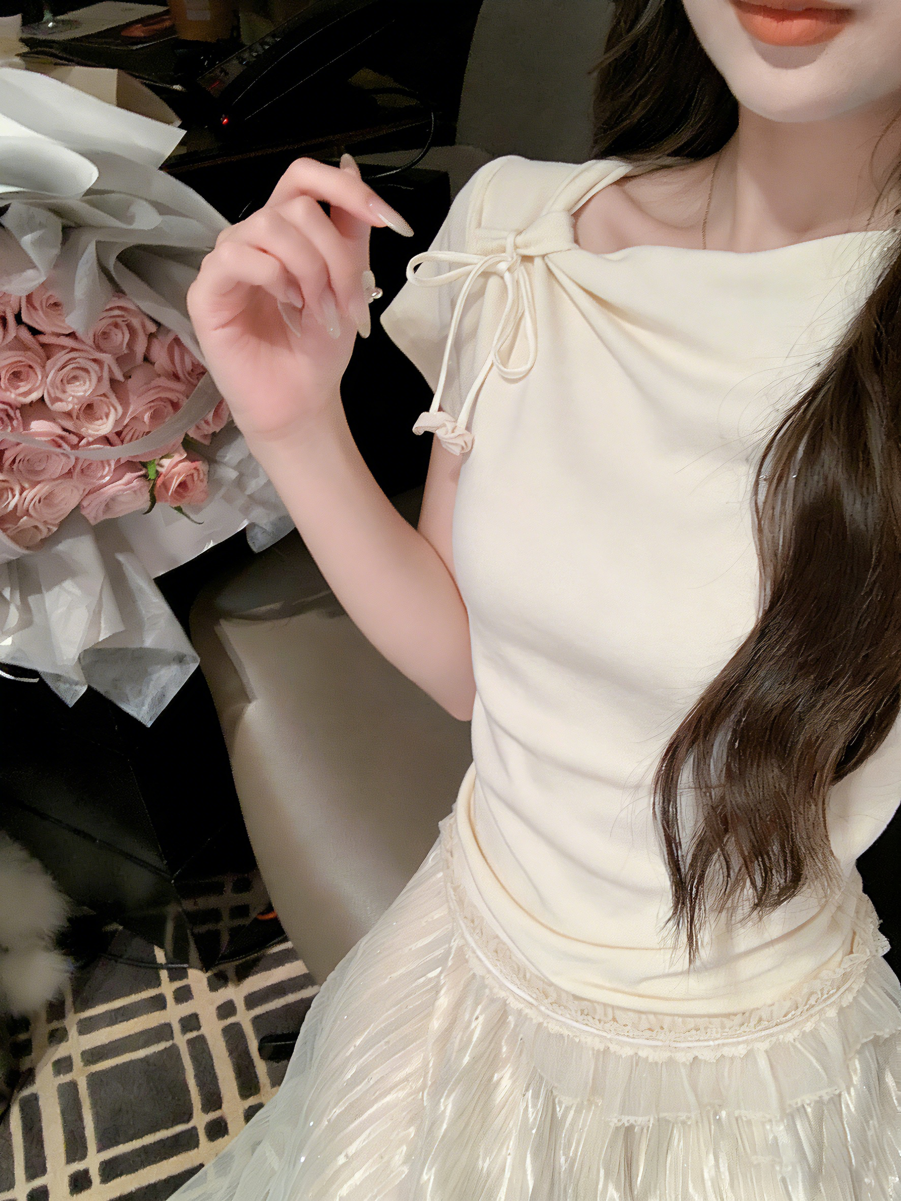 张心子【一见倾心】设计感温柔法式打结上衣女长袖夏季新款打底衫 U2603045