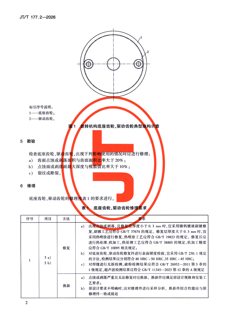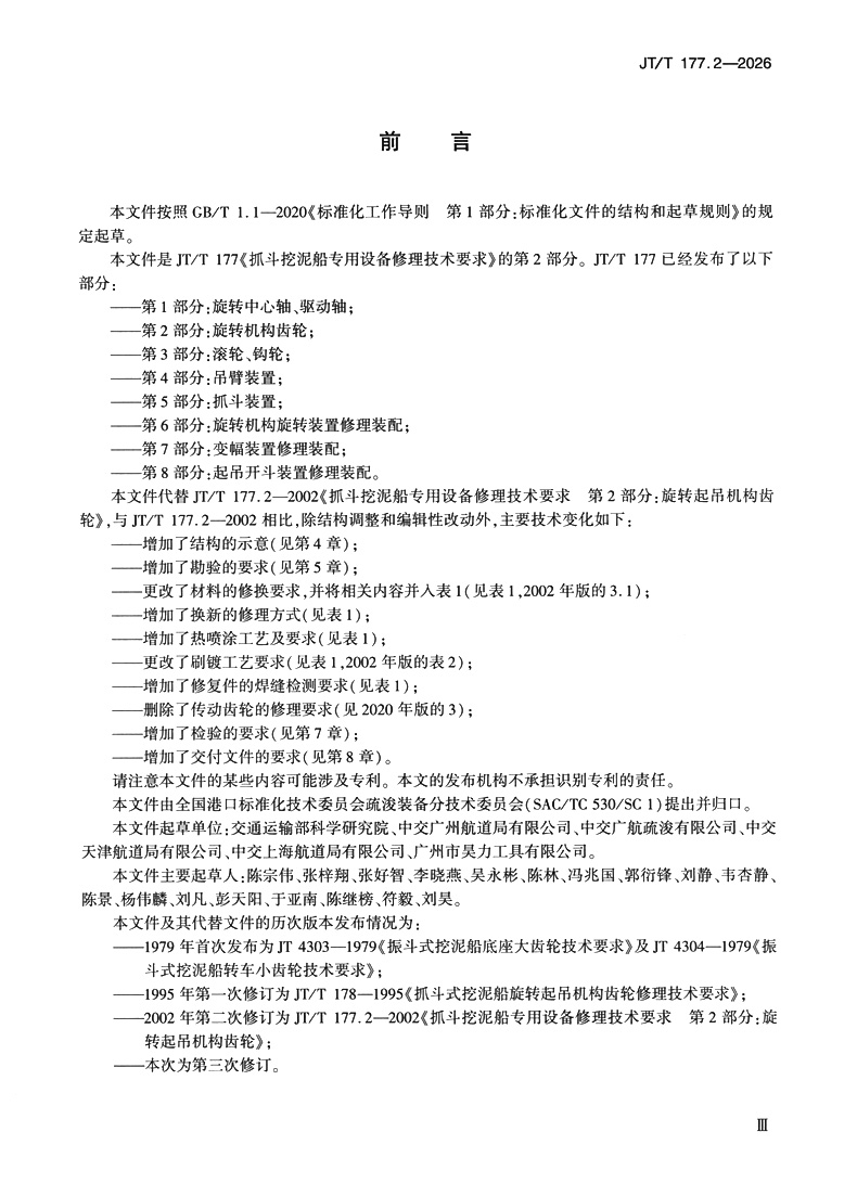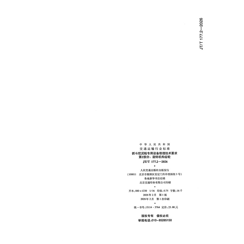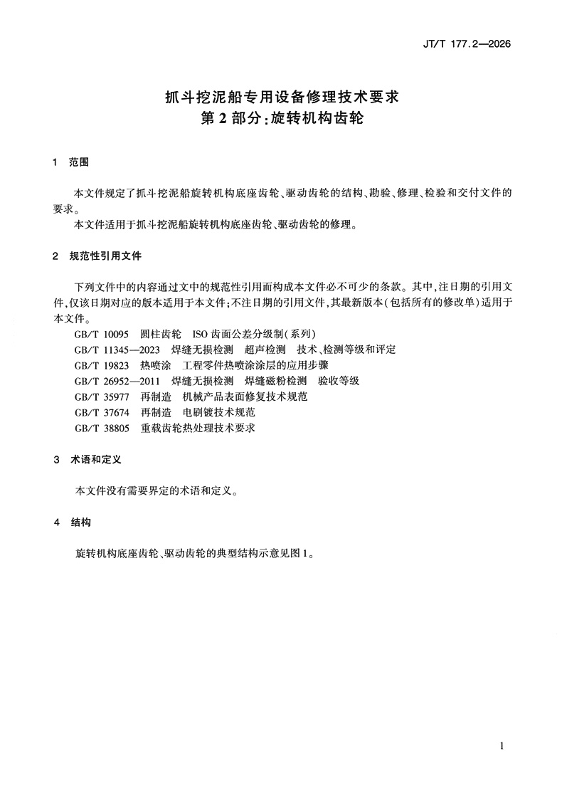 书名:抓斗挖泥船专用设备修理技术要求 第2部分:旋转机构齿轮(JT/T 177.2—2026)
