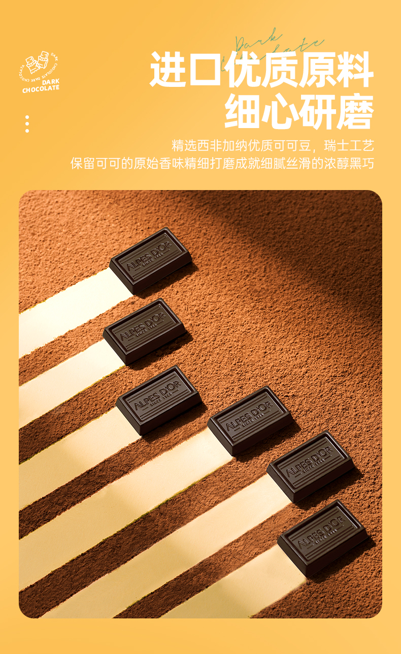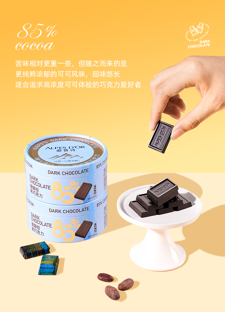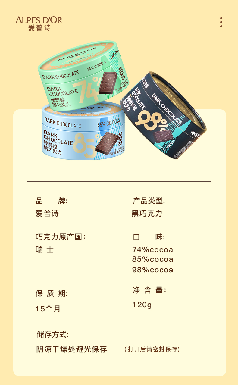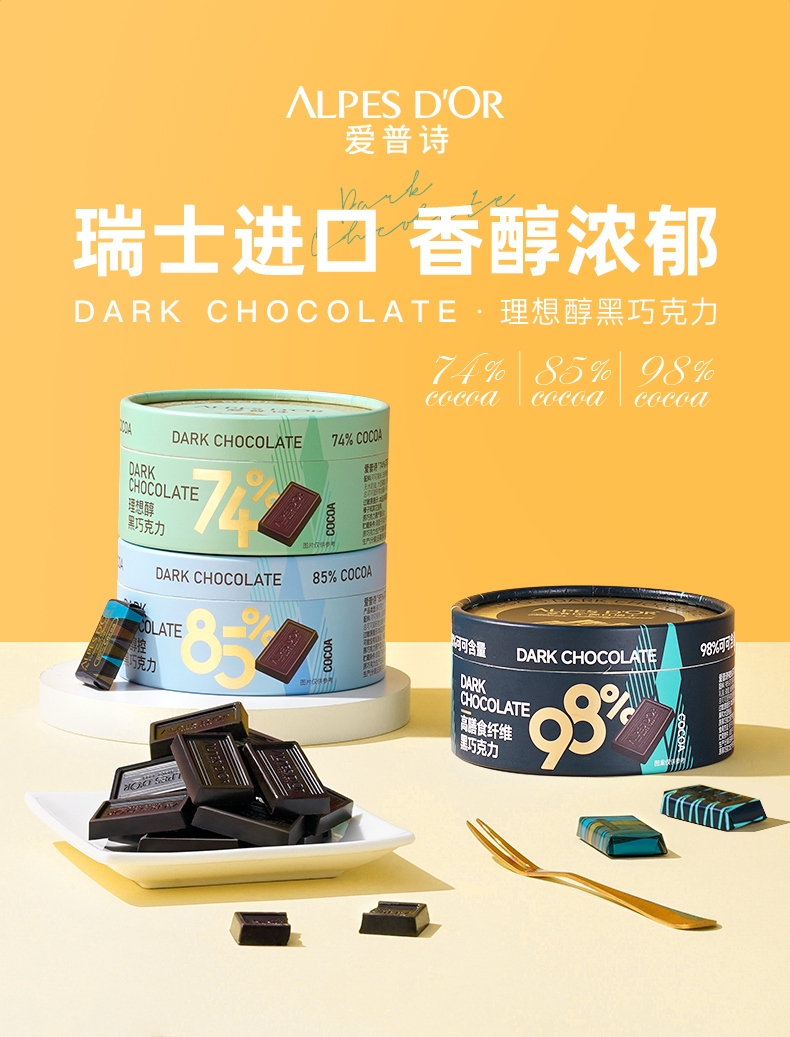 【中欧班列精选】瑞士爱普诗巧克力 原装进口Alpes d'Or爱普诗74%85%黑巧克力塑料罐装120g--纸罐