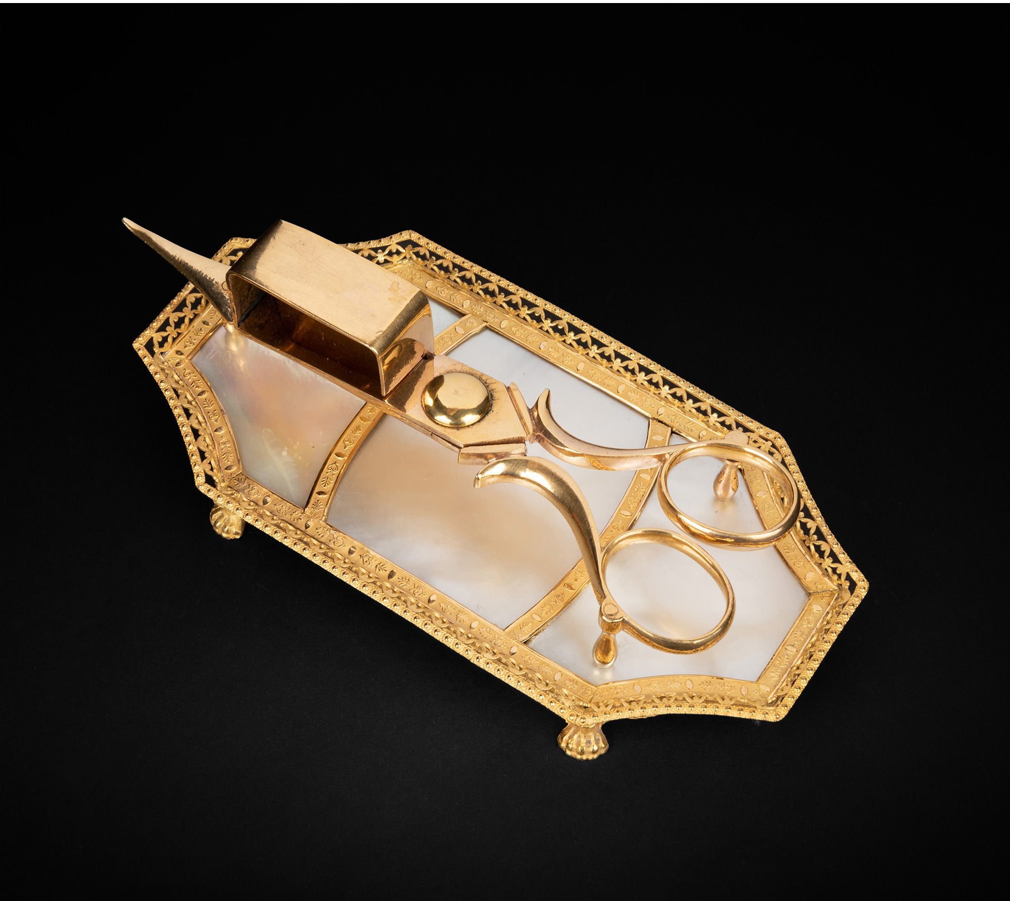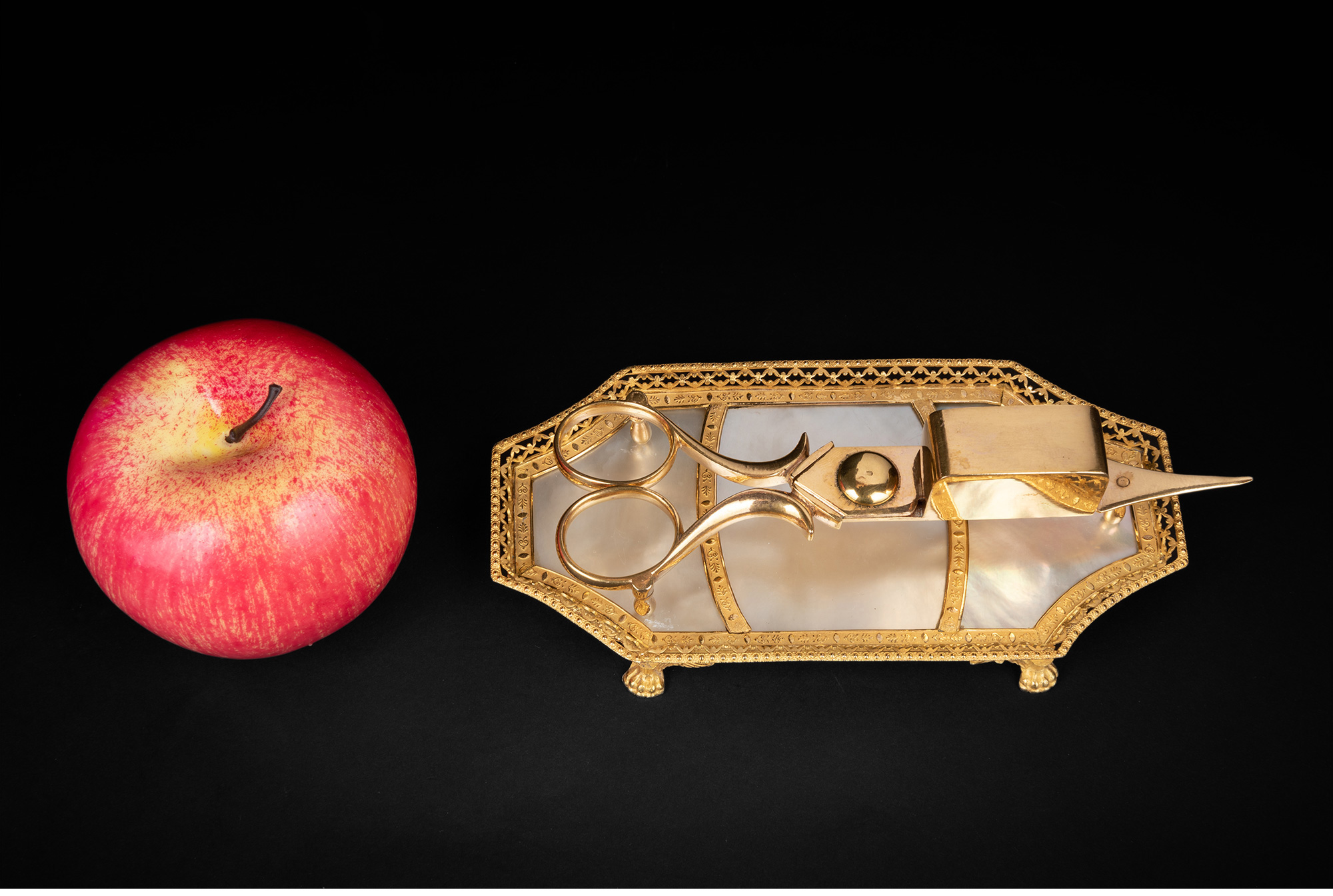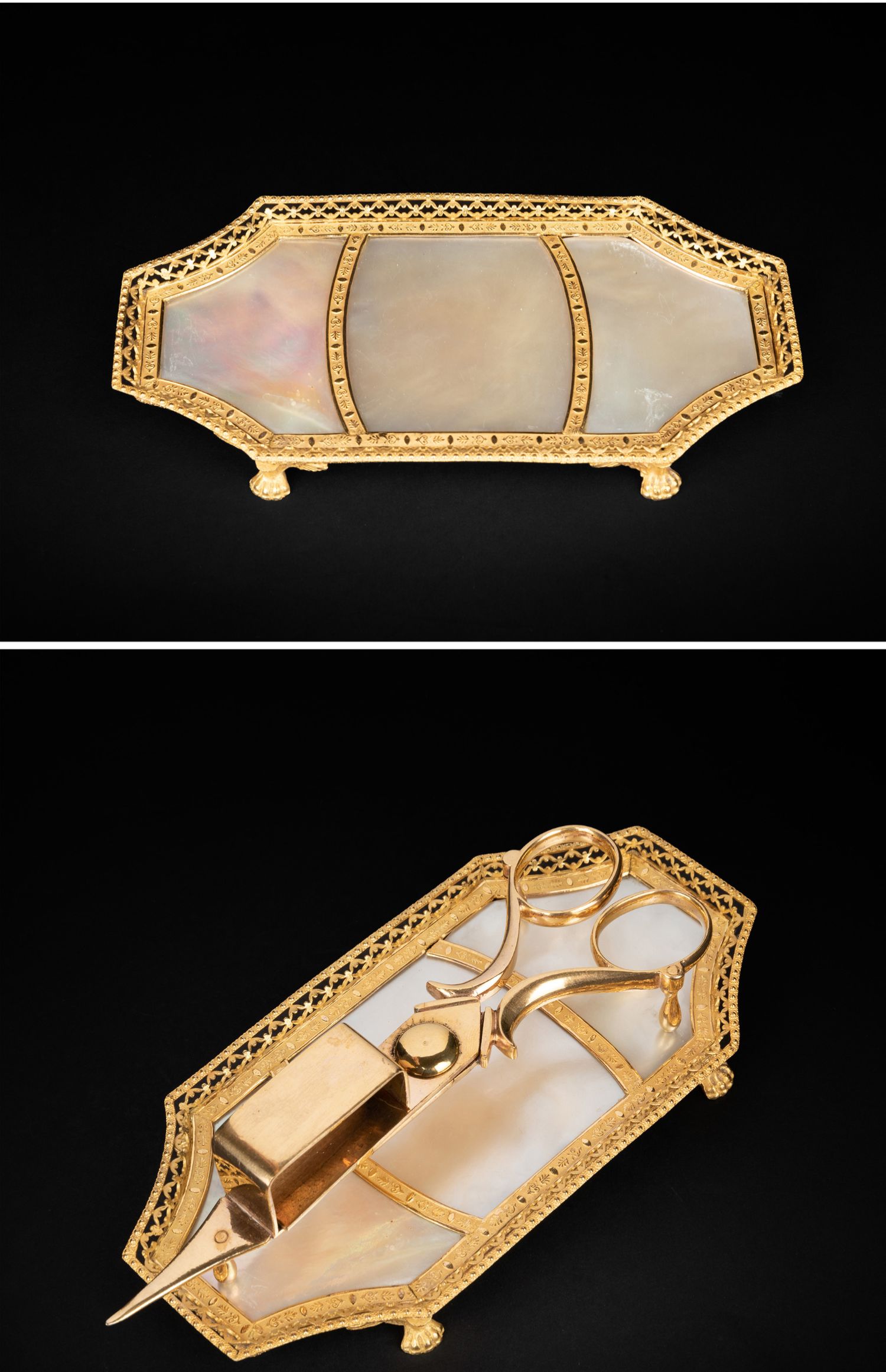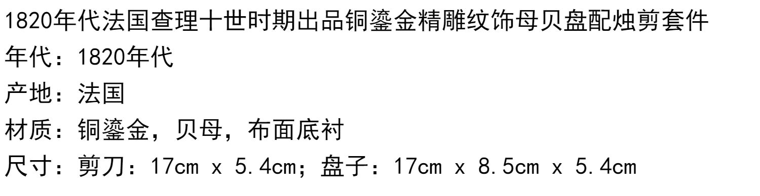 独角鹿西洋古董法国查理十世时期铜鎏金精雕纹饰母贝盘配烛剪套装