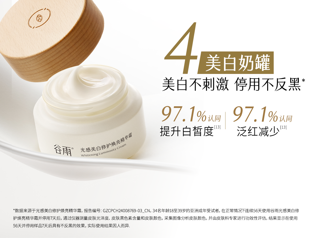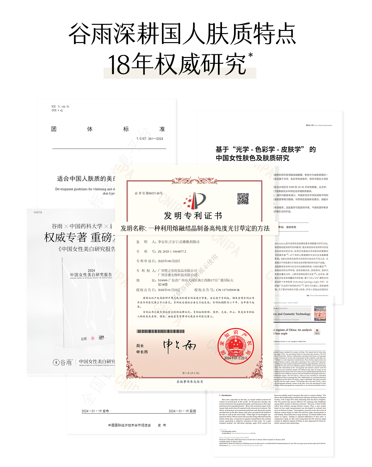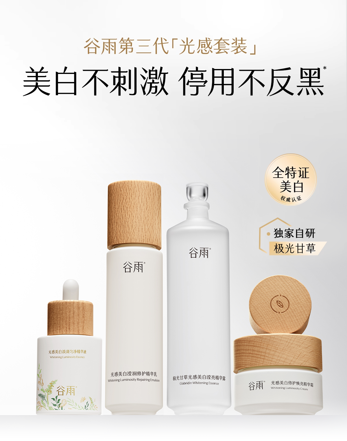 - 谷雨,更适合中国人肤质的植萃美白。专研中华珍稀美白植萃光甘草定,深入研究中国人肤质特点,打造中国女性独有的仙气白。