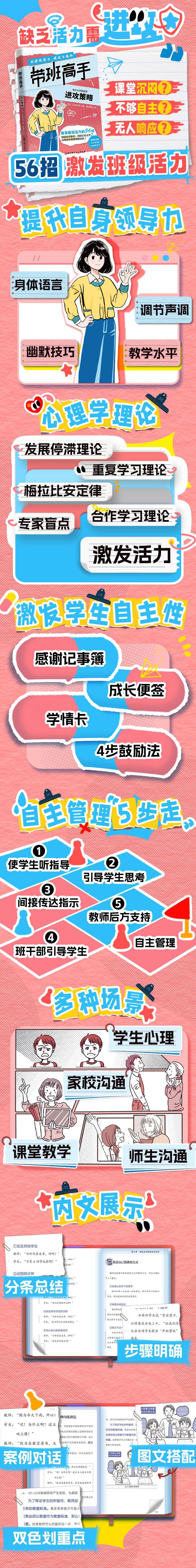 本篇《带班高手.进攻策略》介绍了56个激发班级活力的策略,帮教师巧妙解提升学生自主性、增加课堂活力、提升班级状态、助力学生提升成绩。用具体方法引导学生实现自主管理。