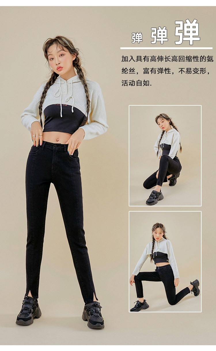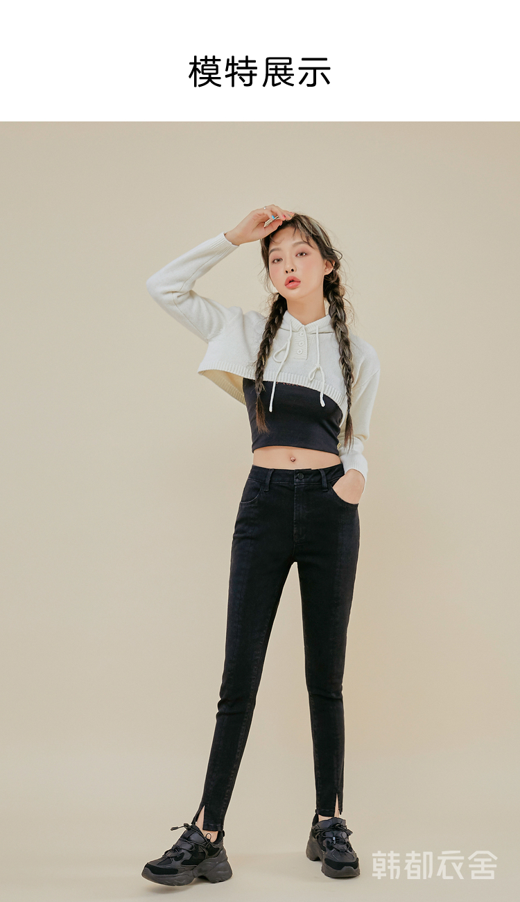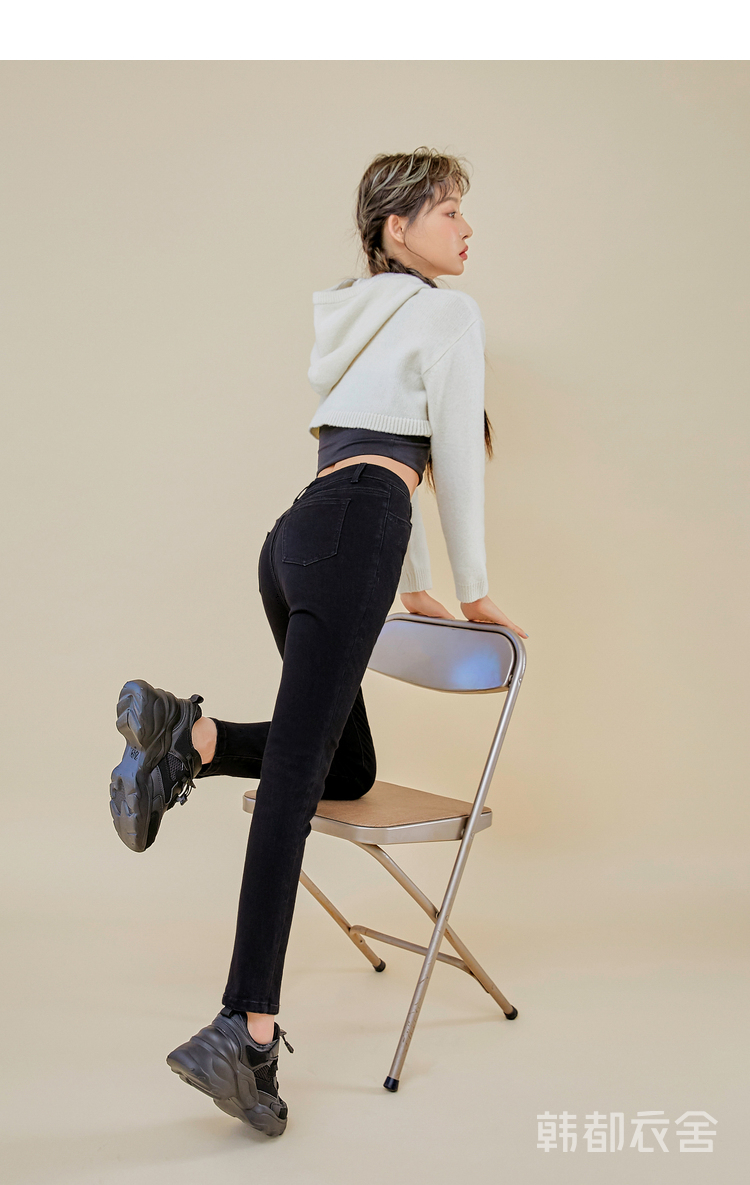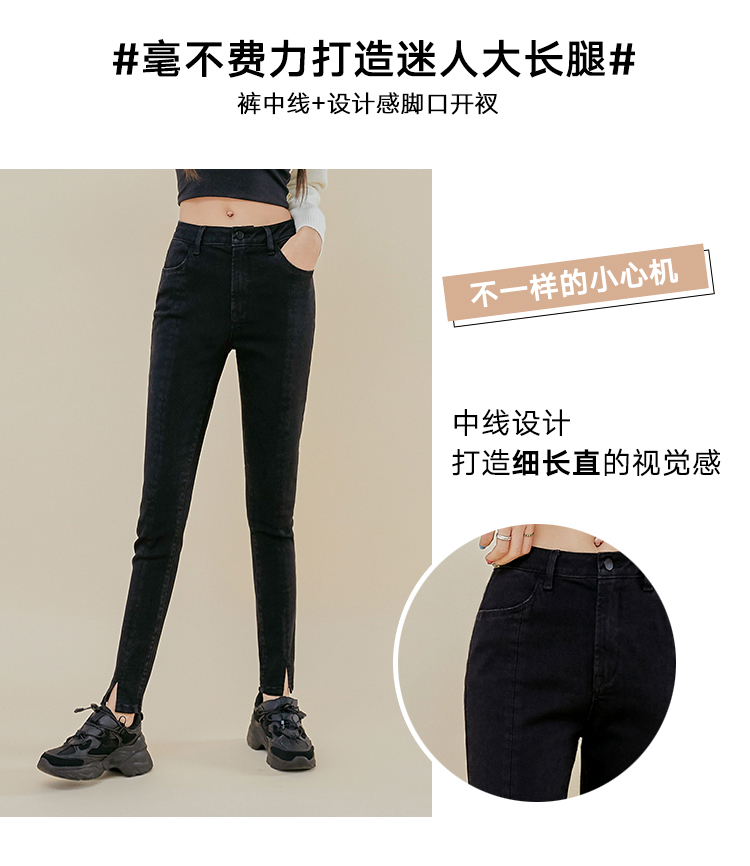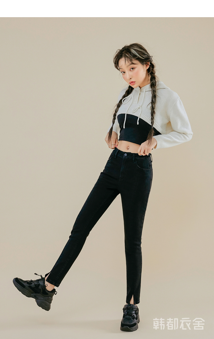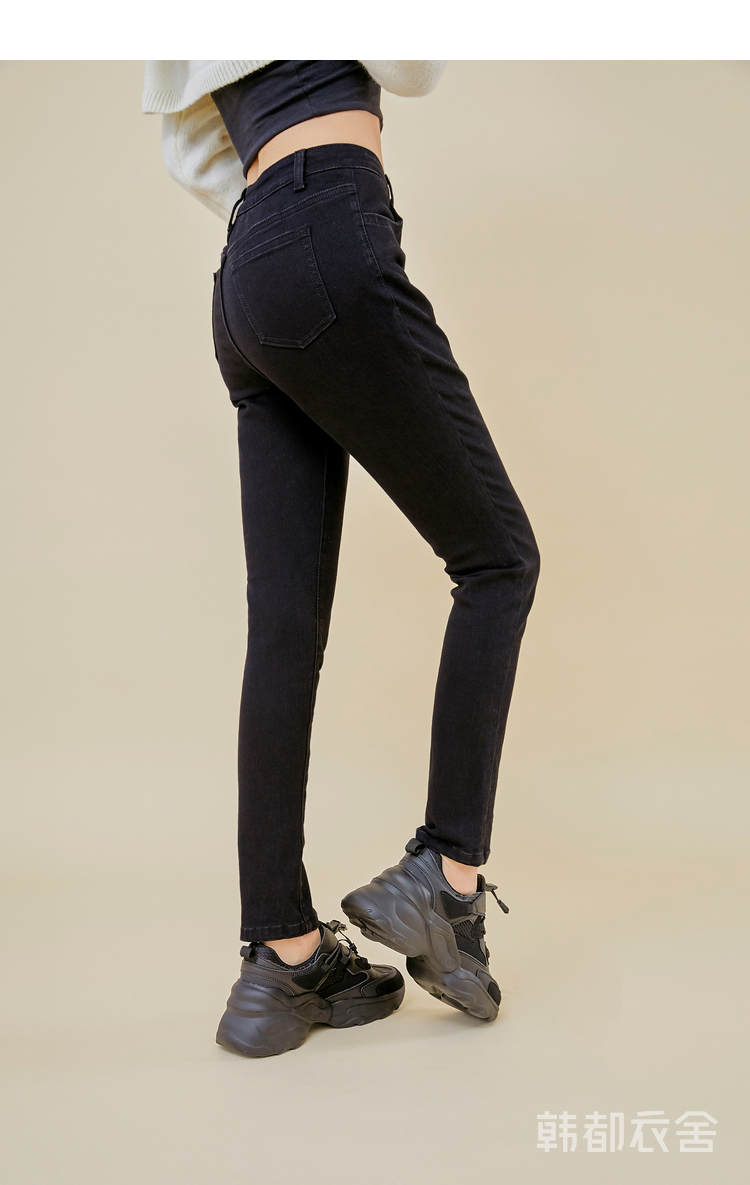 韩都衣舍2021春新款女弹力修身小脚显瘦加绒牛仔长裤PT9808