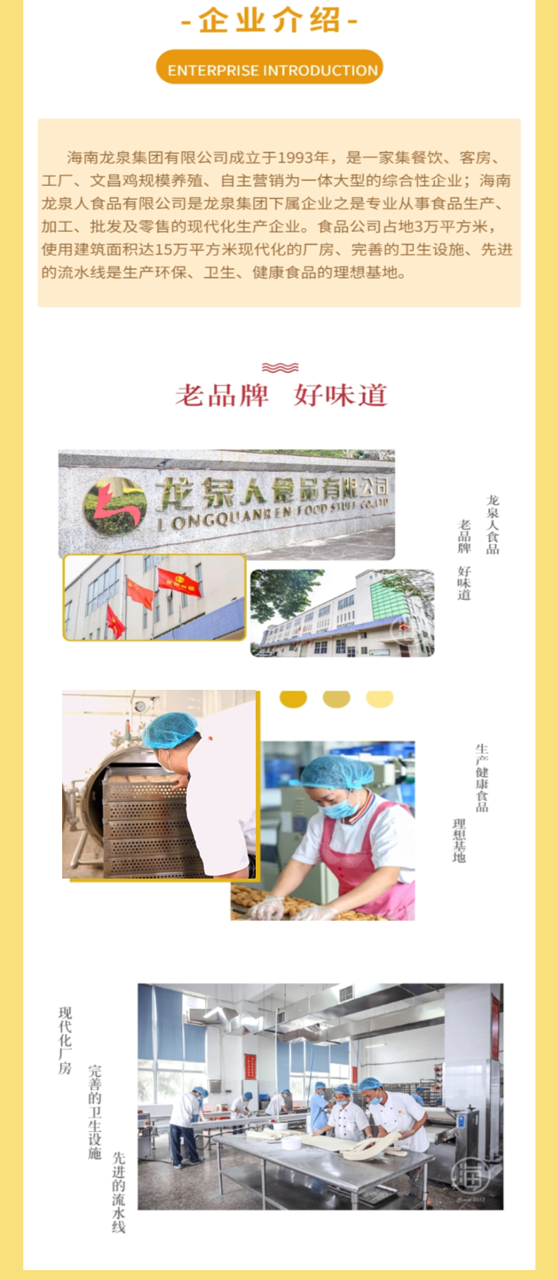 龙泉人始创于1993年,是首批海南老字号品牌。龙泉人食品制造产业始于1996年,隶属于海南龙泉集团有限公司,是一家综合性食品企业,公司占地33亩,主营月饼、年货、粽子、盐焗文昌鸡、海南伴手礼等食品。