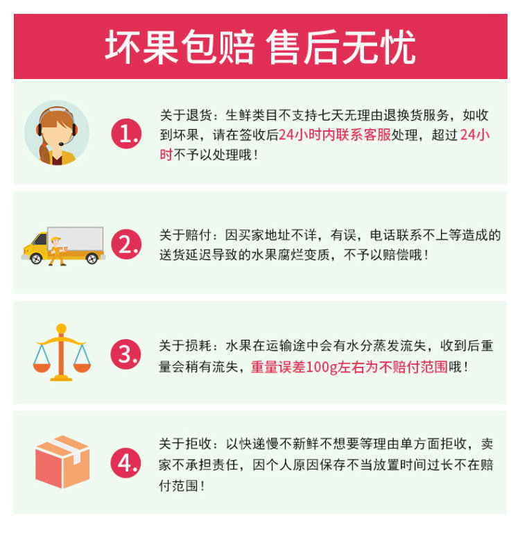 2.生鲜水果因轻微磕碰或者口感/品相/颜色问题不影响食用的不予赔付