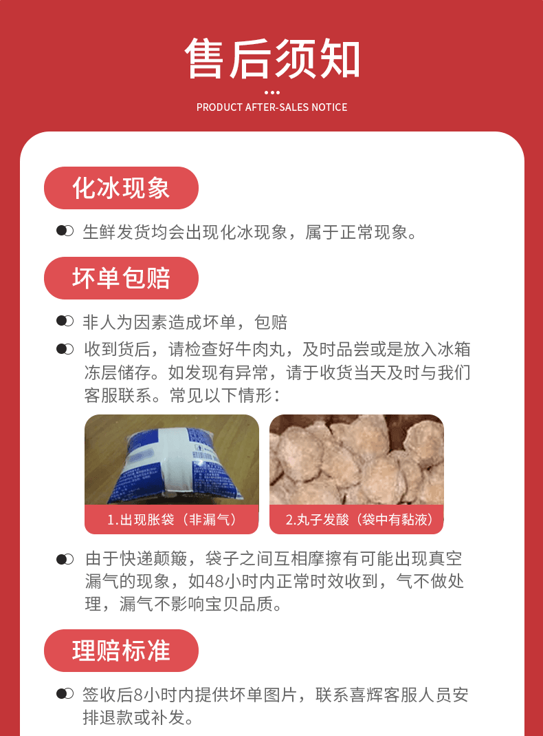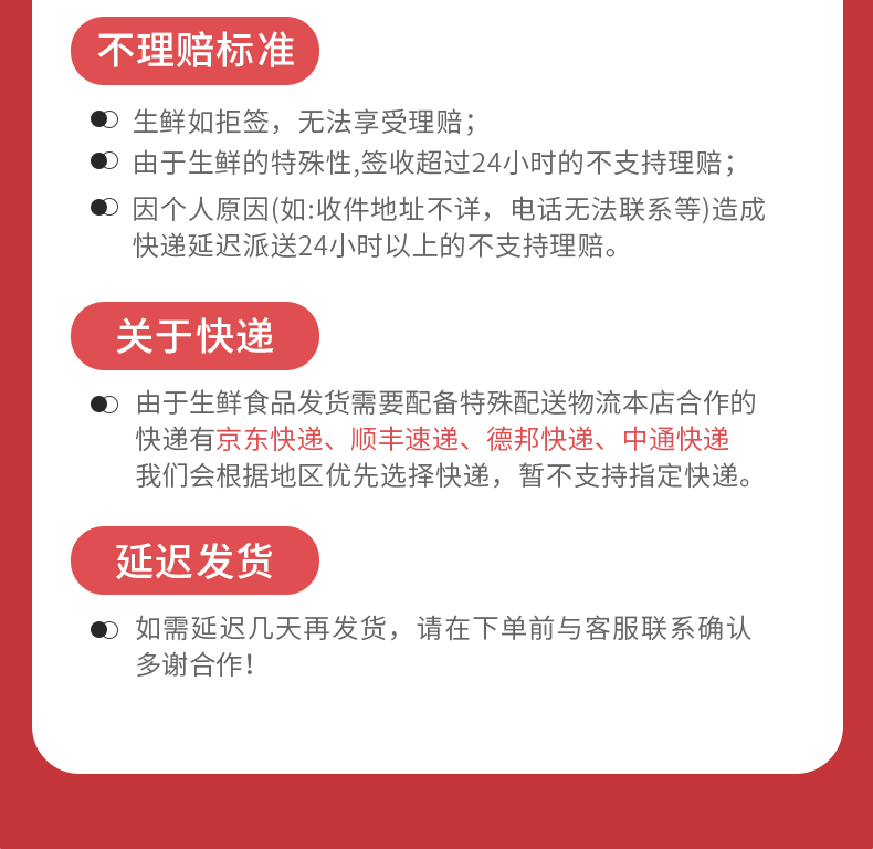 2.冷冻食品,请于收货48小时内拆包验货,有坏单,商品和快递单号拍照理赔,超时不理赔;
