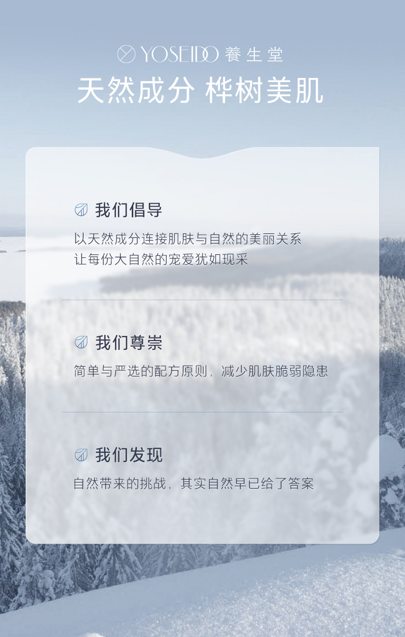 - 养生堂YOSEIDO,高端护肤品牌。专研白桦原液•来自北纬45° 的细胞抗老成分,源自1772年《丹麦药典》。不额外添加一滴水,让青春永续。