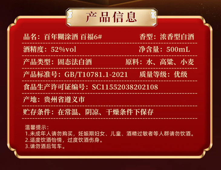 【高度组合装】百年糊涂浓香型白酒52度龙标500ML*6瓶+52度百福 500ML*6瓶高品质粮食酒
