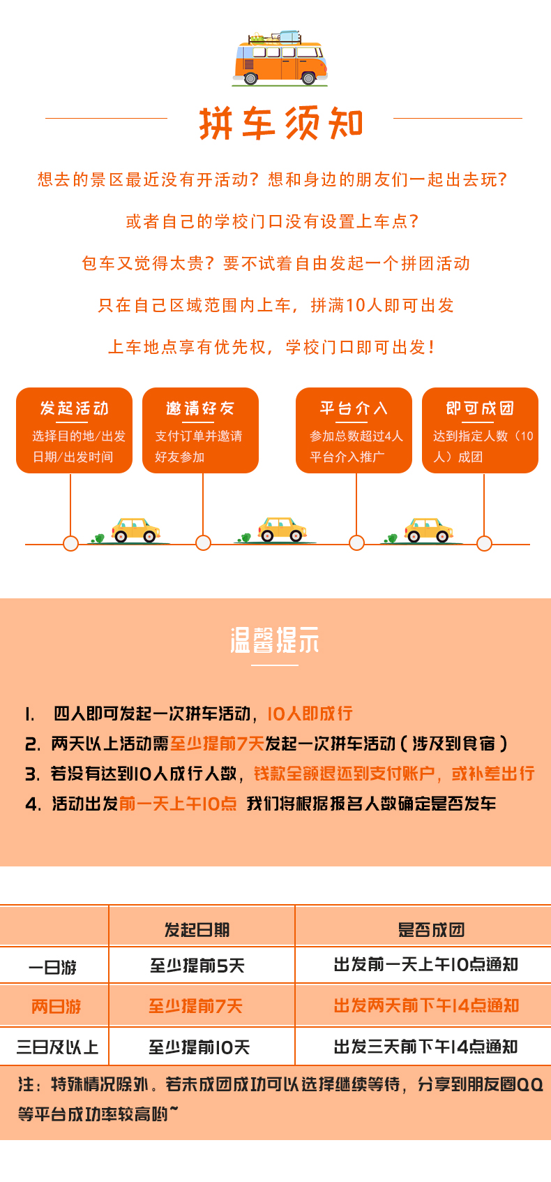 拼车活动上车地点为发起活动人指定区域范围,区域内满10人即可发车。
