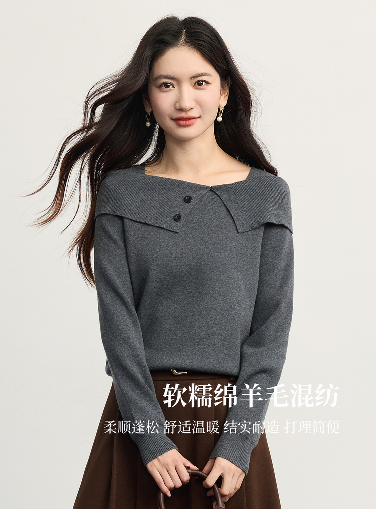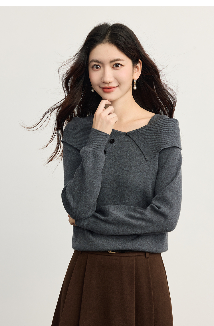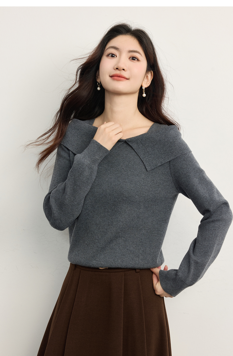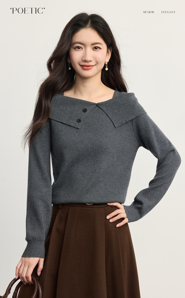 【10/15新品】熙世界氛围感一字肩翻领针织衫女2025秋冬新款设计感独特灰色毛衣