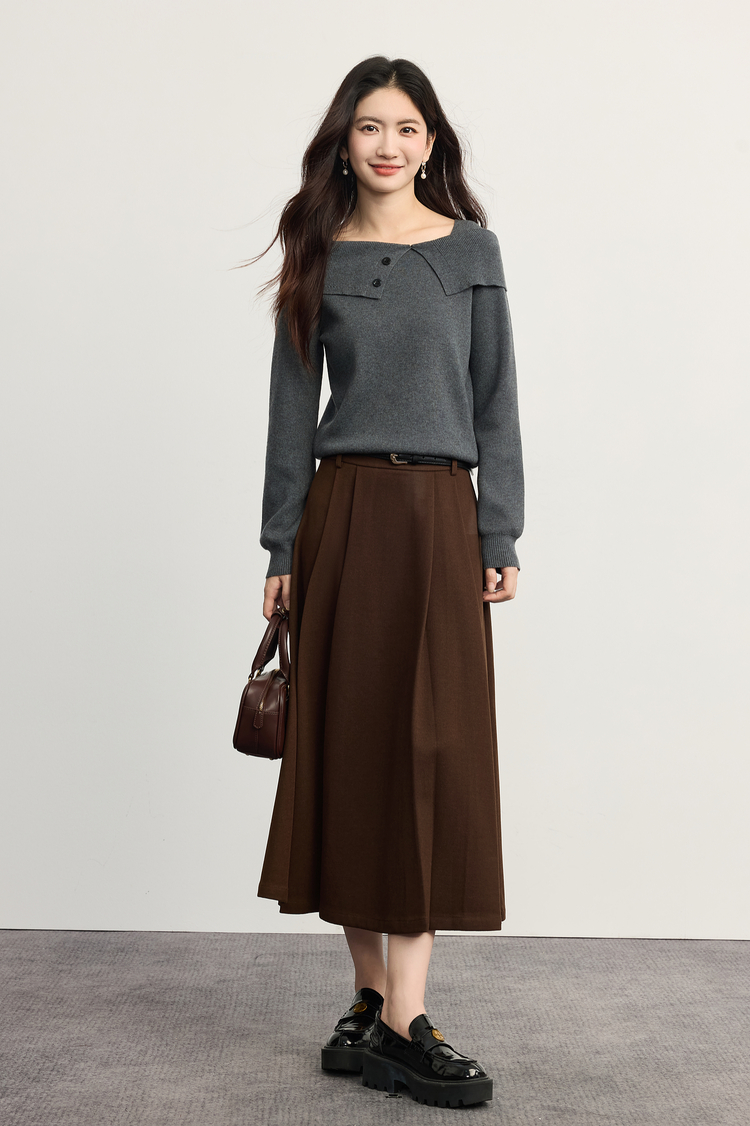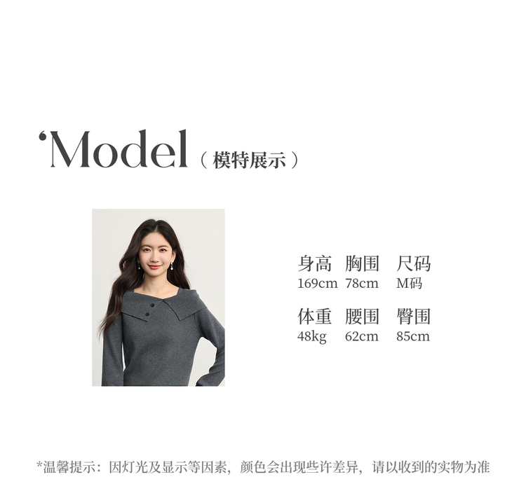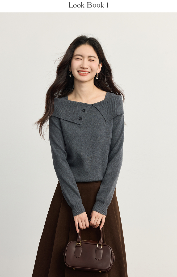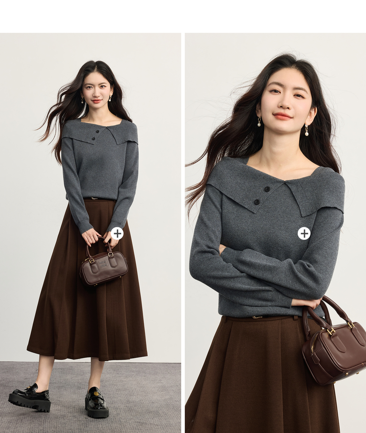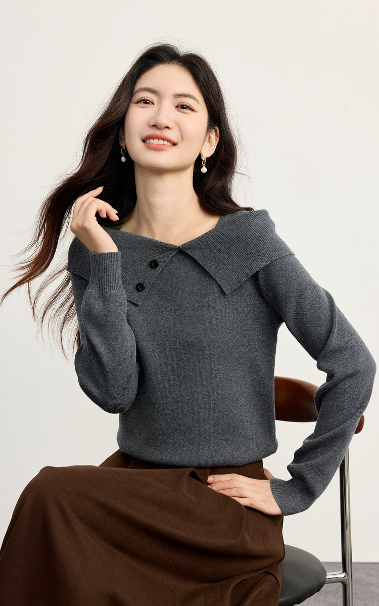 【10/15新品】熙世界氛围感一字肩翻领针织衫女2025秋冬新款设计感独特灰色毛衣