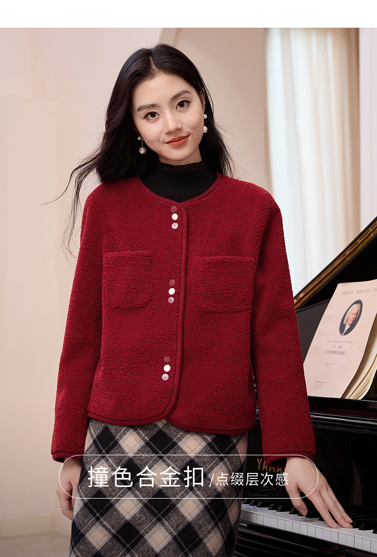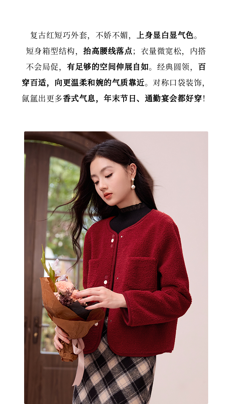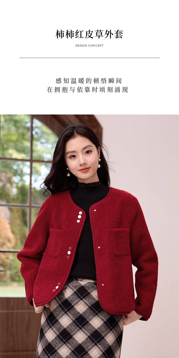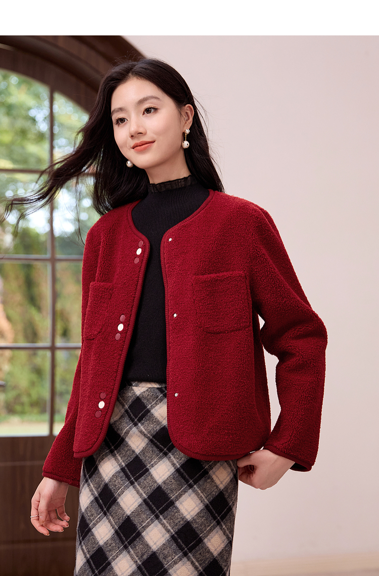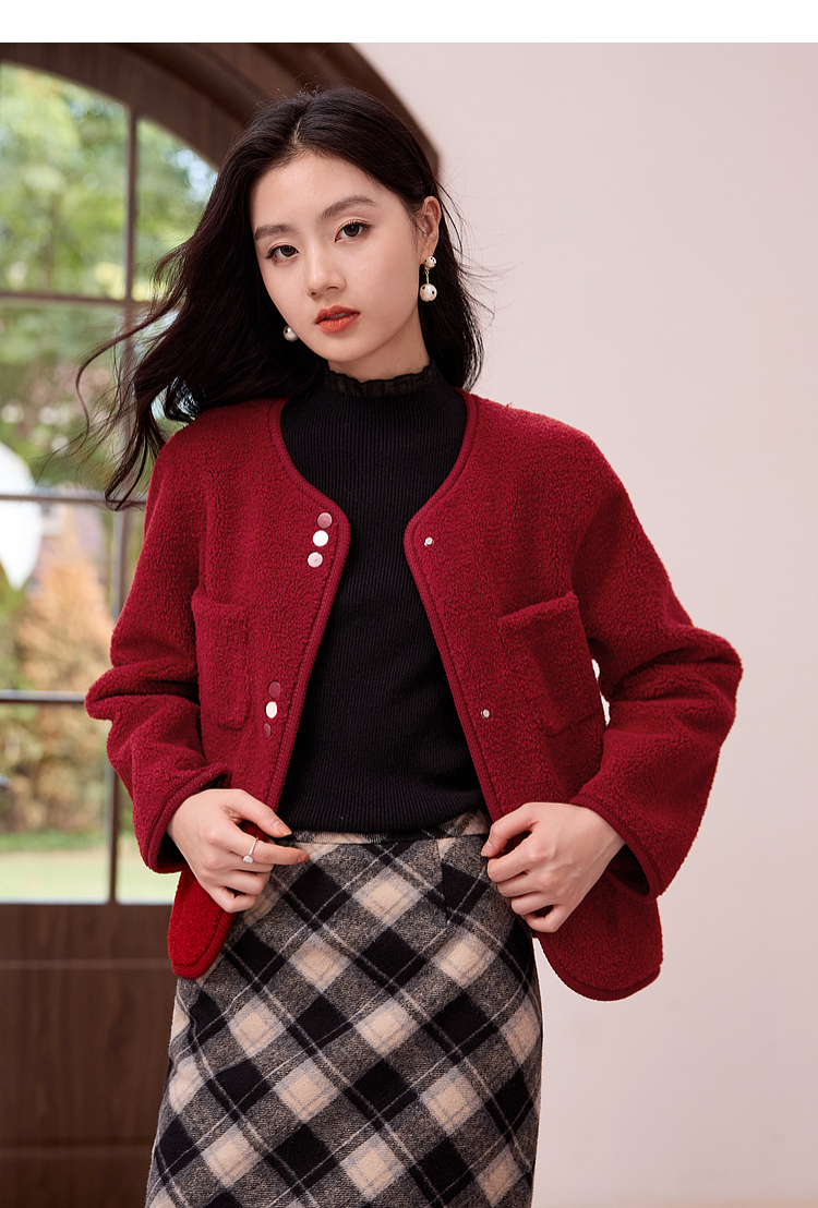 【年终特卖】熙世界皮毛一体仿羊羔毛麂皮绒短款外套女秋冬保暖红色夹克上衣