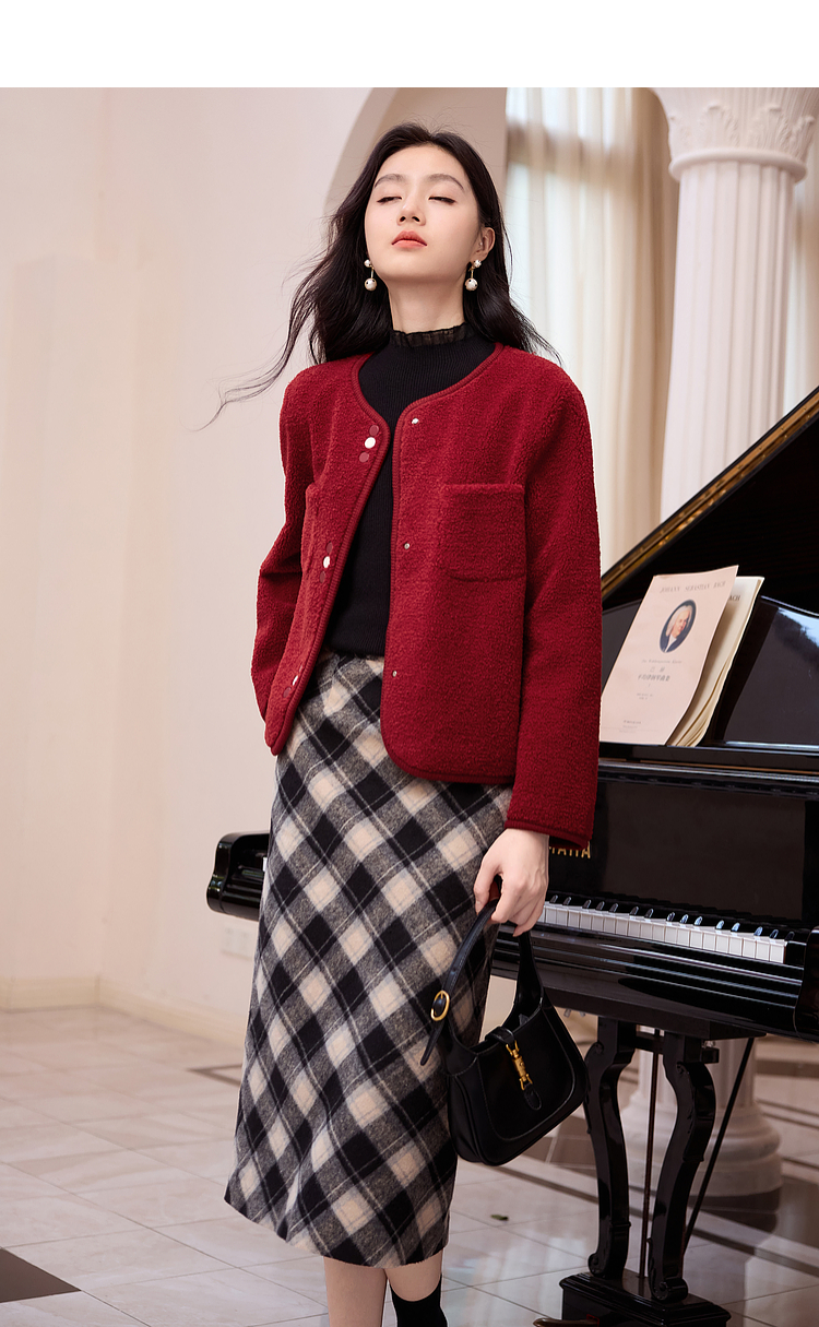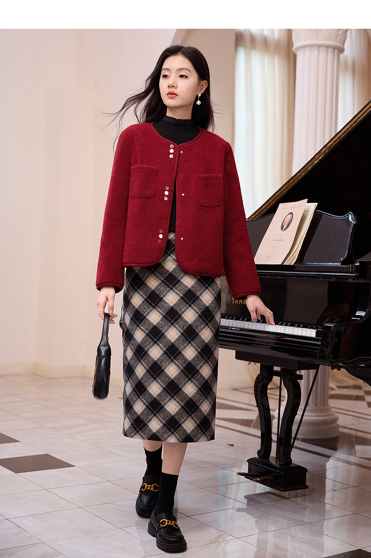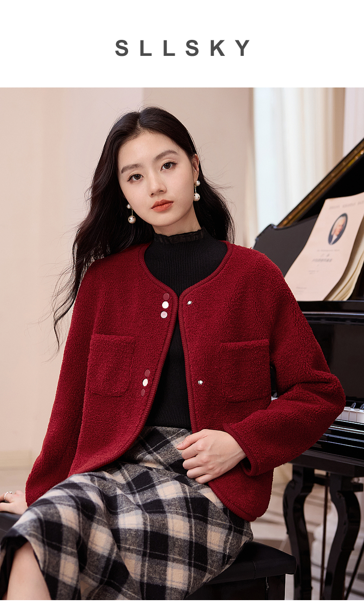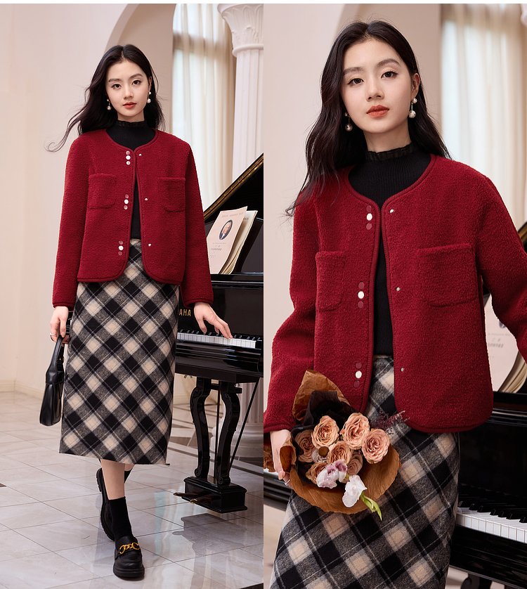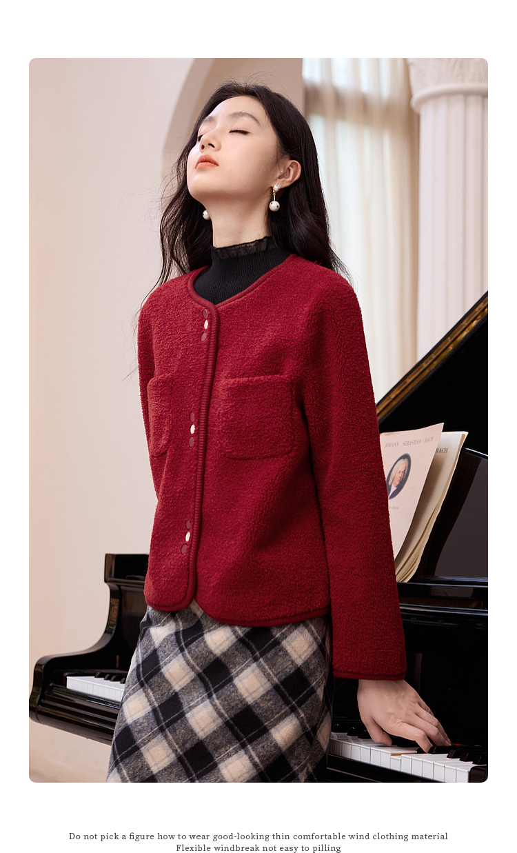 【年终特卖】熙世界皮毛一体仿羊羔毛麂皮绒短款外套女秋冬保暖红色夹克上衣