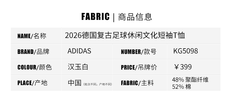 SFS正品 Adidas阿迪达斯2026世界杯德国队复古足球休闲文化修身短袖T恤KG5098