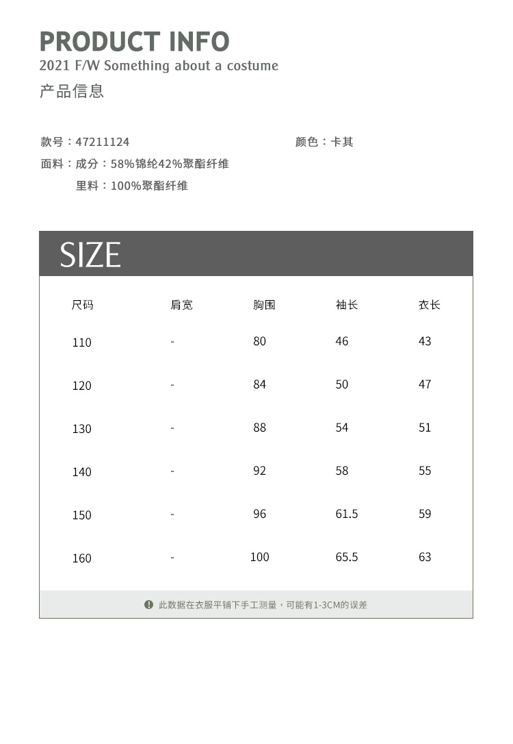| 参考身高: 110/52 120/56 130/60 140/64 150/68 160/72 | 适用季节: 春秋 |
