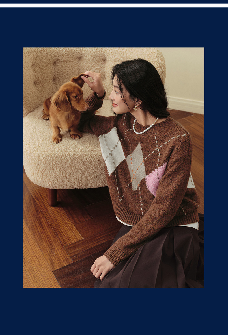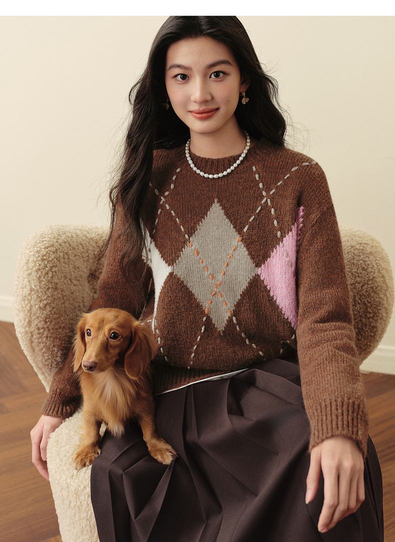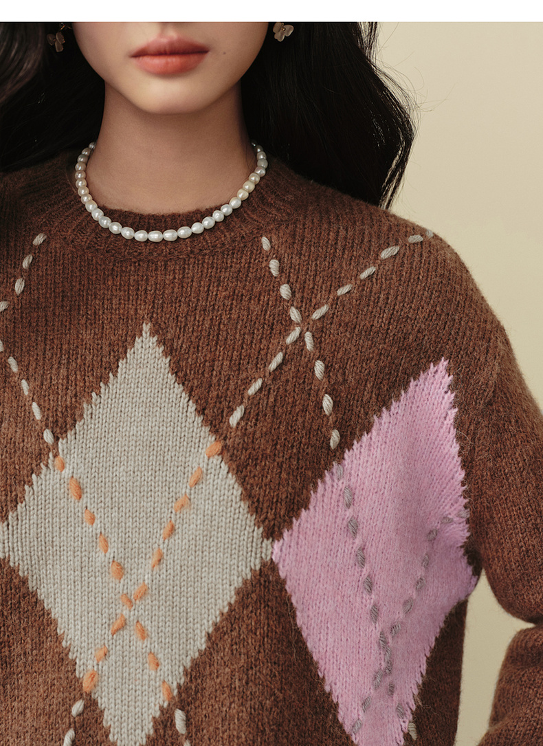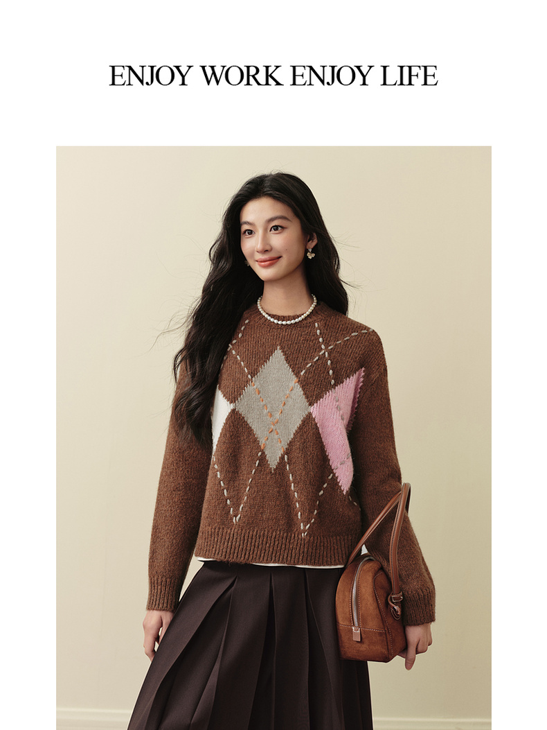 【严选】诗凡黎撞色菱格提花针织衫2025冬新款复古慵懒宽松软糯套头毛衣女7GC133371
