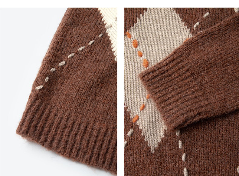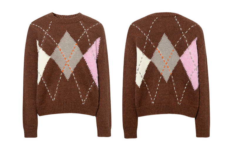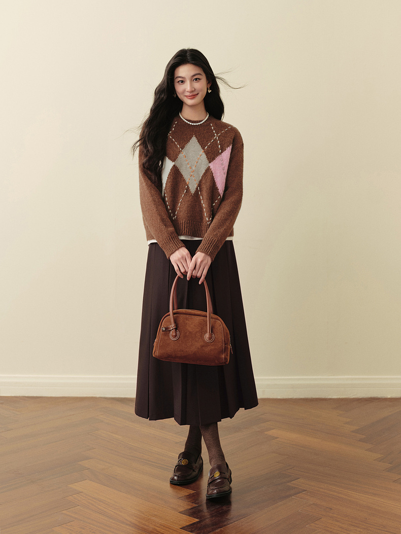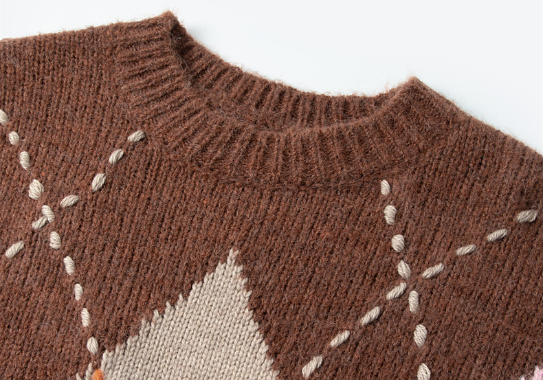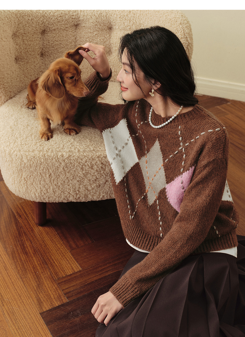 【严选】诗凡黎撞色菱格提花针织衫2025冬新款复古慵懒宽松软糯套头毛衣女7GC133371