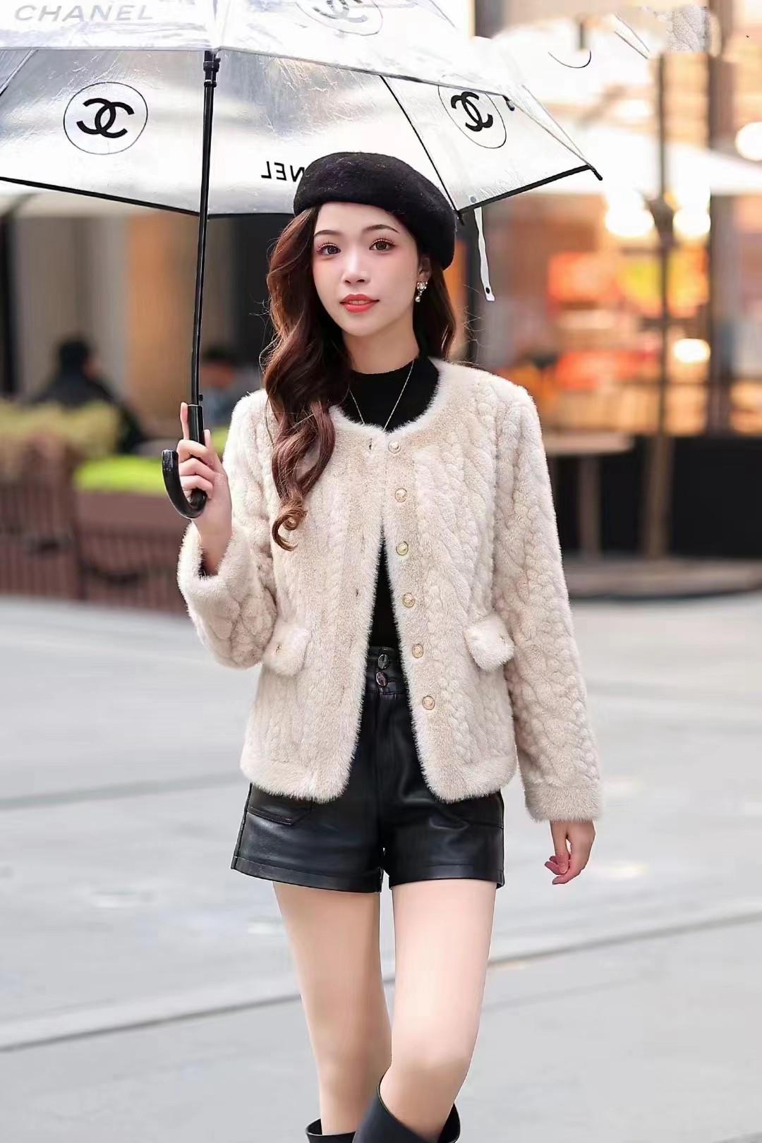 23613D # 杏 M 毛绒感麦穗肌理感外套 麻花纹理 毛针纤长 环保的水貂绒毛茸茸的质感很棒 手感细腻而亲肤 顺滑而舒服 名媛气场 倍儿贵气 一阅上千的品质