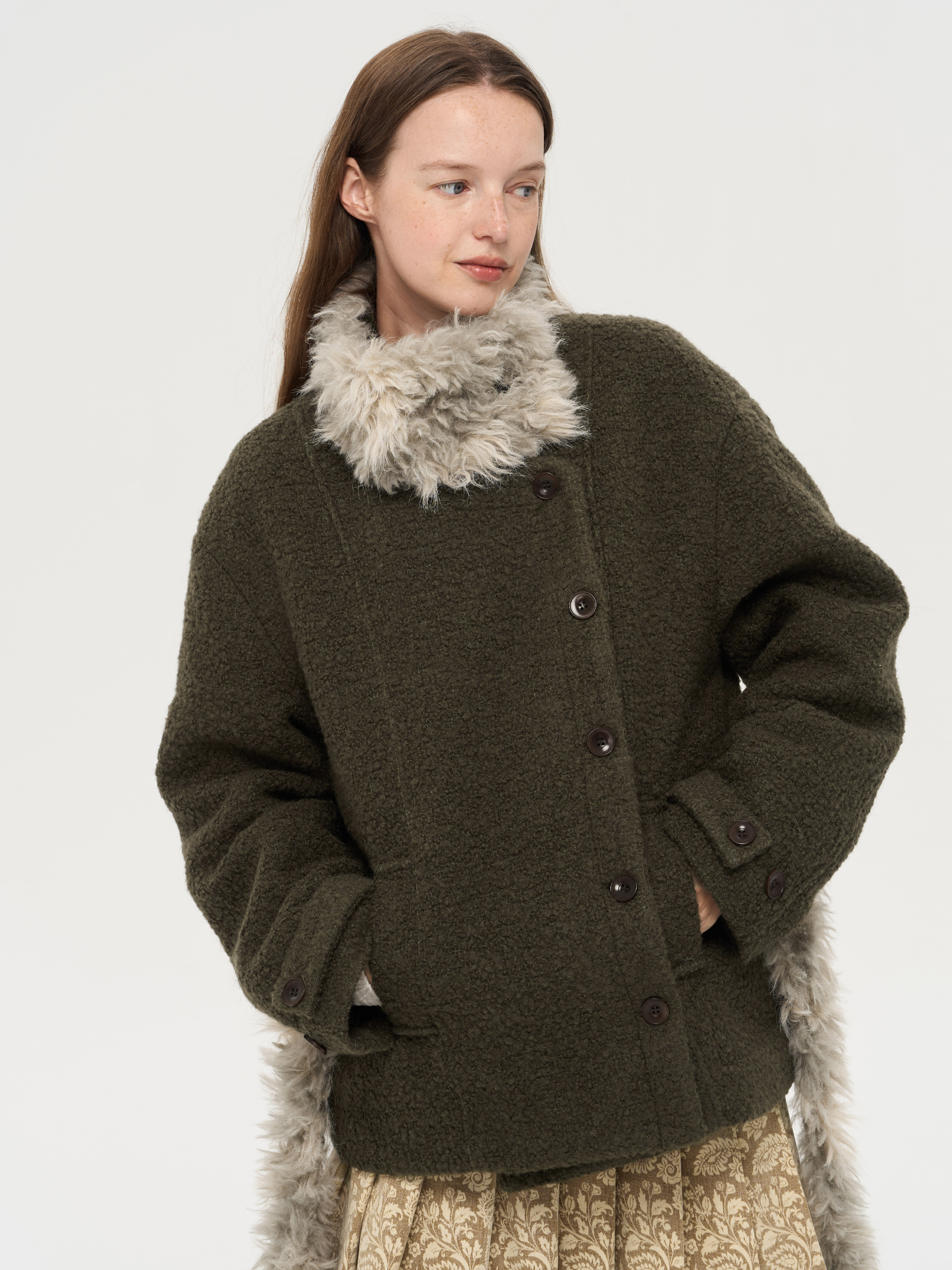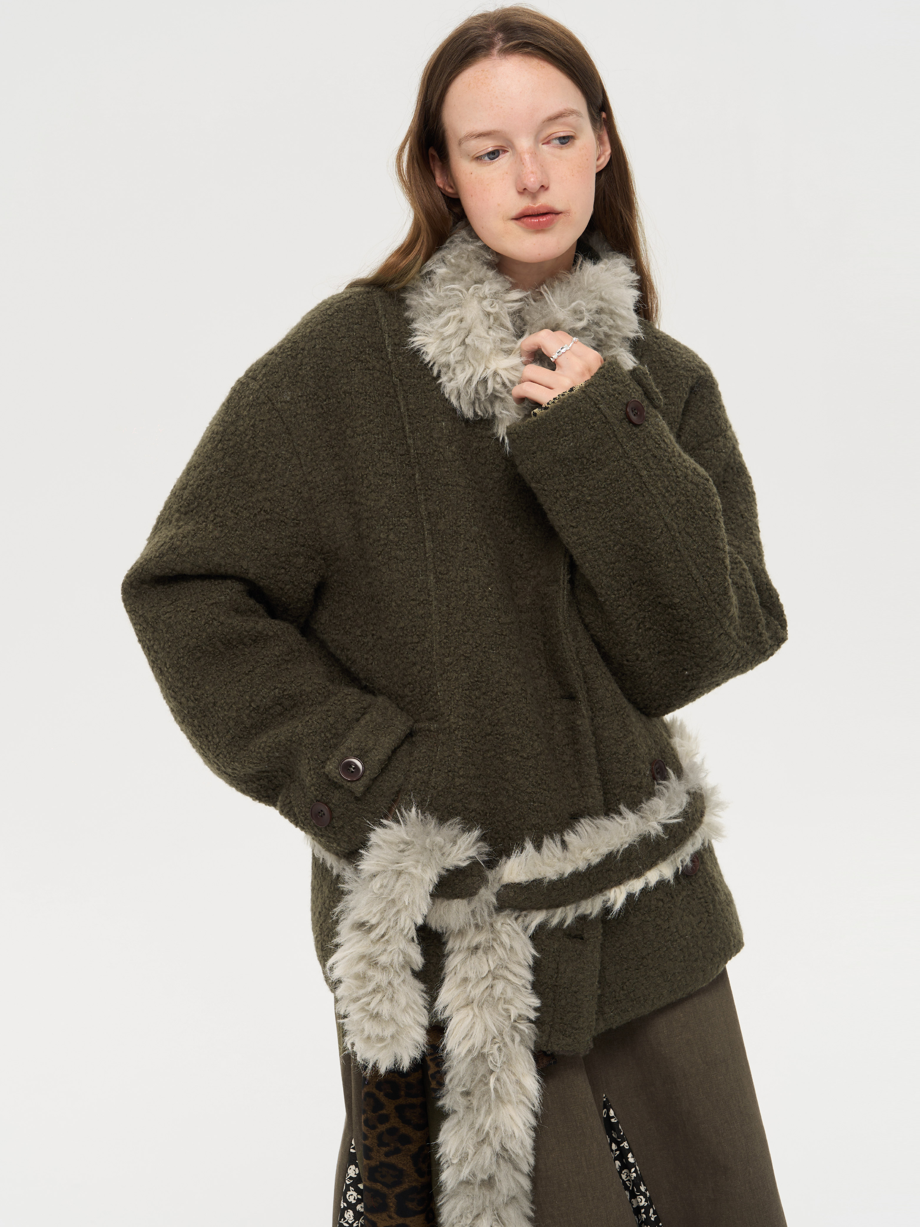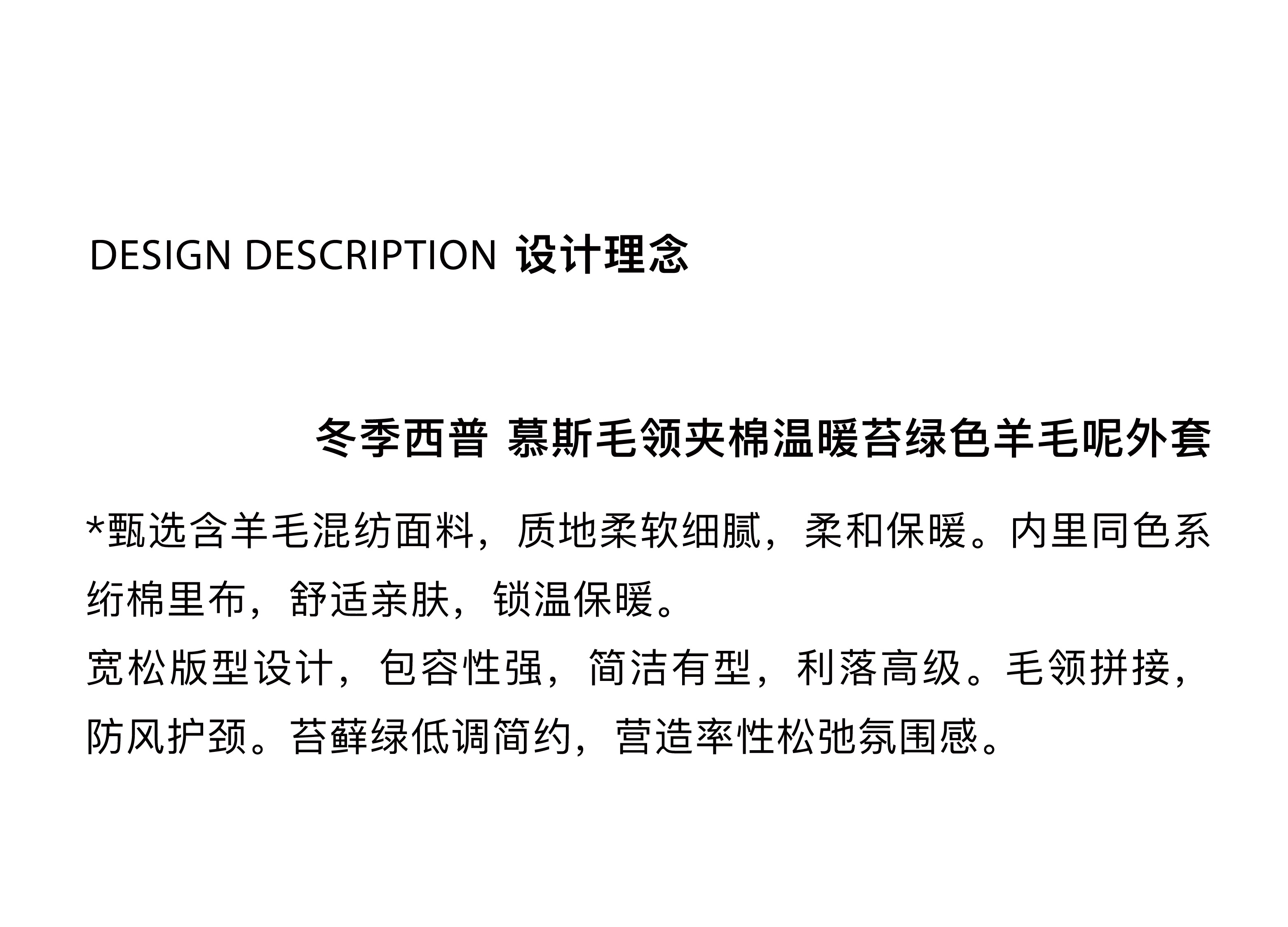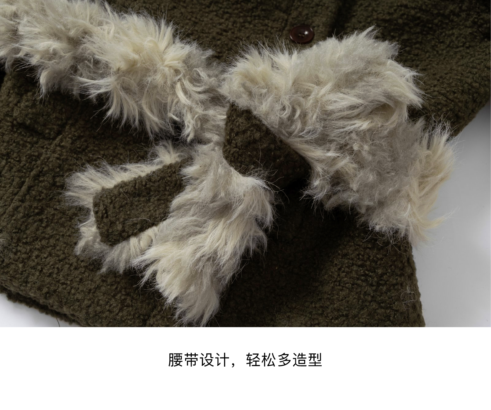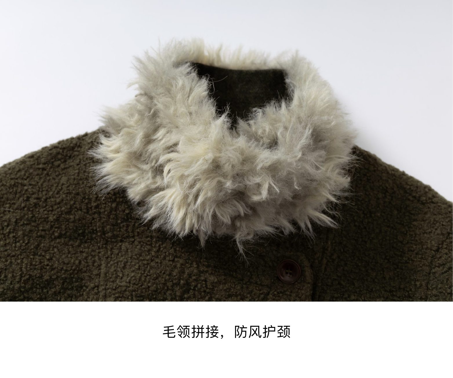 local tag/lt25awk48/冬季西普 慕斯毛领夹棉温暖苔绿含羊毛呢大衣外套