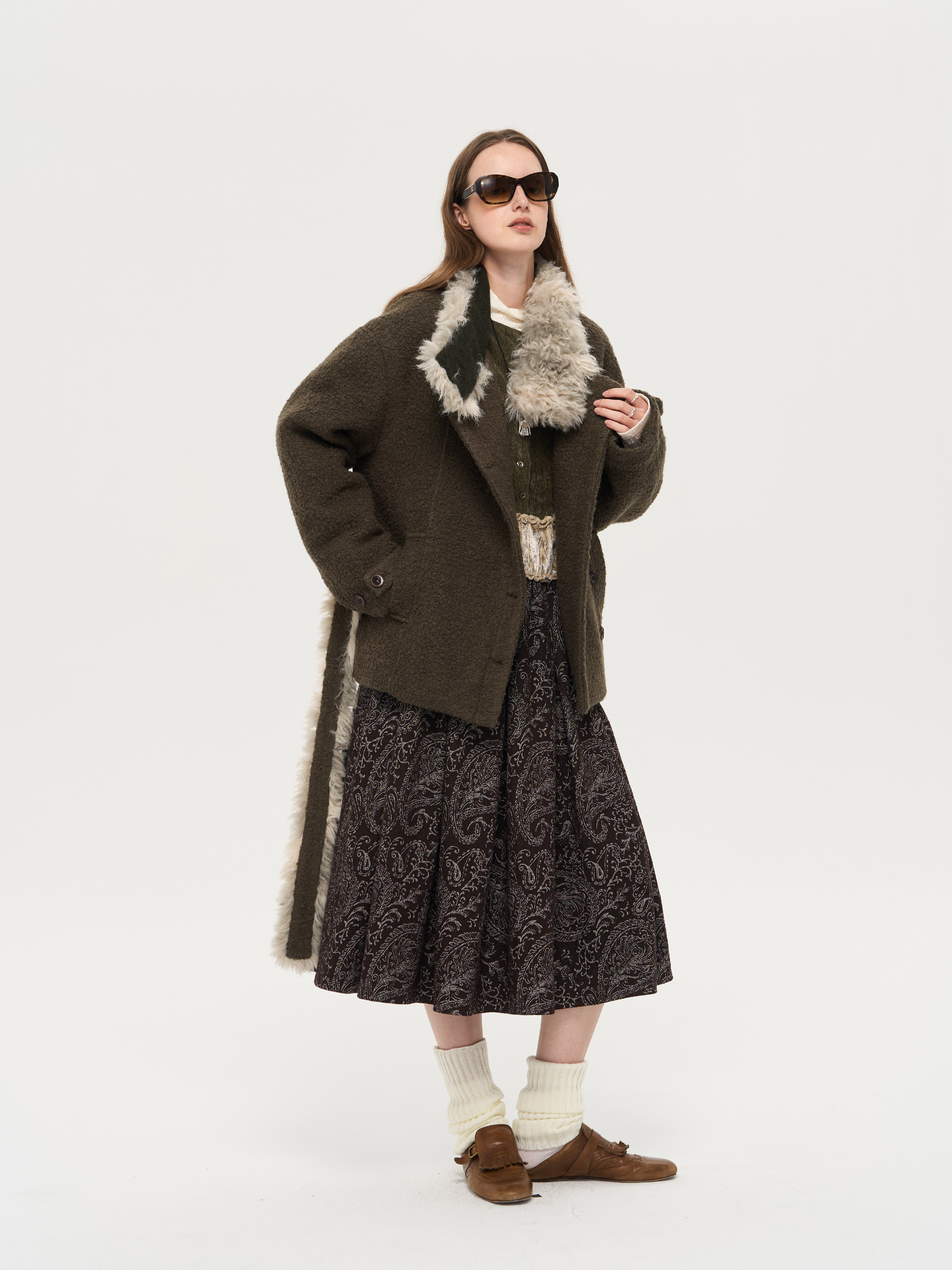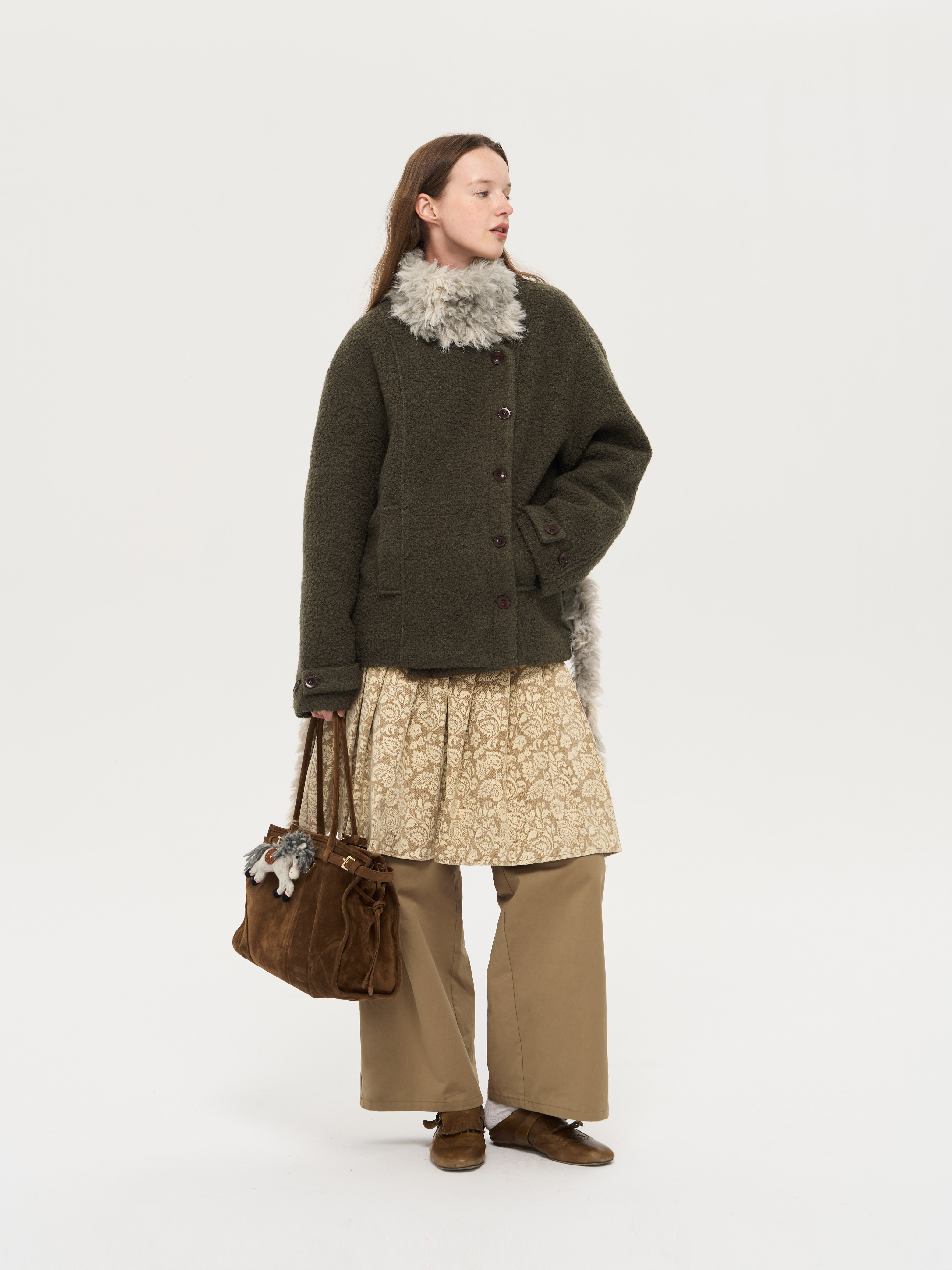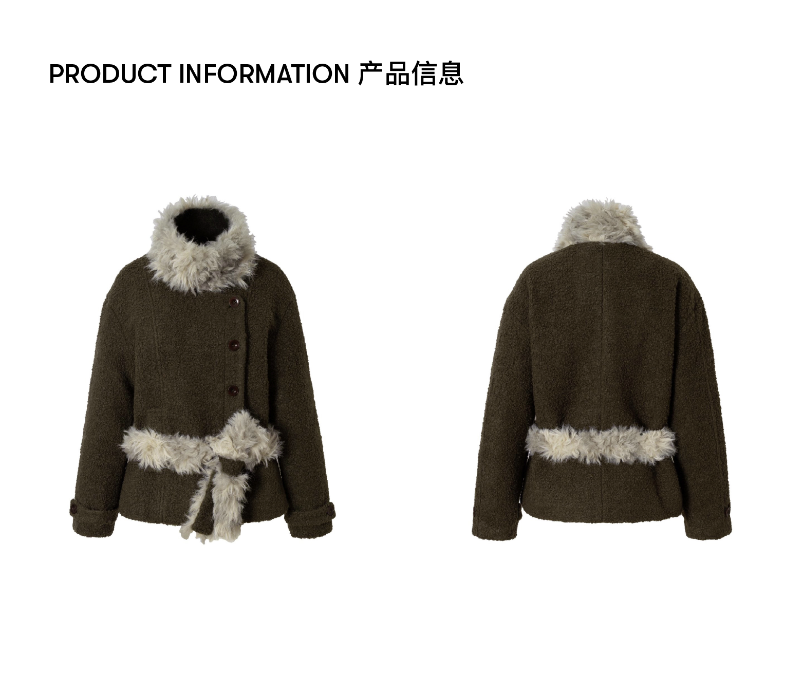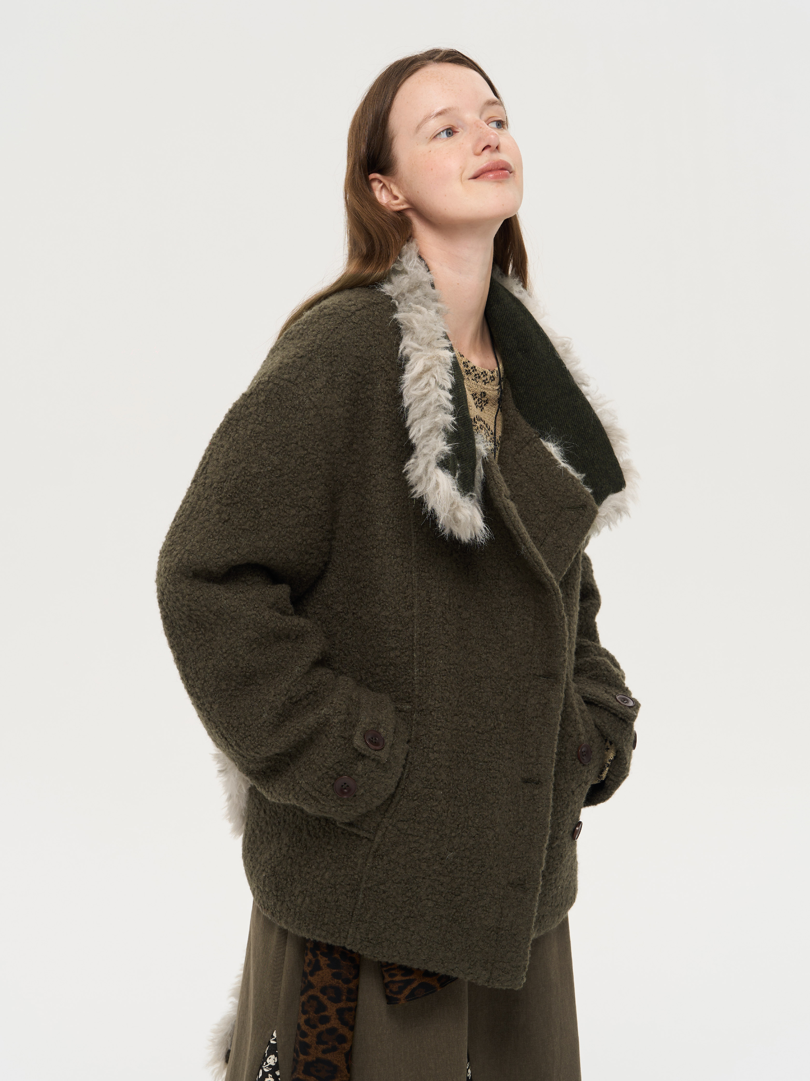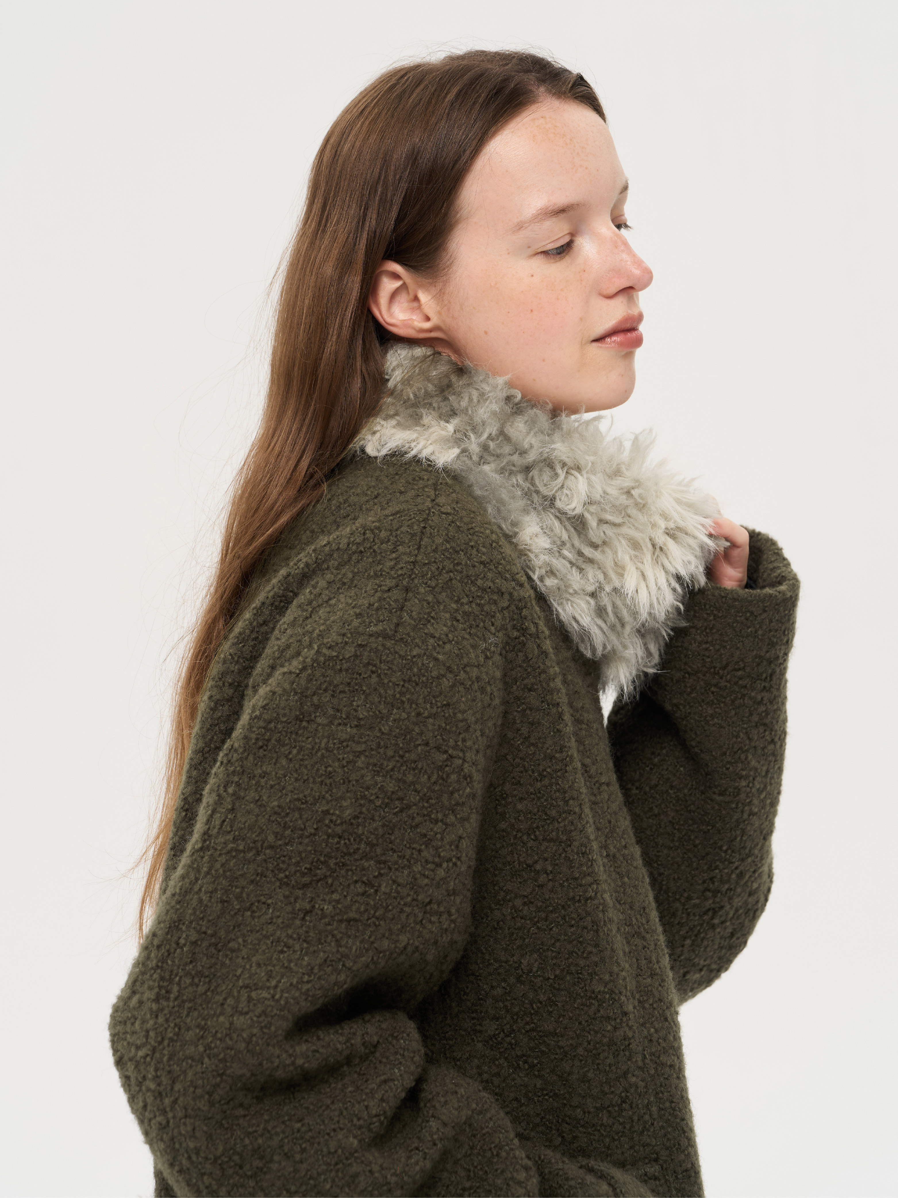 local tag/lt25awk48/冬季西普 慕斯毛领夹棉温暖苔绿含羊毛呢大衣外套