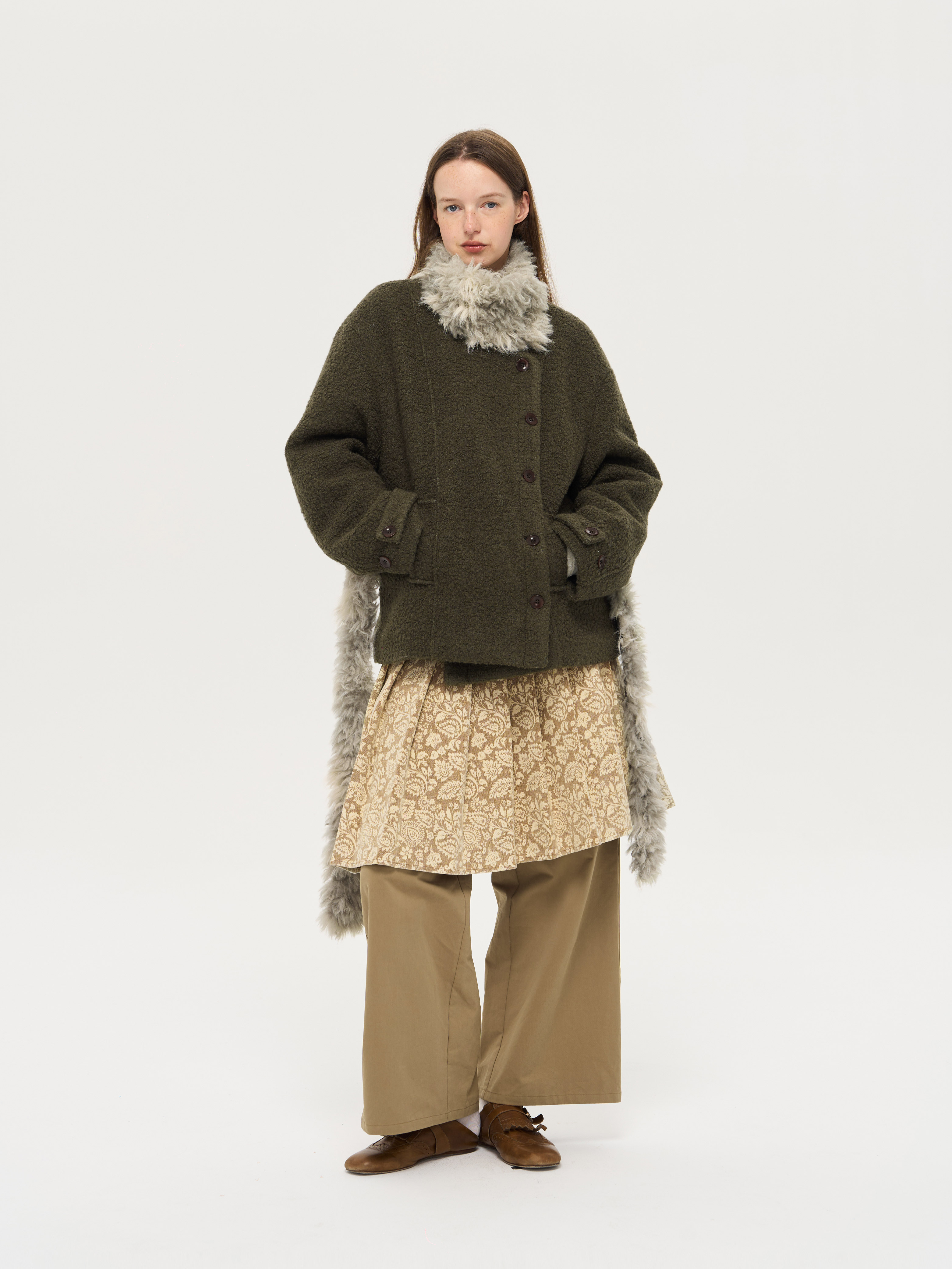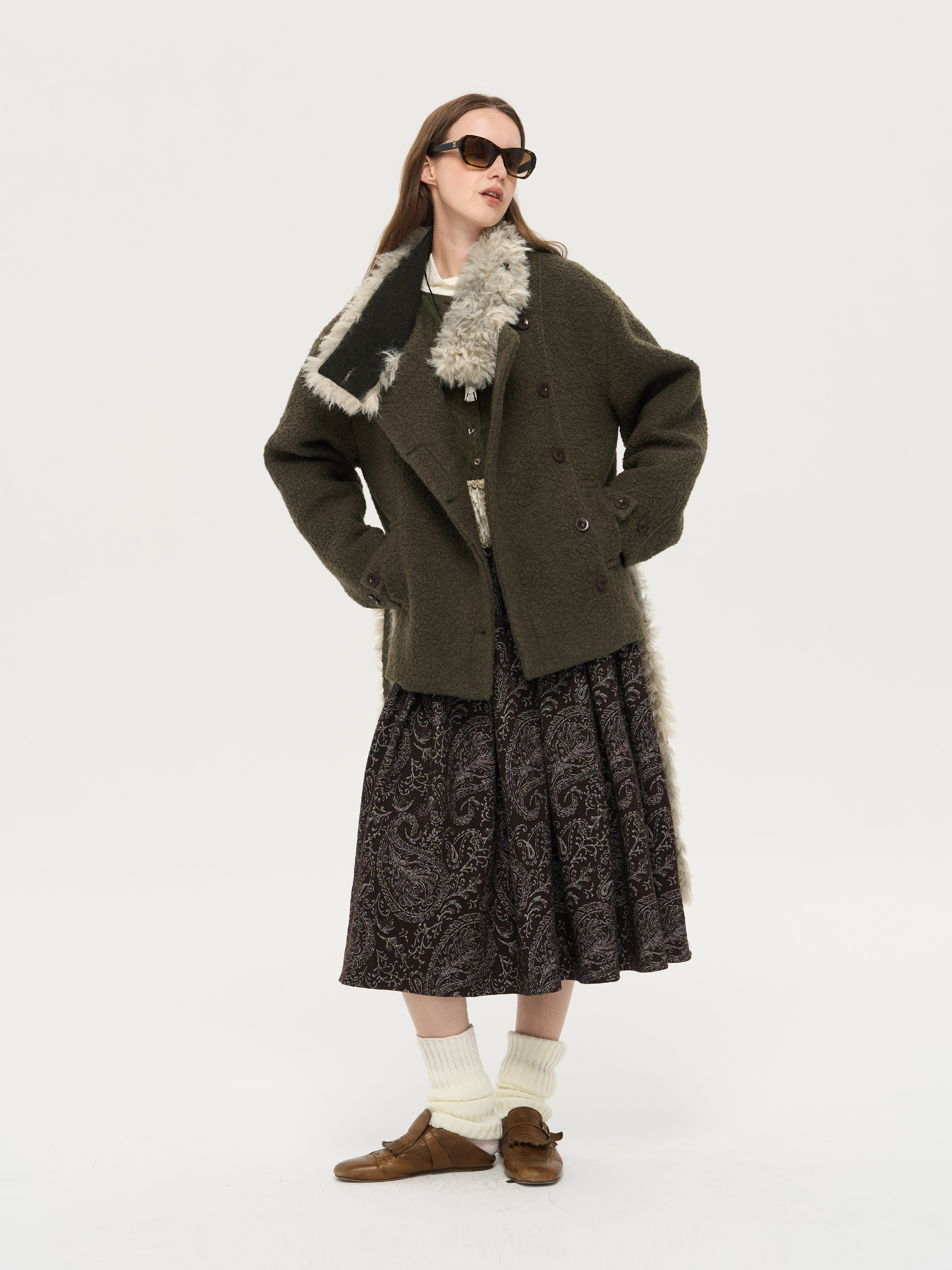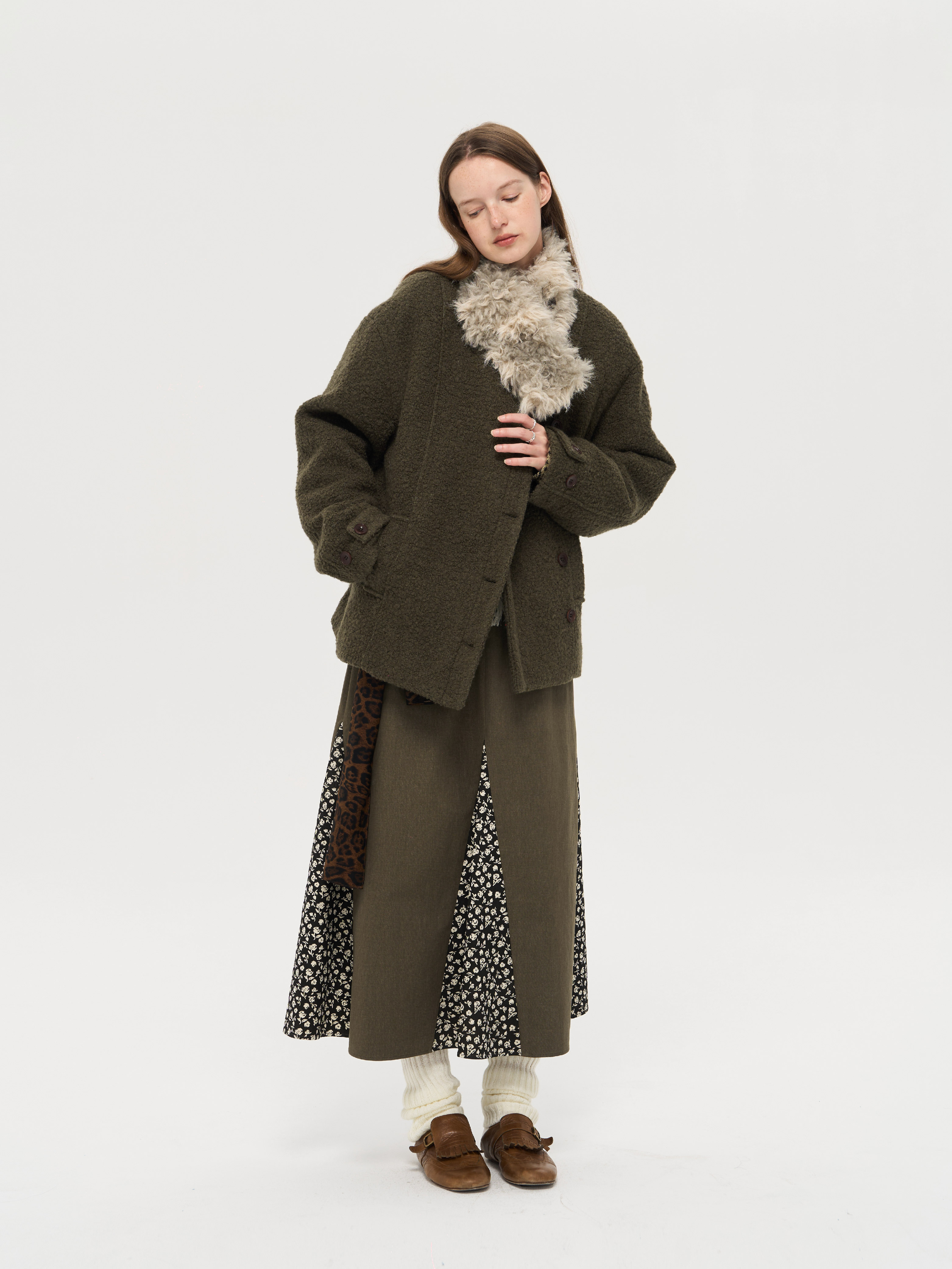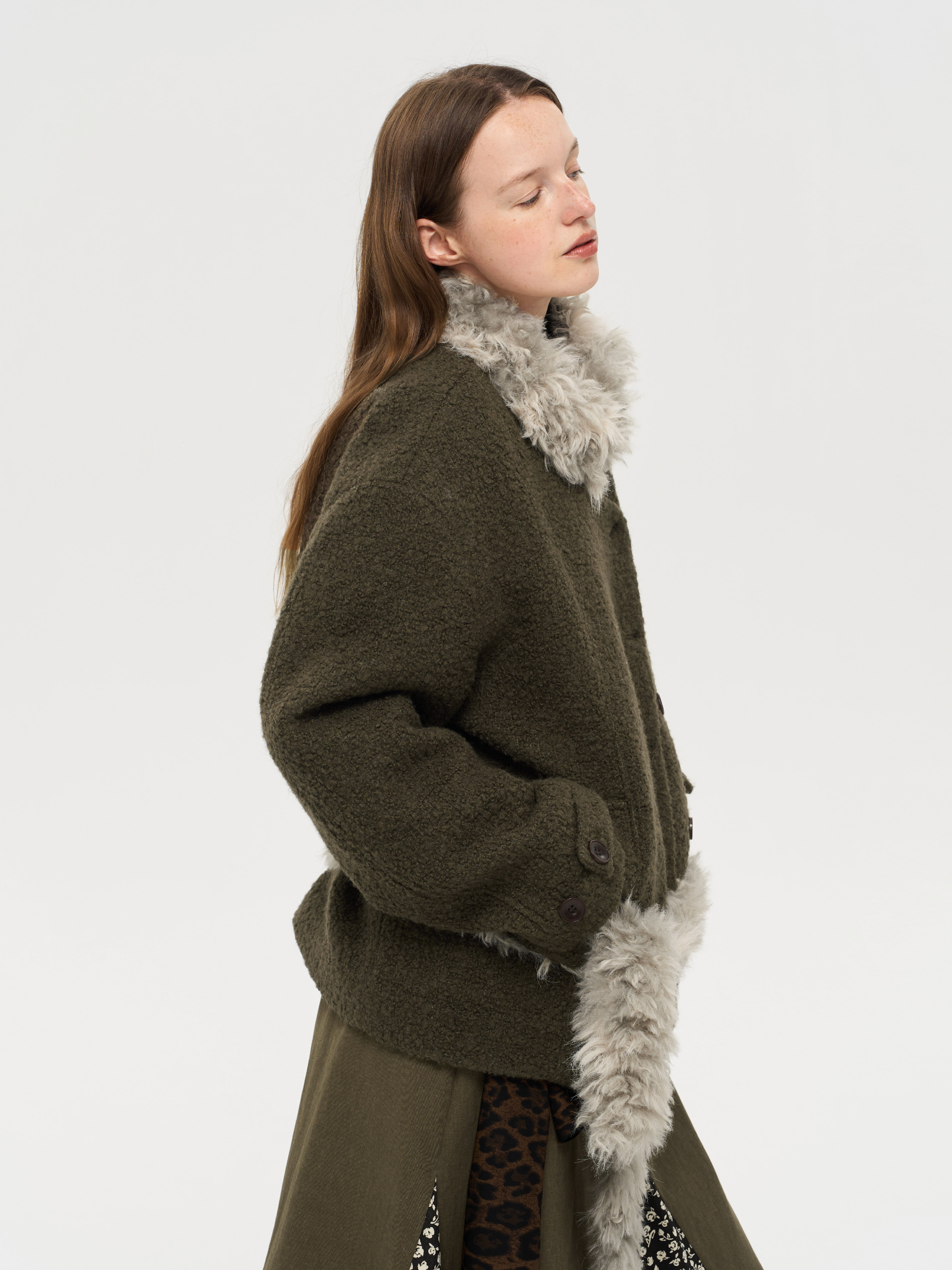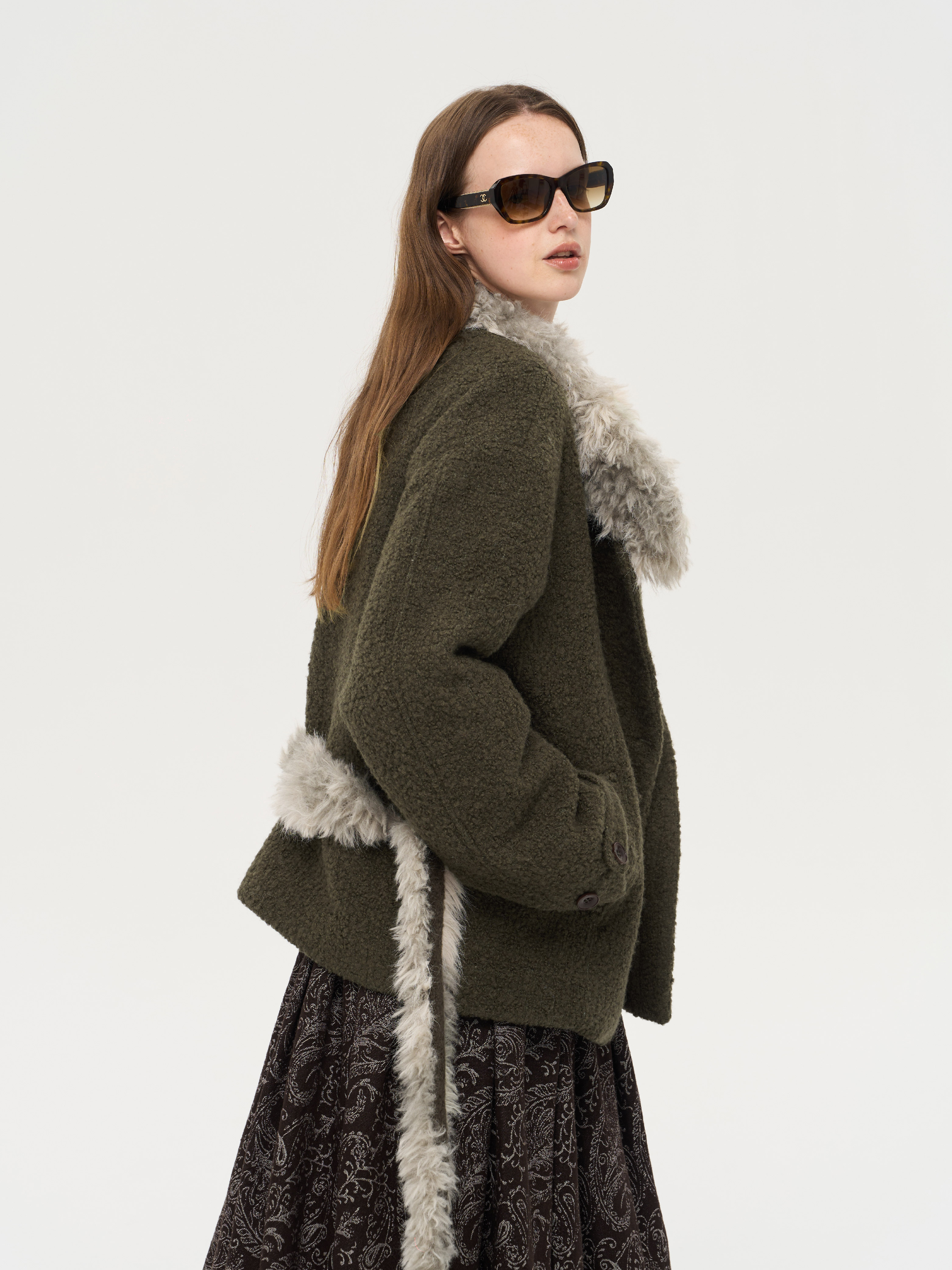local tag/lt25awk48/冬季西普 慕斯毛领夹棉温暖苔绿含羊毛呢大衣外套