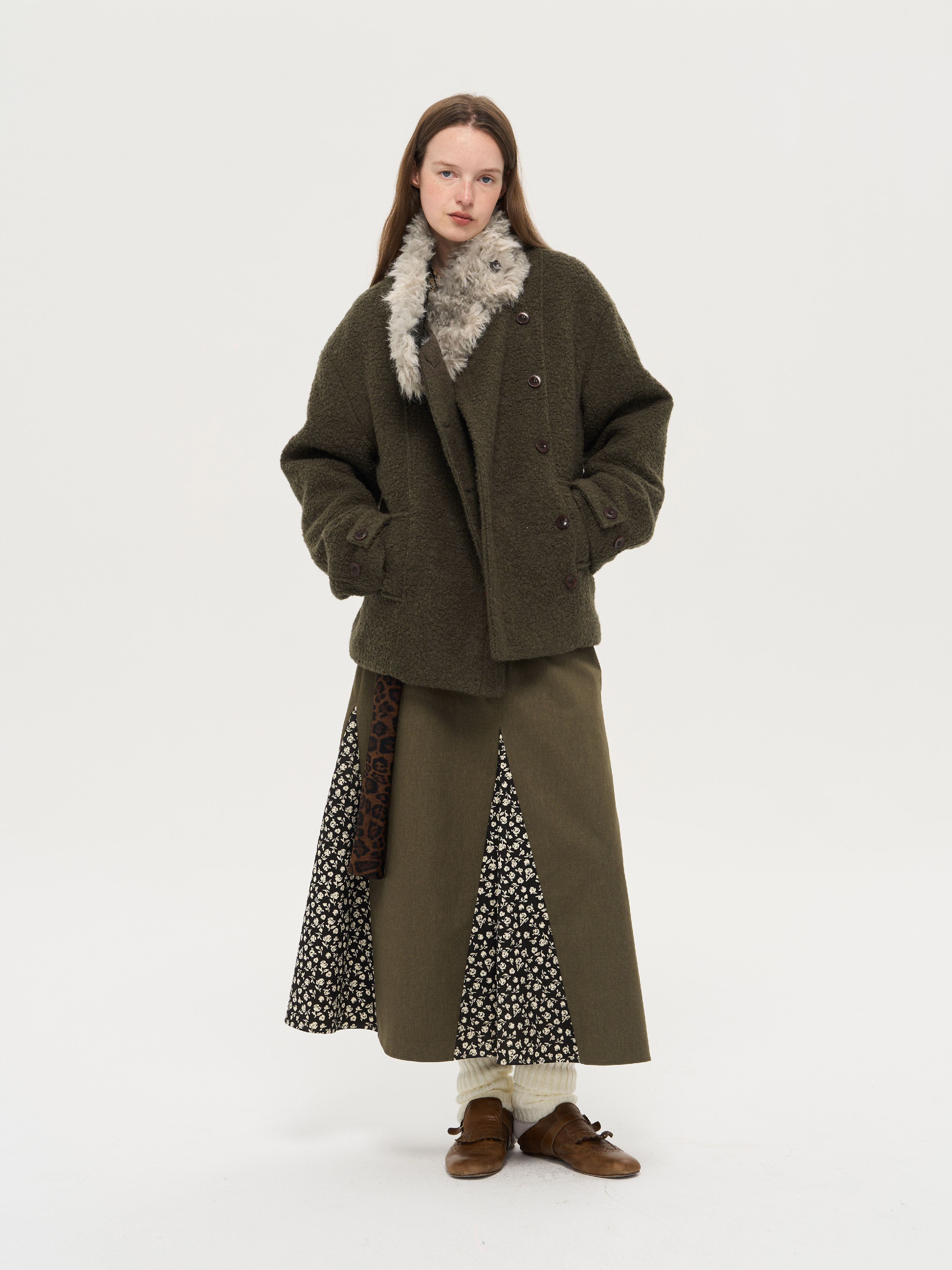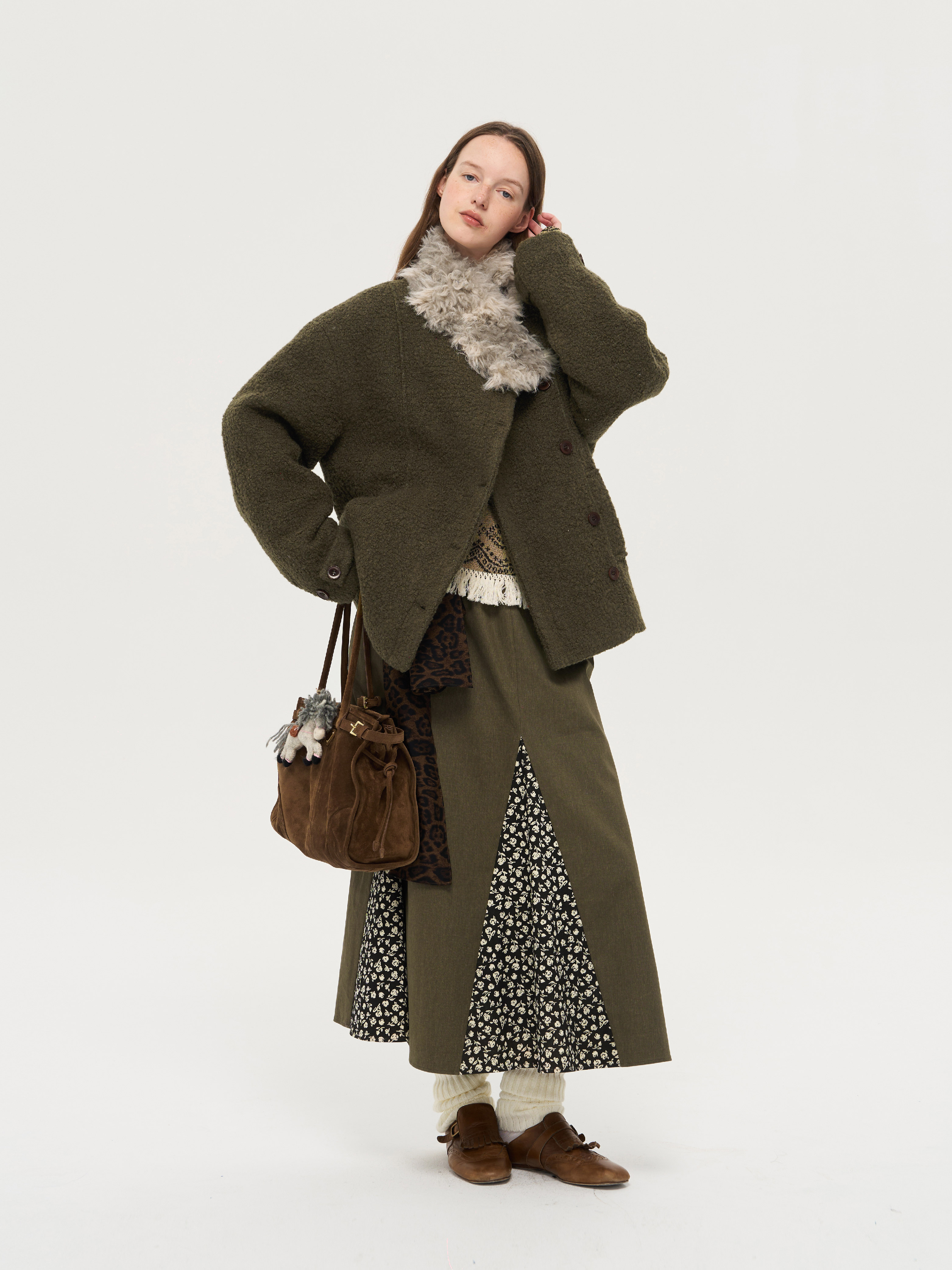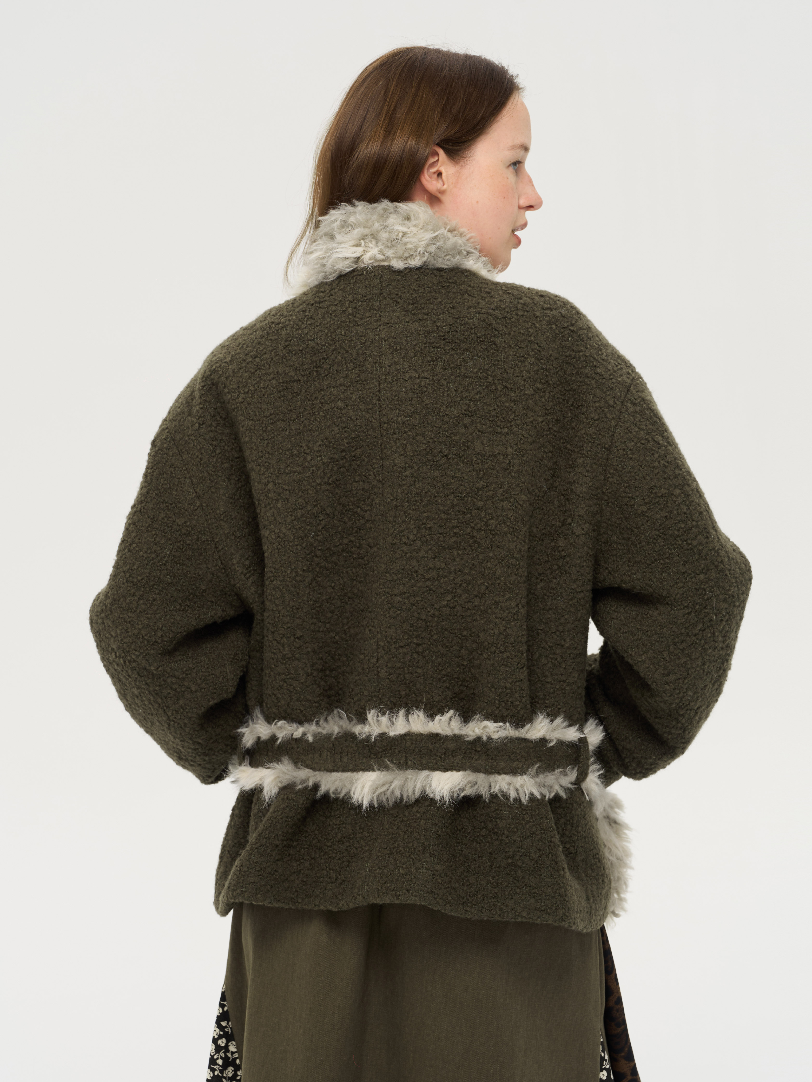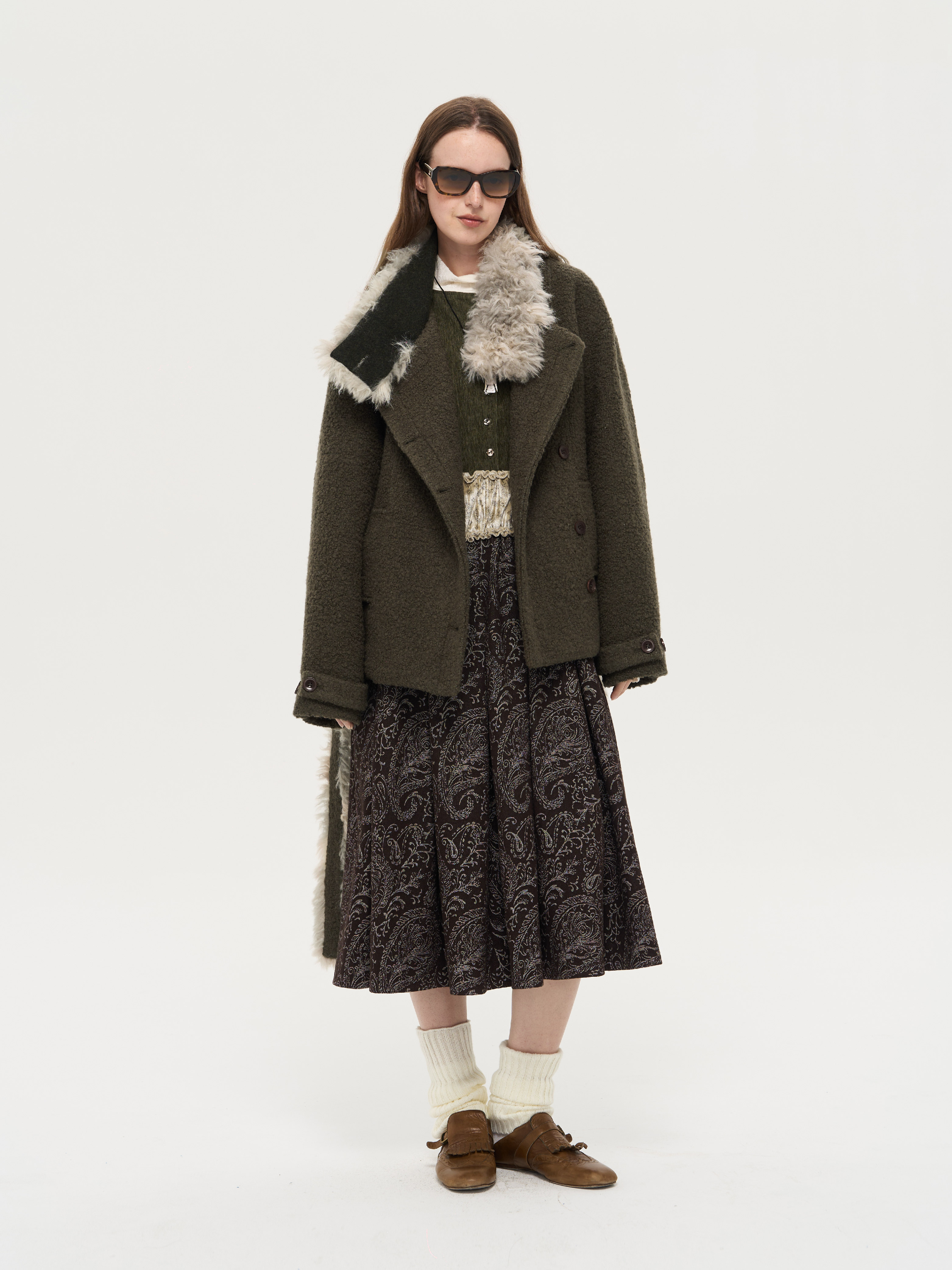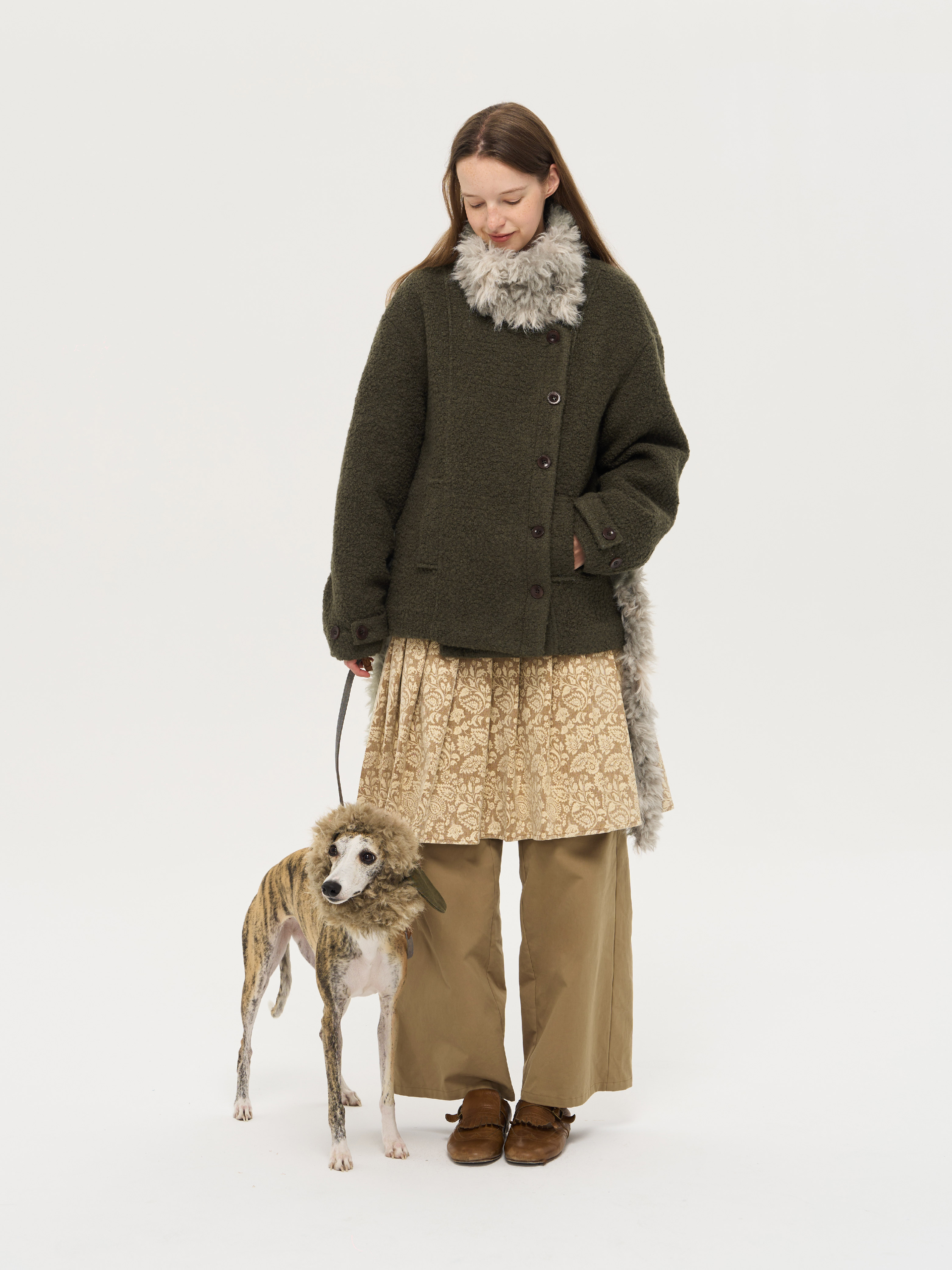 local tag/lt25awk48/冬季西普 慕斯毛领夹棉温暖苔绿含羊毛呢大衣外套