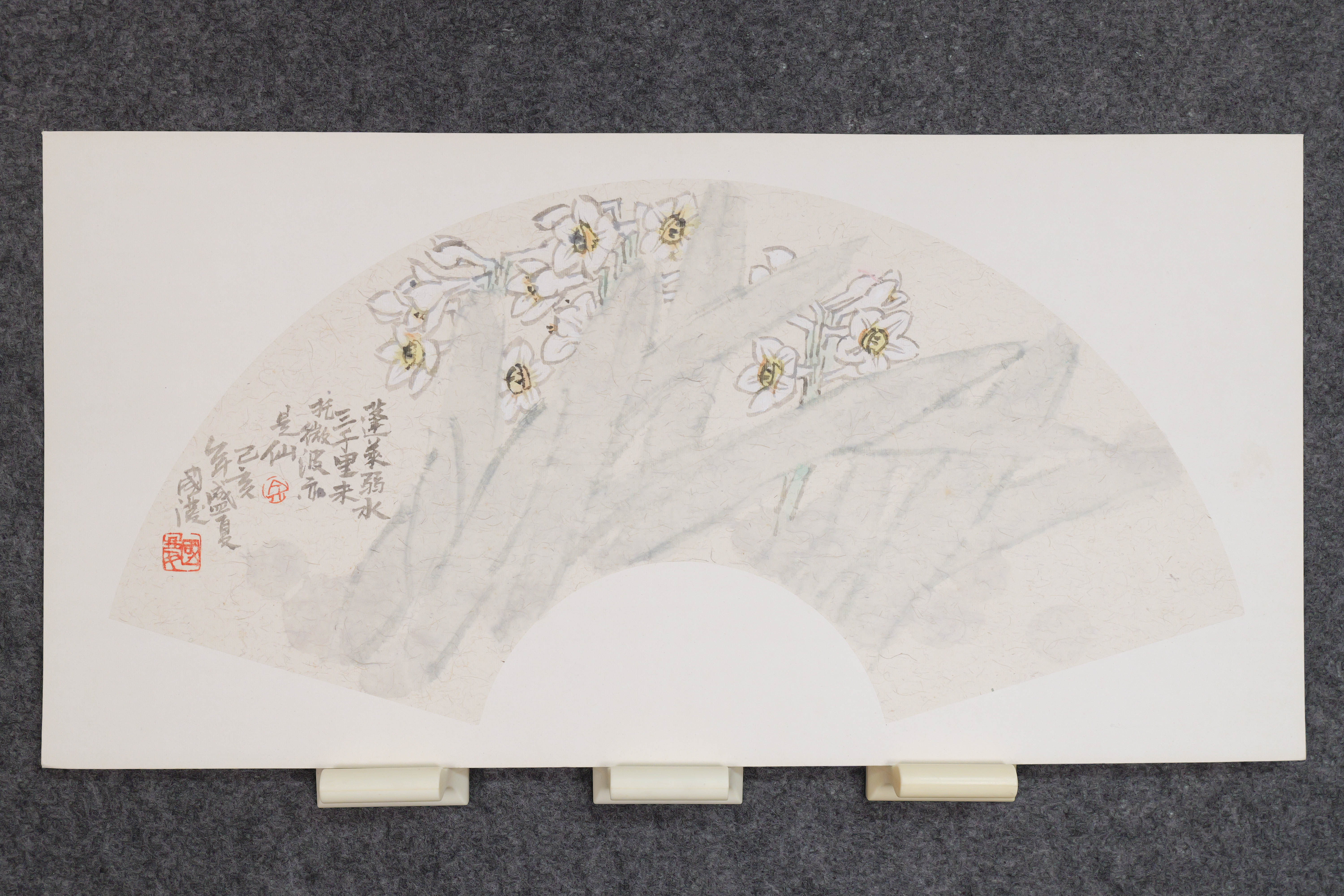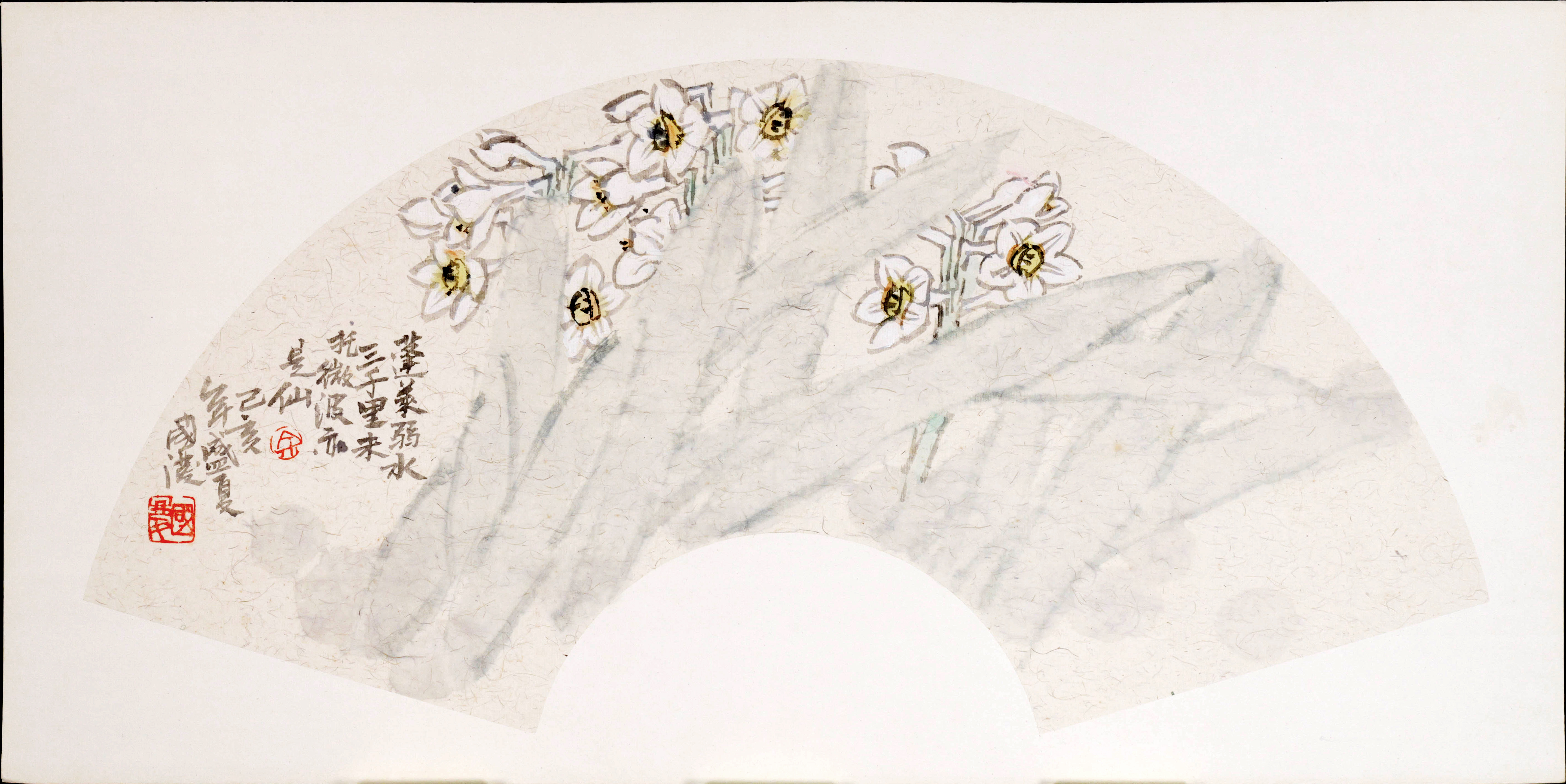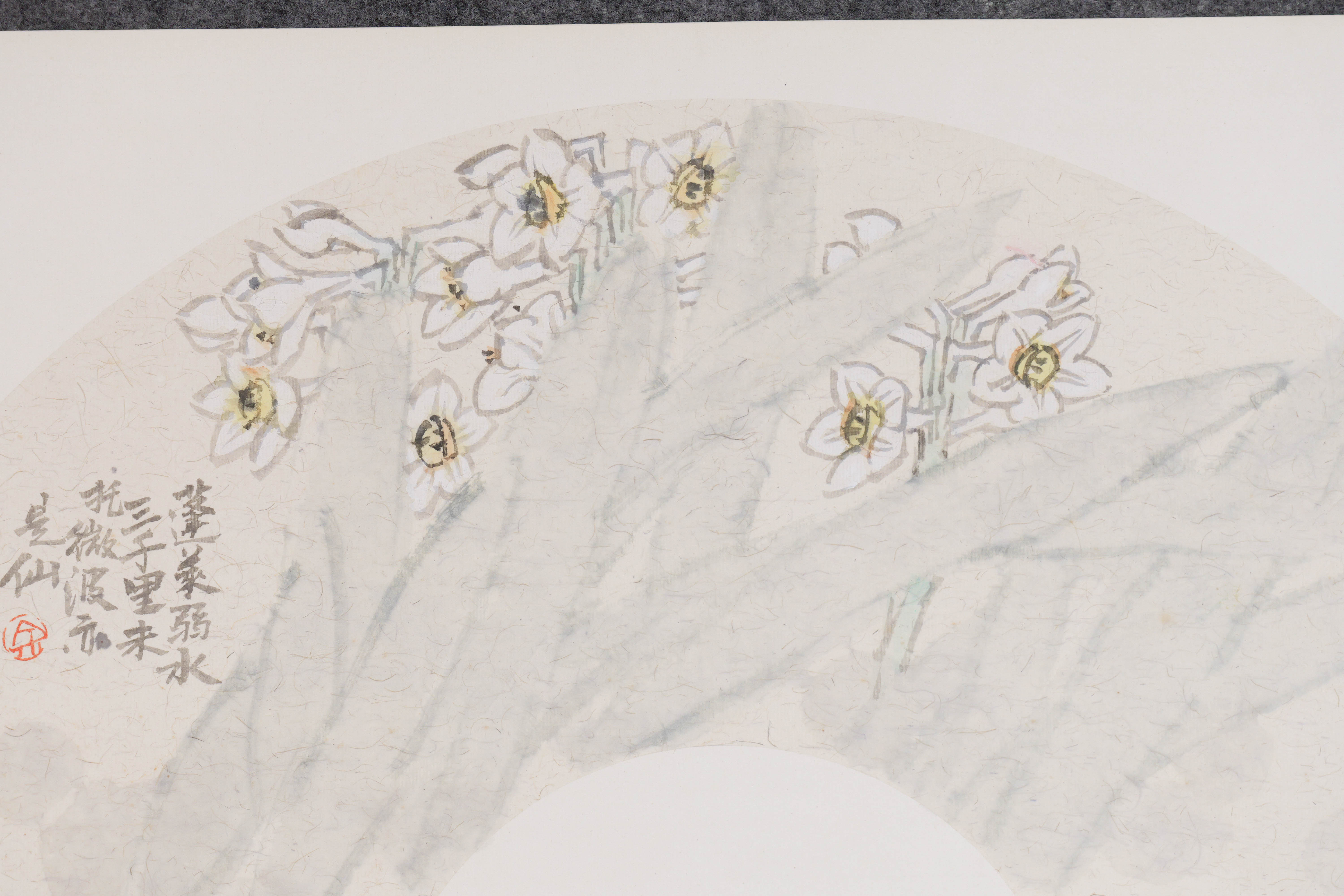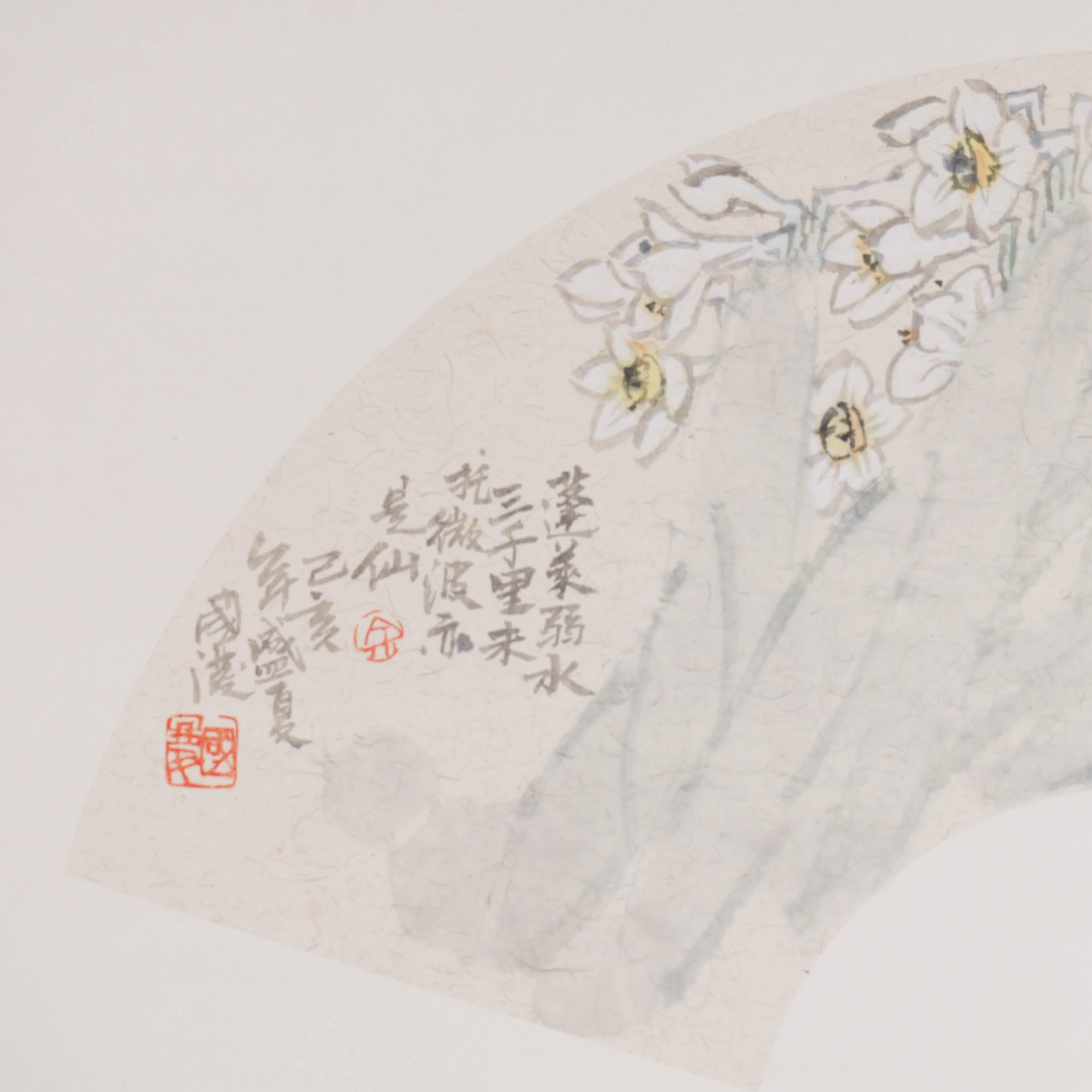 余国庆《蓬莱弱水三千里,未托微波亦是仙》原创国画30CM*60CM卡纸扇面花鸟