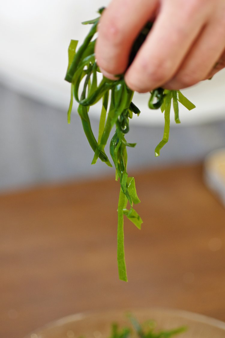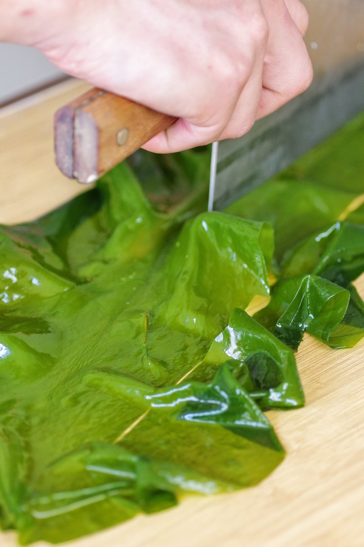 海带嫩芽冲洗掉表面的盐分后,放入碗中,静置泡发15分钟,捞出沥干切段。