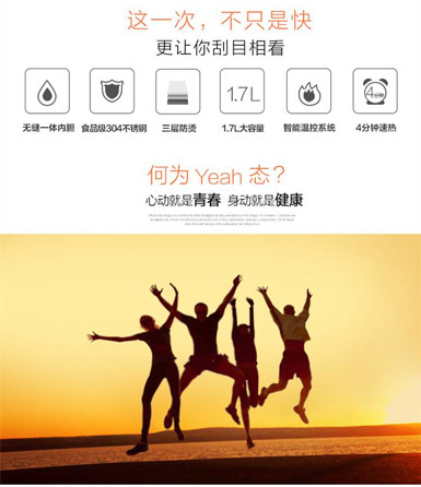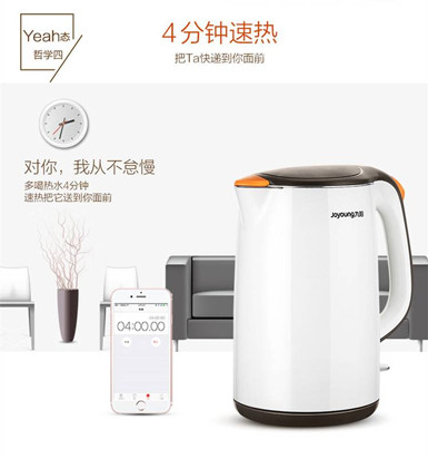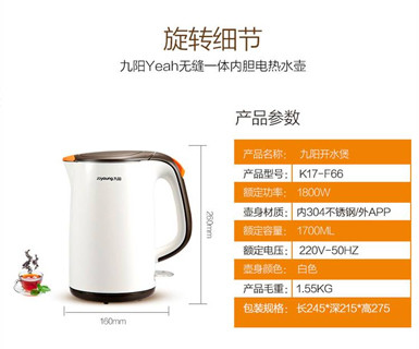 九阳(Joyoung) 电水壶1.7L 304不锈钢家用防烫热水壶K17-F66 白色