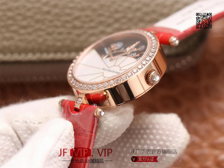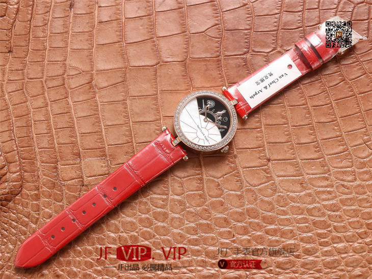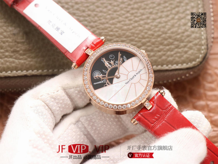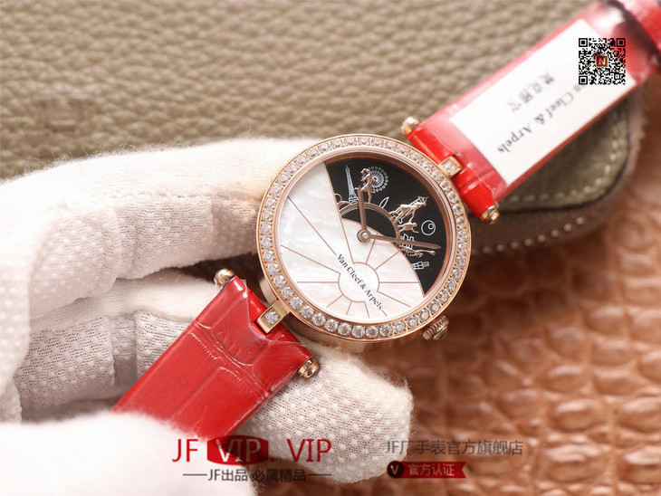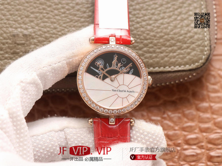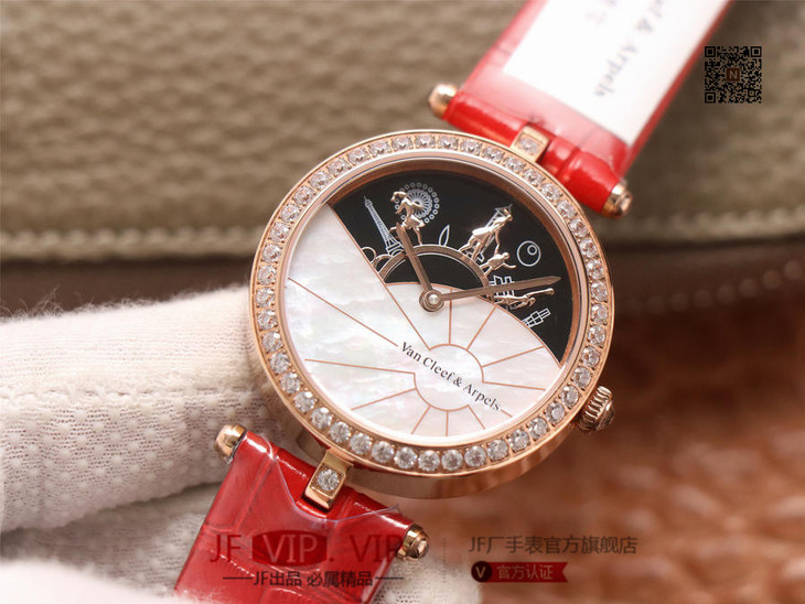 JW梵克雅宝诗意复杂功能系列(巴黎的一天),字面A盘由缟玛瑙跟CNC雕刻铜人打造,机械机芯,女士腕表,皮表带,自动机械机