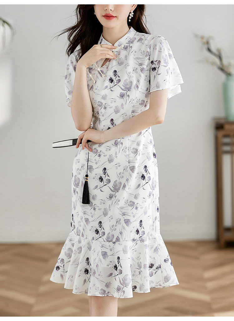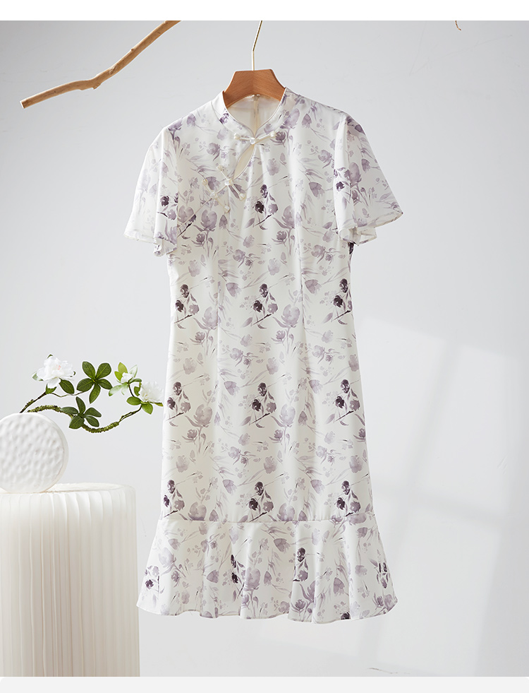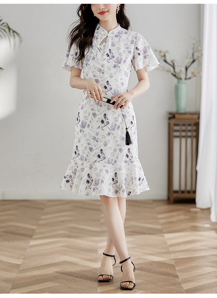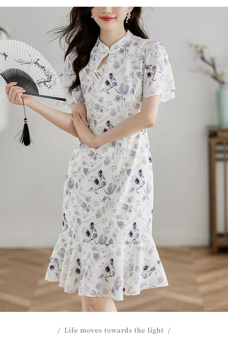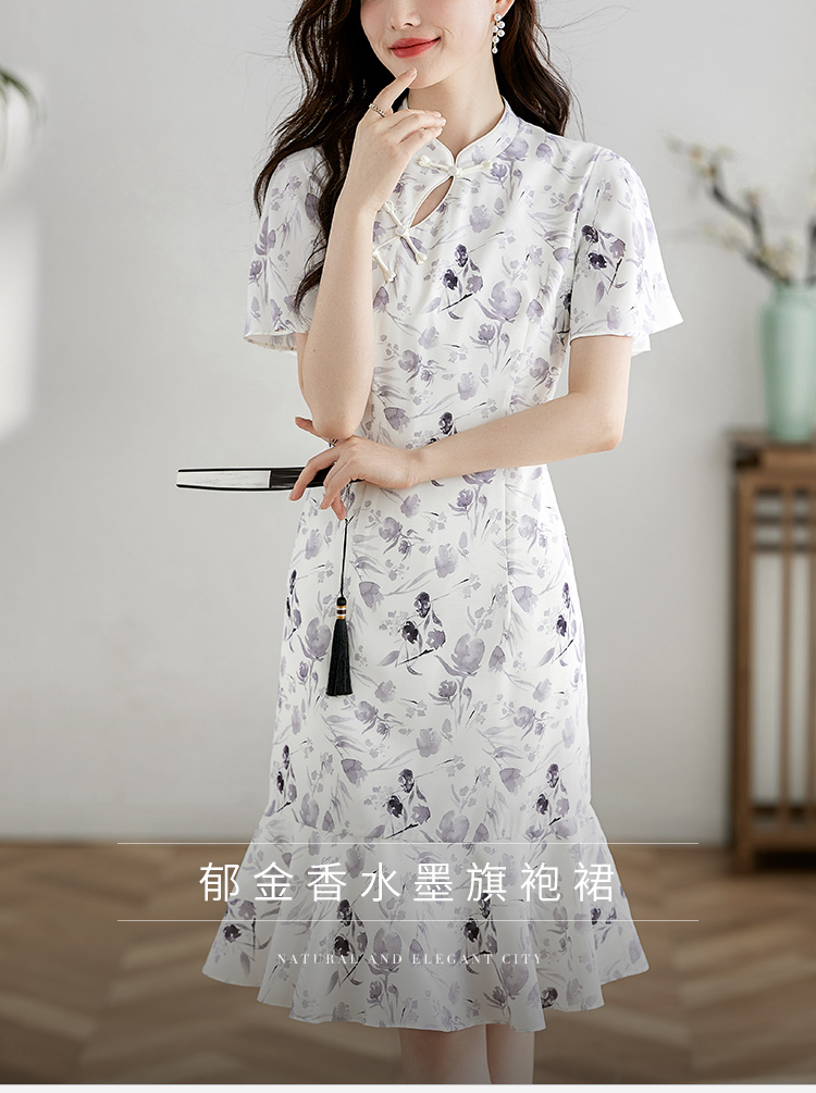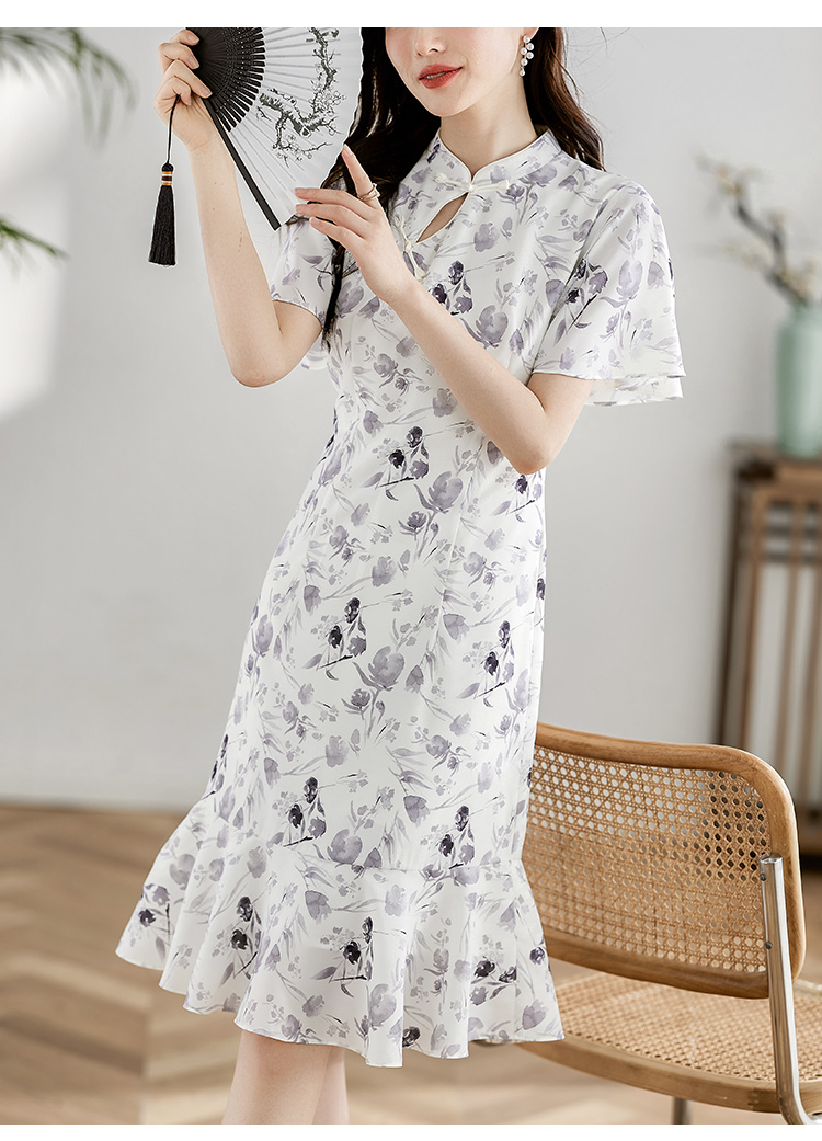 【专属特价】熙世界中国风水墨复古印花旗袍改良裙子女夏季新中式荷叶边连衣裙