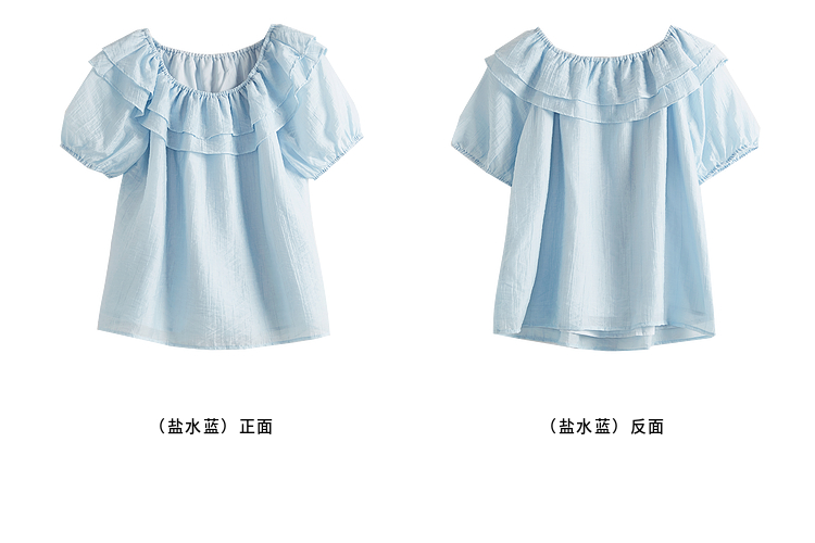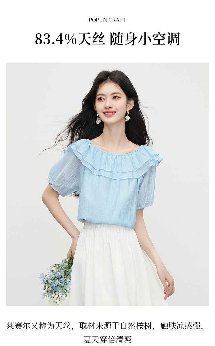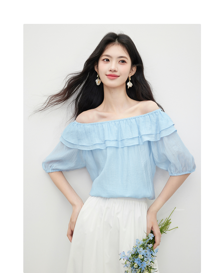 【07/09新品】熙世界淡人系荷叶边天丝衬衫女高级感短袖一字肩上衣2025夏季新款