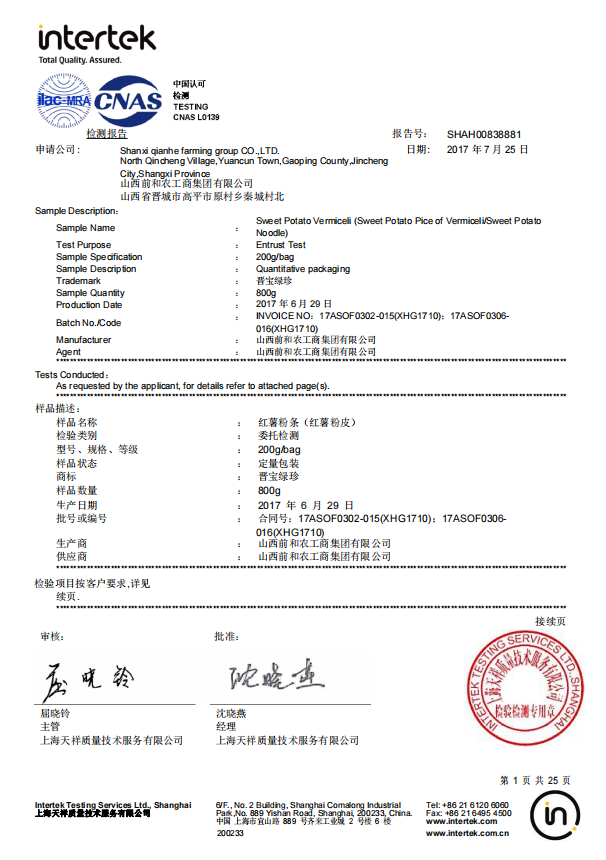 粉条系列产品先后通过了中国、欧盟、美国三大标准体系的有机认证,经英国ITS检测,重金属、农残含量均为ND