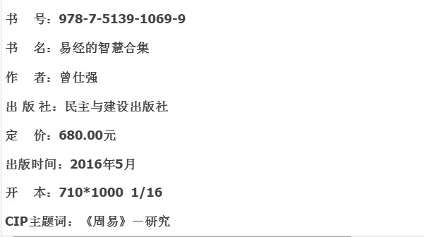 《易经的智慧5:从决所当决到处丰之道》:是《易经的智慧》系列图书的第五部,本书所讲为《易经·下经》中的夬、姤、萃、升、困、井、革、鼎、震、艮、渐、归妹、丰共13个卦。涉及易理包括决所当决、不期而遇、聚合之道、适时上升、处困之道、不变而通、革新之道、礼贤下士、奋发警醒、止其所止、循序渐进、知弊永终、求丰保丰等等内容。
