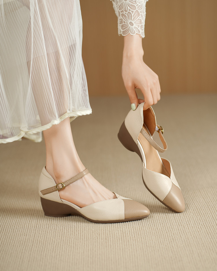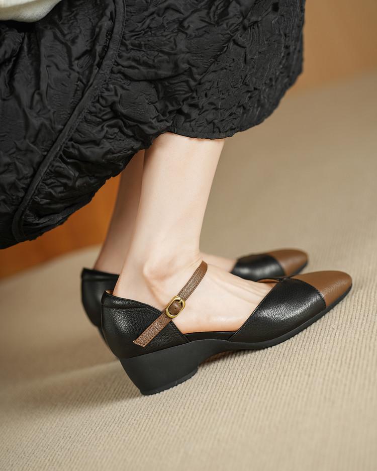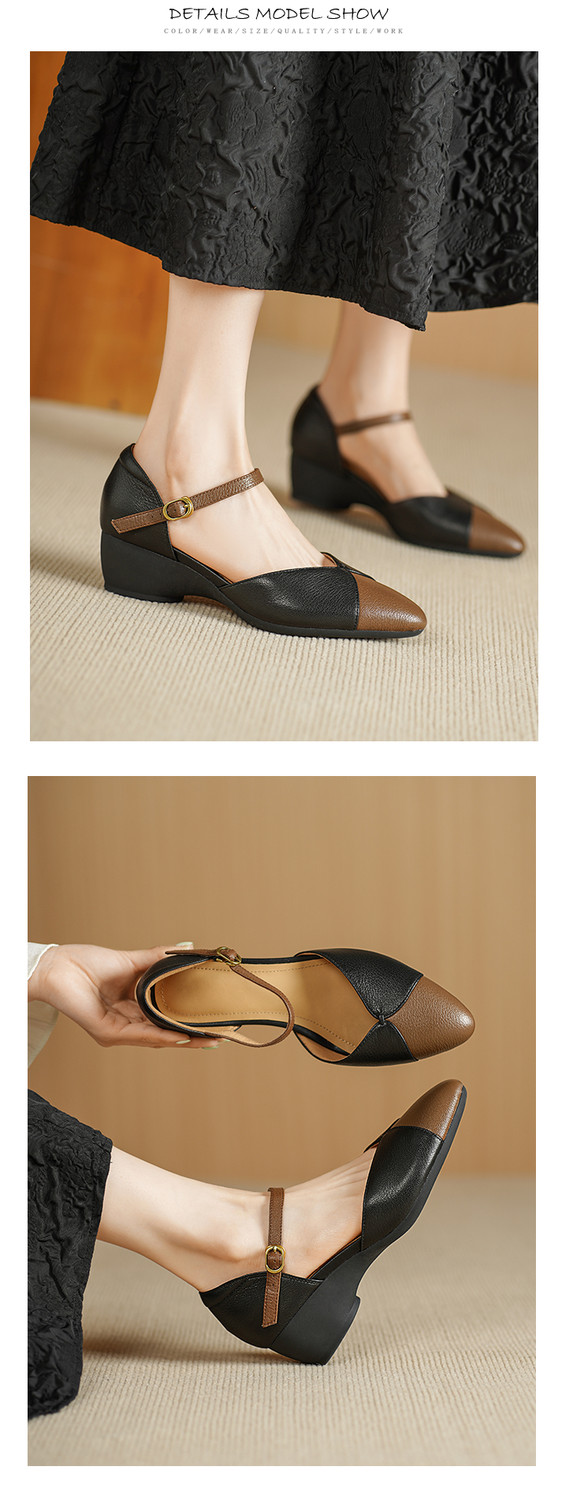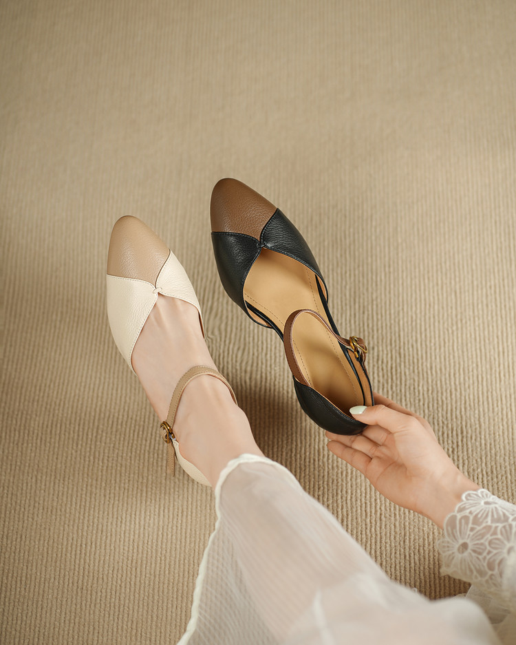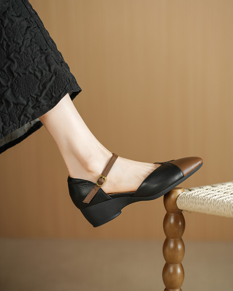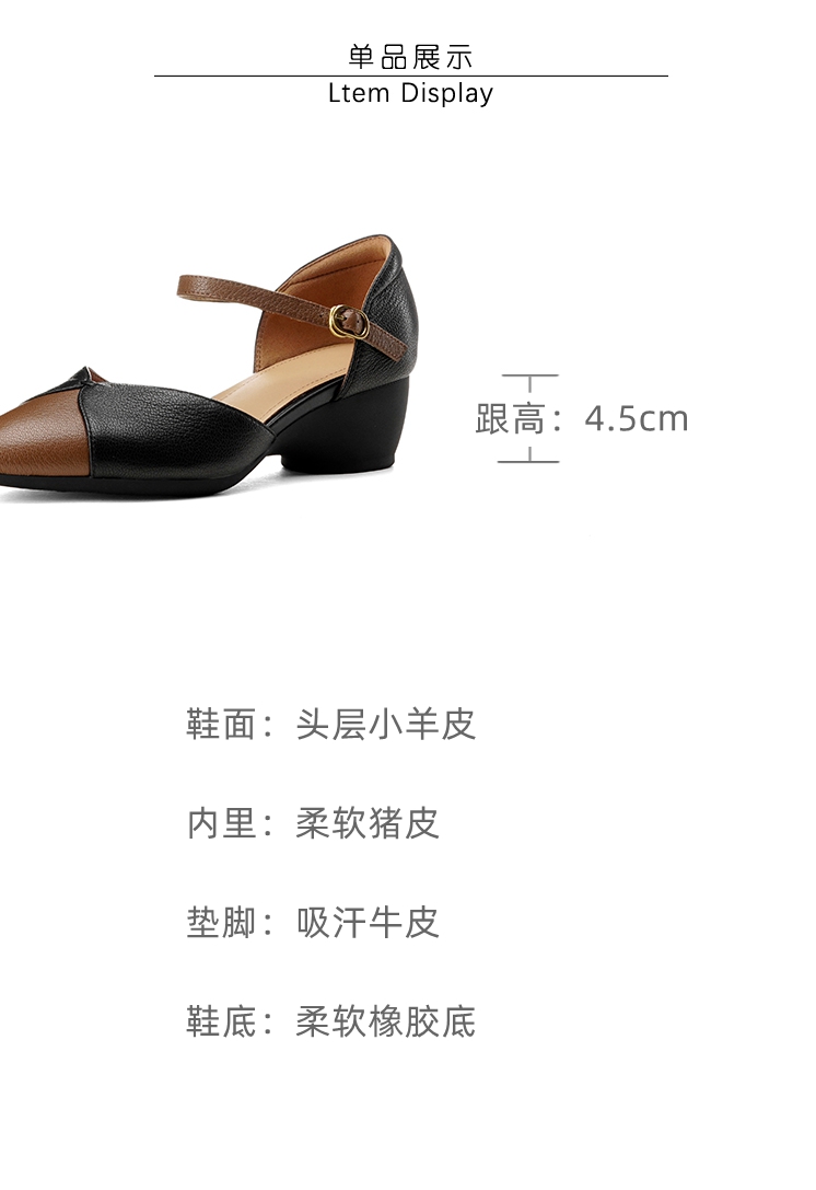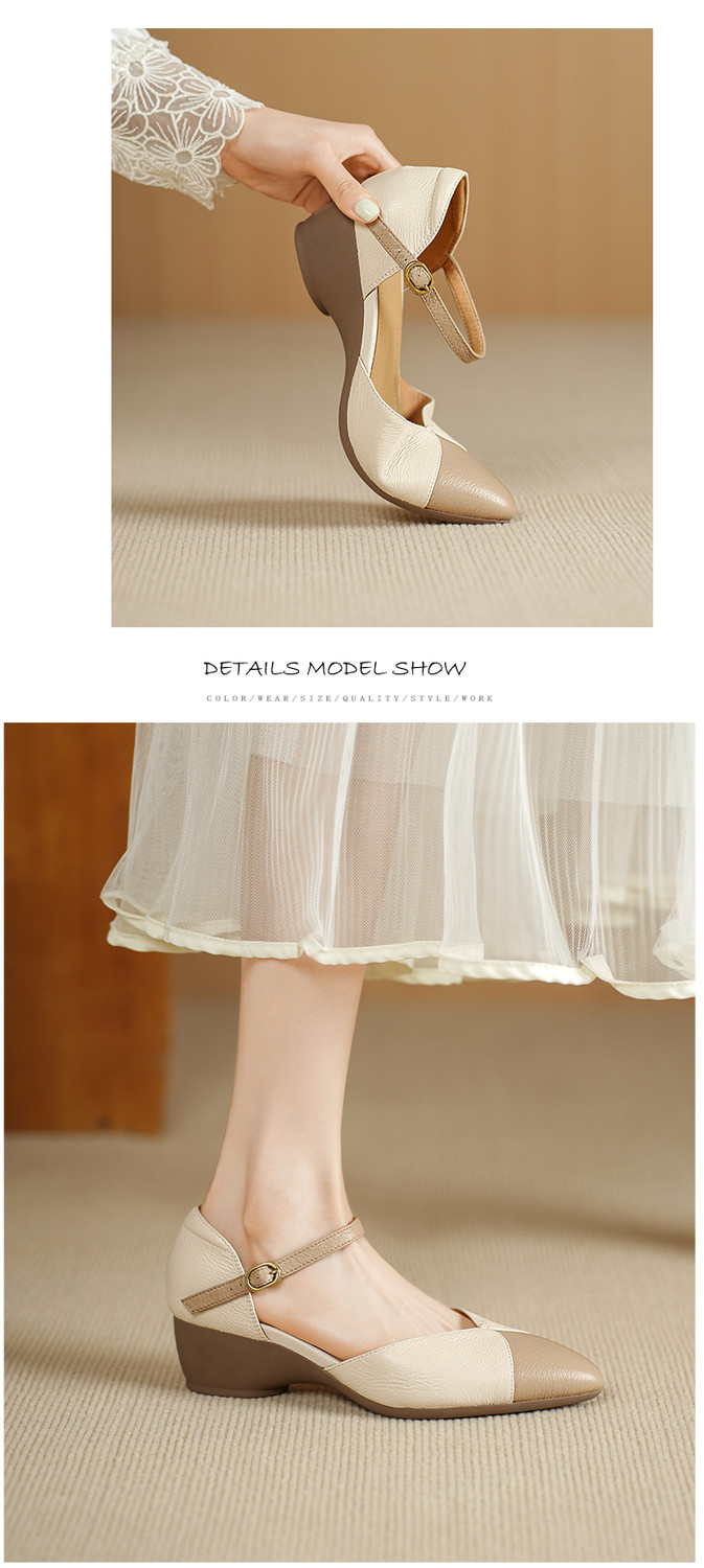【预售5天】巨好搭~复古软羊皮坡跟包头凉鞋女夏季新款尖头拼色中空单鞋DTN&527-6