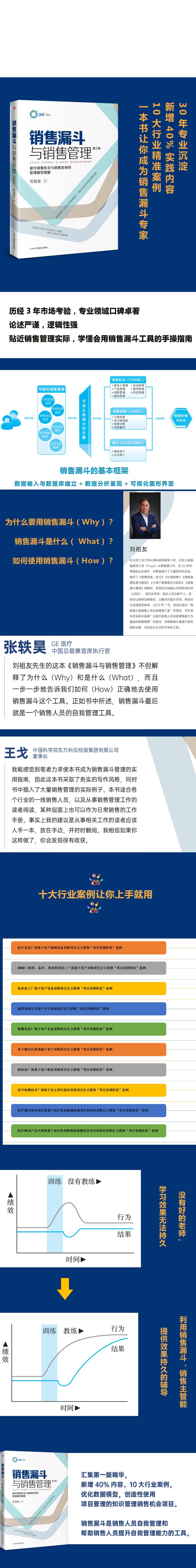 本书从对销售职业特点的分析开始,层层递进最终明确了销售漏斗的定位:“销售漏斗是销售人员自我管理和帮助销售人员提升自我管理能力的工具”;重点介绍销售漏斗的整个建立过程,并提出了一个关键定义:“签单”;给出了建立数据呈现模型和图示化界面的基本知识,并通过真实案例的展示,介绍了如何应用销售漏斗所产生的各类数据来对业务状况进行分析评估。三个层面使用者与销售漏斗应用成败的关系:“销售人员真正愿意使用,是销售漏斗建立的基础;营销主管当好伙伴教练,是销售漏斗实施的关键;领导层的决心和使用方法,决定销售漏斗的有效性”。工具是人们设计又反过来供人们使用,帮助人们提升工作效率的。所有使用这一工具的参与者的正确定位和使用态度决定了这一工具的有效性!