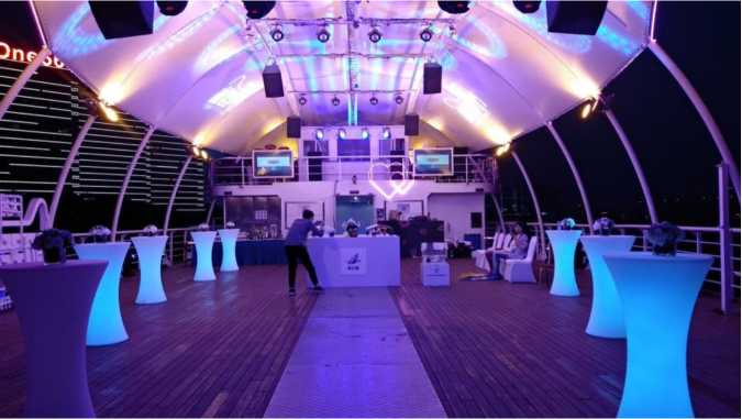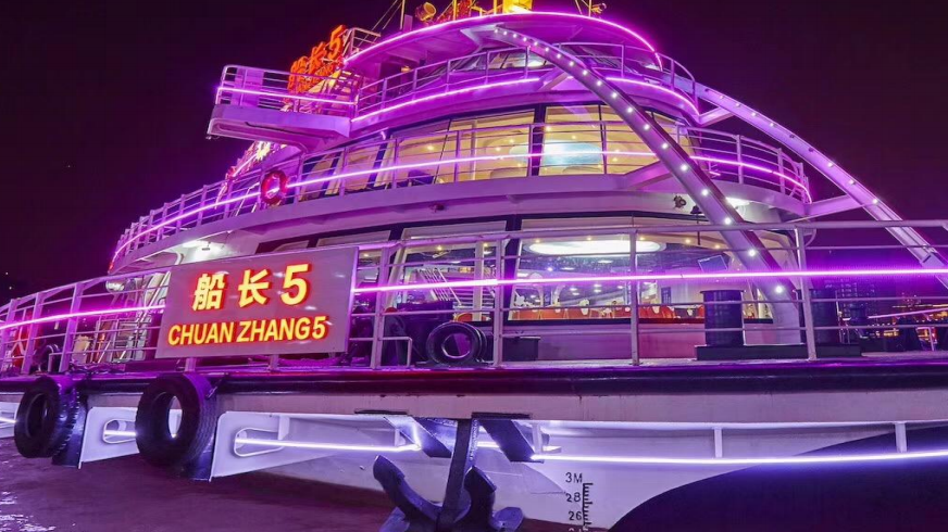这里是欢乐与热闹的集结地、载满一个个愿望,驶向新的一年,船长5号共3层,1、2层为舱室,2层设有豪华的VIP包厢,3层为豪华大平台,黄浦江上面积比较大的甲板空间。仿制新世纪太空堡垒的半圆形外观,醒目的UFO设计,加上彩灯和喷雾制造的亦梦亦幻的视觉效果。