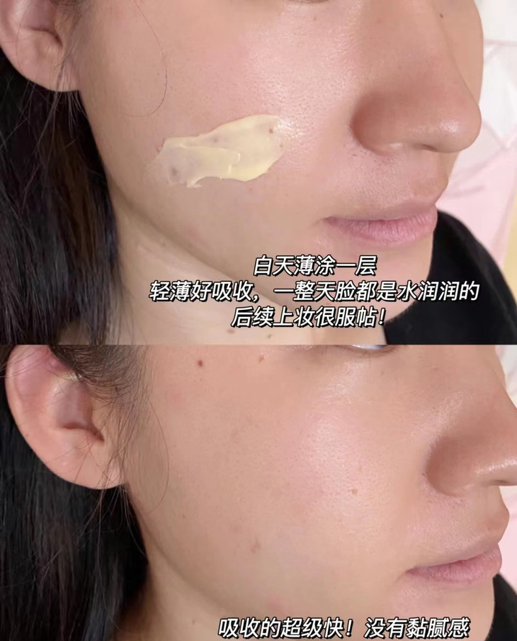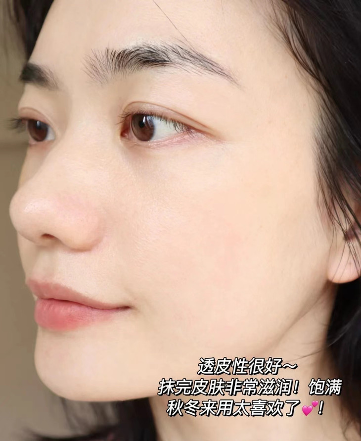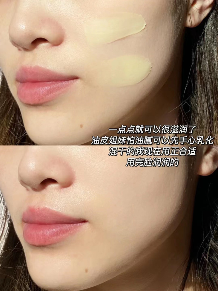 原本干燥无光泽的脸颊 涂抹臻润级珍珠膏后 瞬间水润嘭弹,好比敷了面膜,细腻有光泽😍 上妆不卡粉了、妆容很服帖