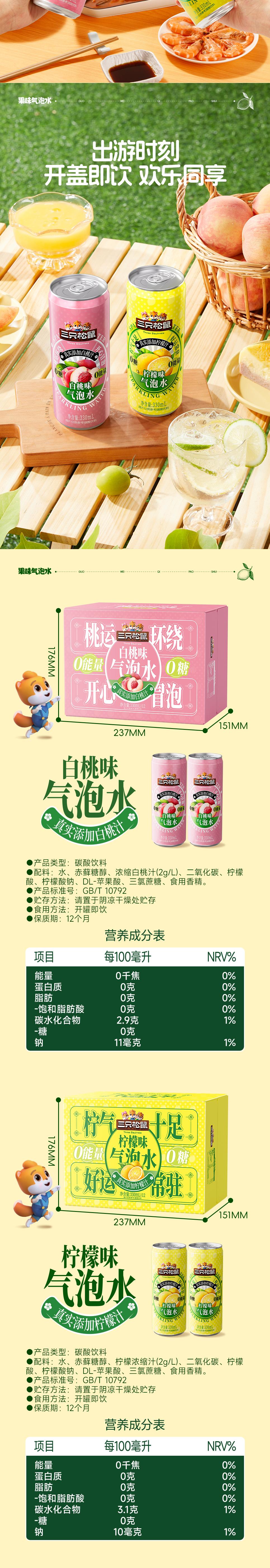 【会员积分兑换】 气泡水系列 柠檬味/白桃味气泡水330ml*12瓶整箱装