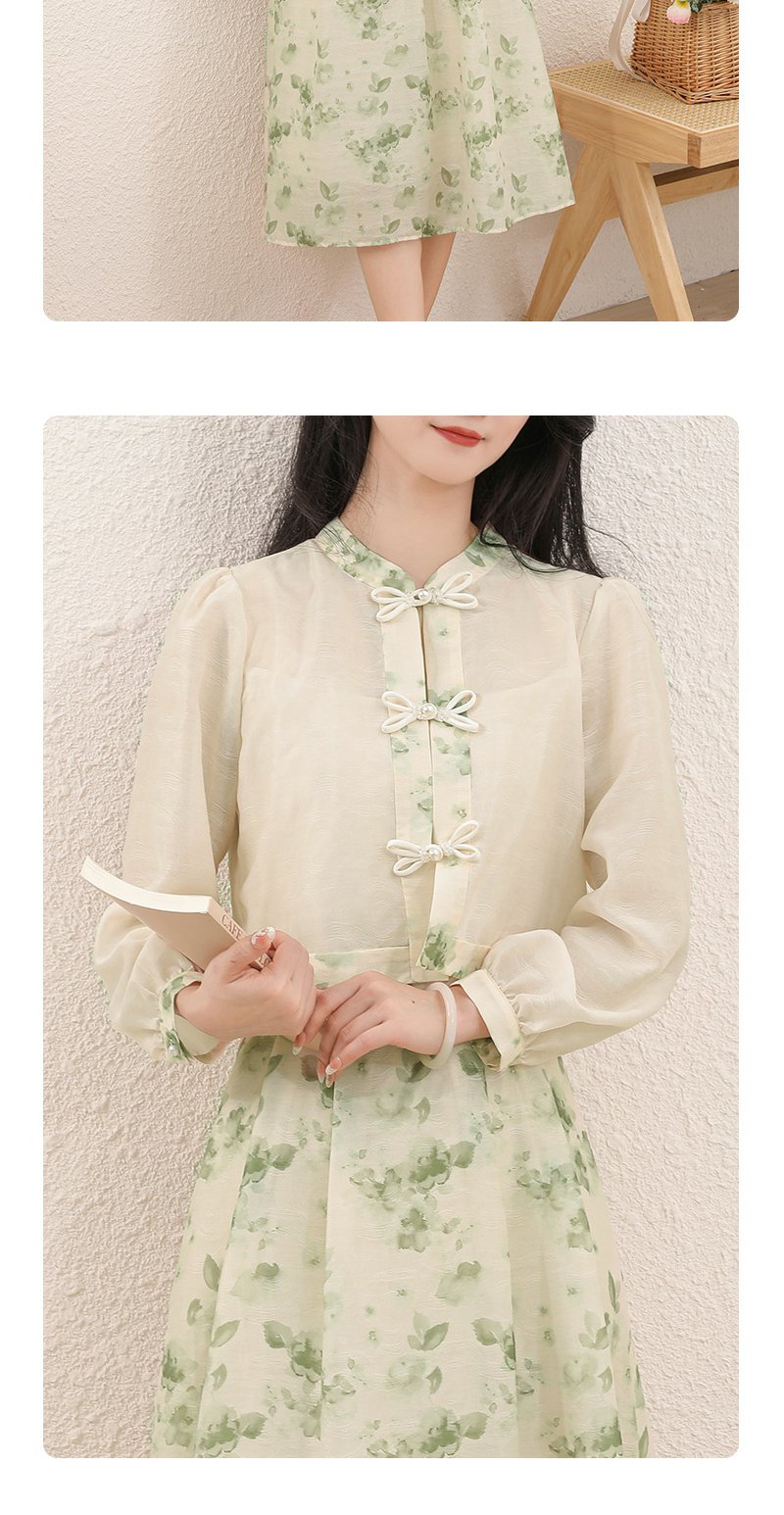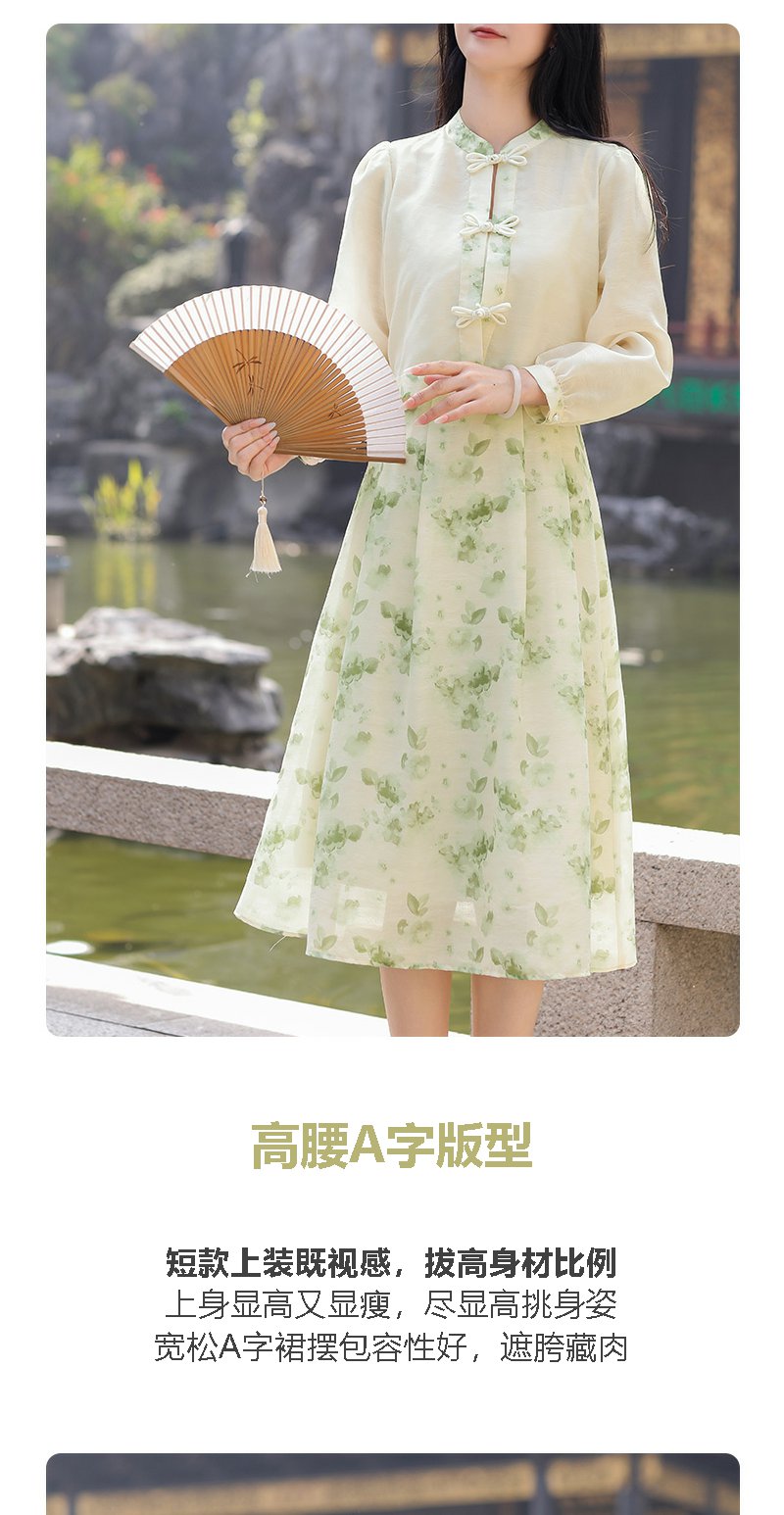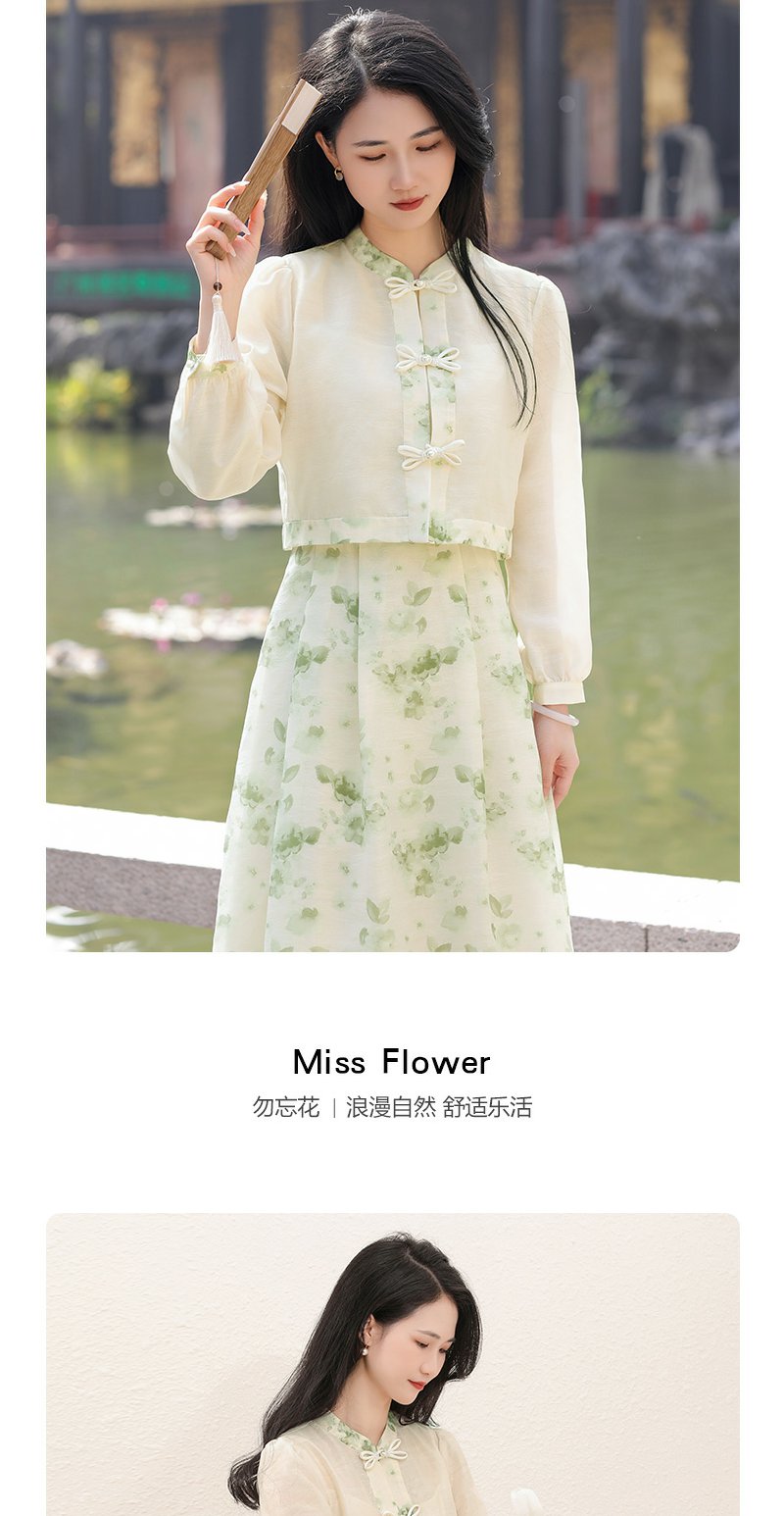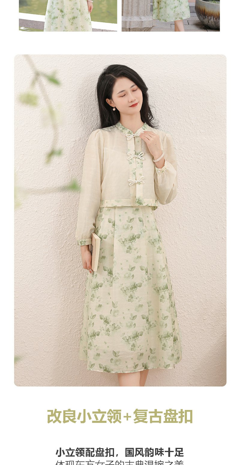 勿忘花绿色复古假两件改良旗袍连衣裙春季新款中式国风裙子