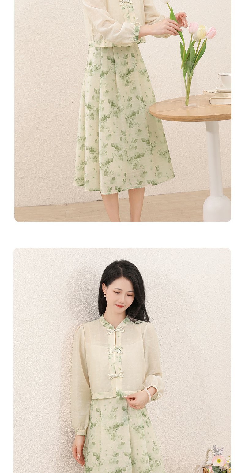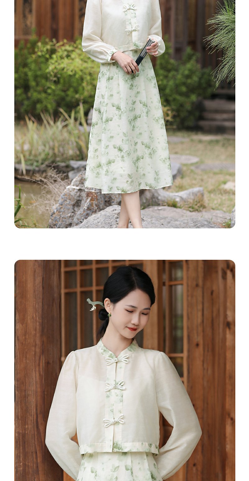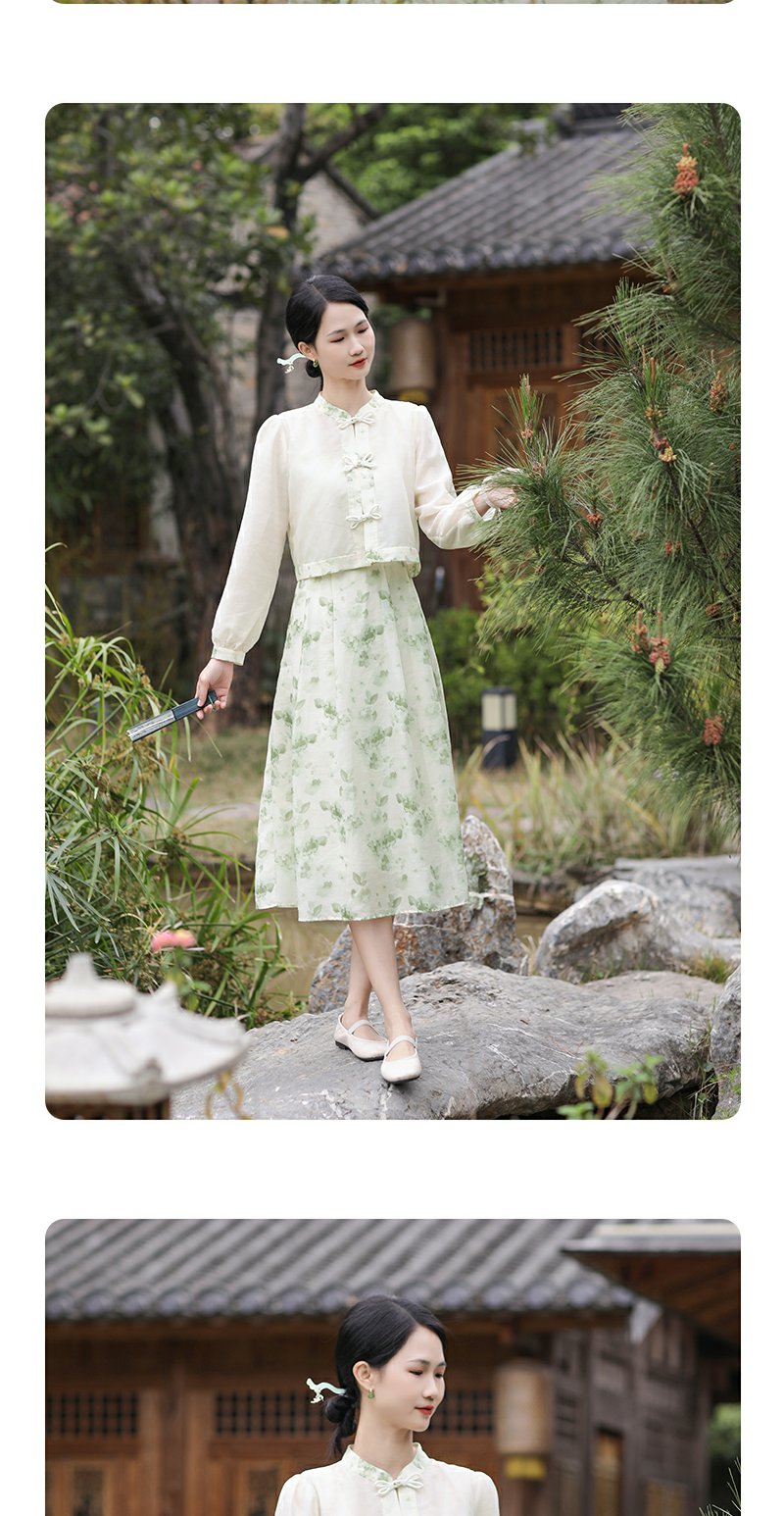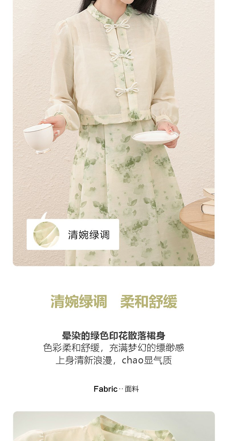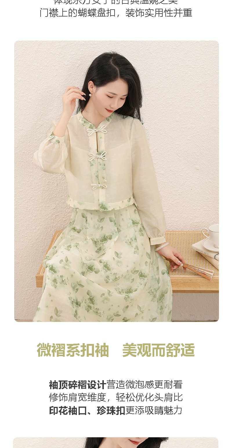 勿忘花绿色复古假两件改良旗袍连衣裙春季新款中式国风裙子